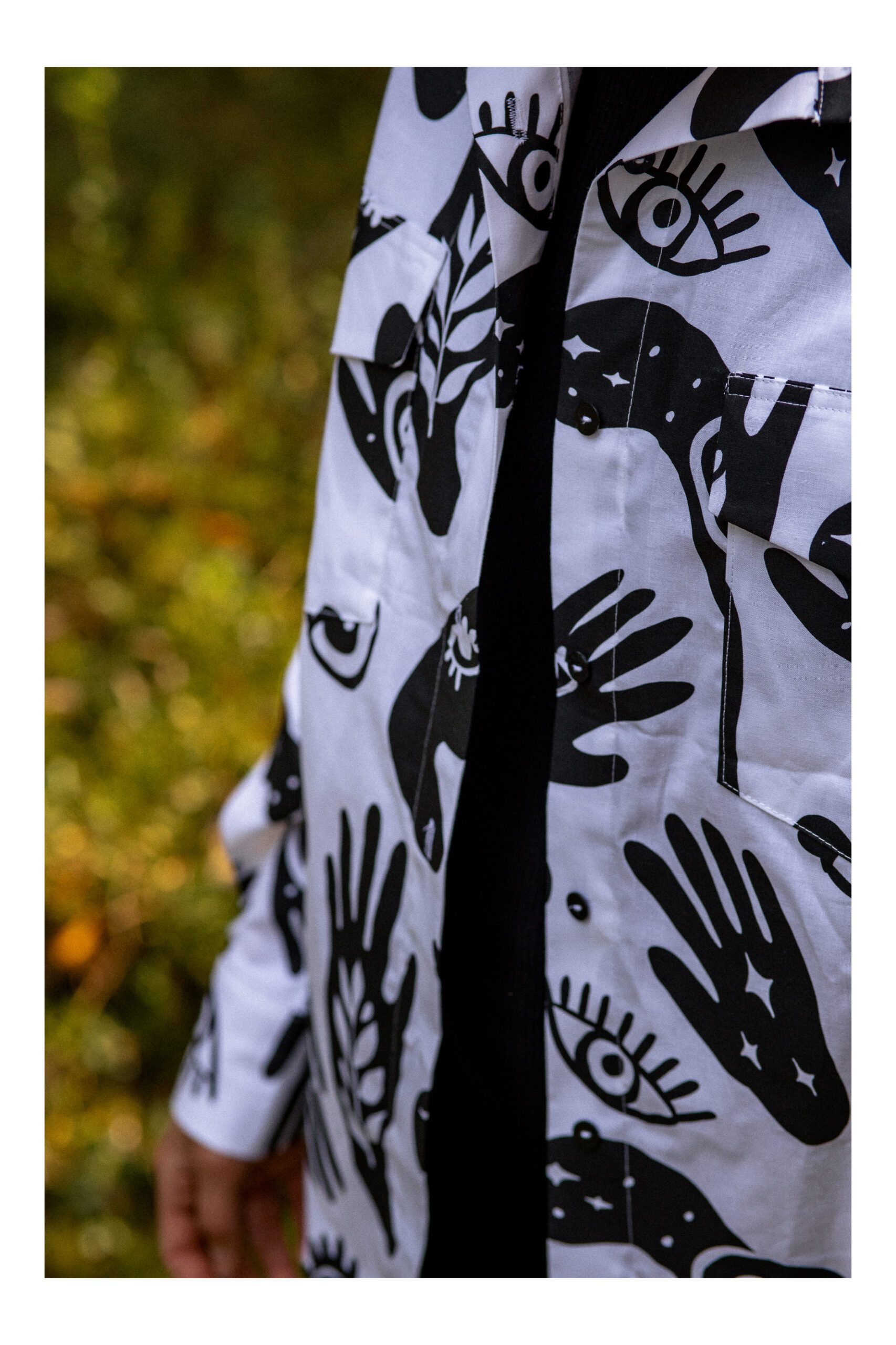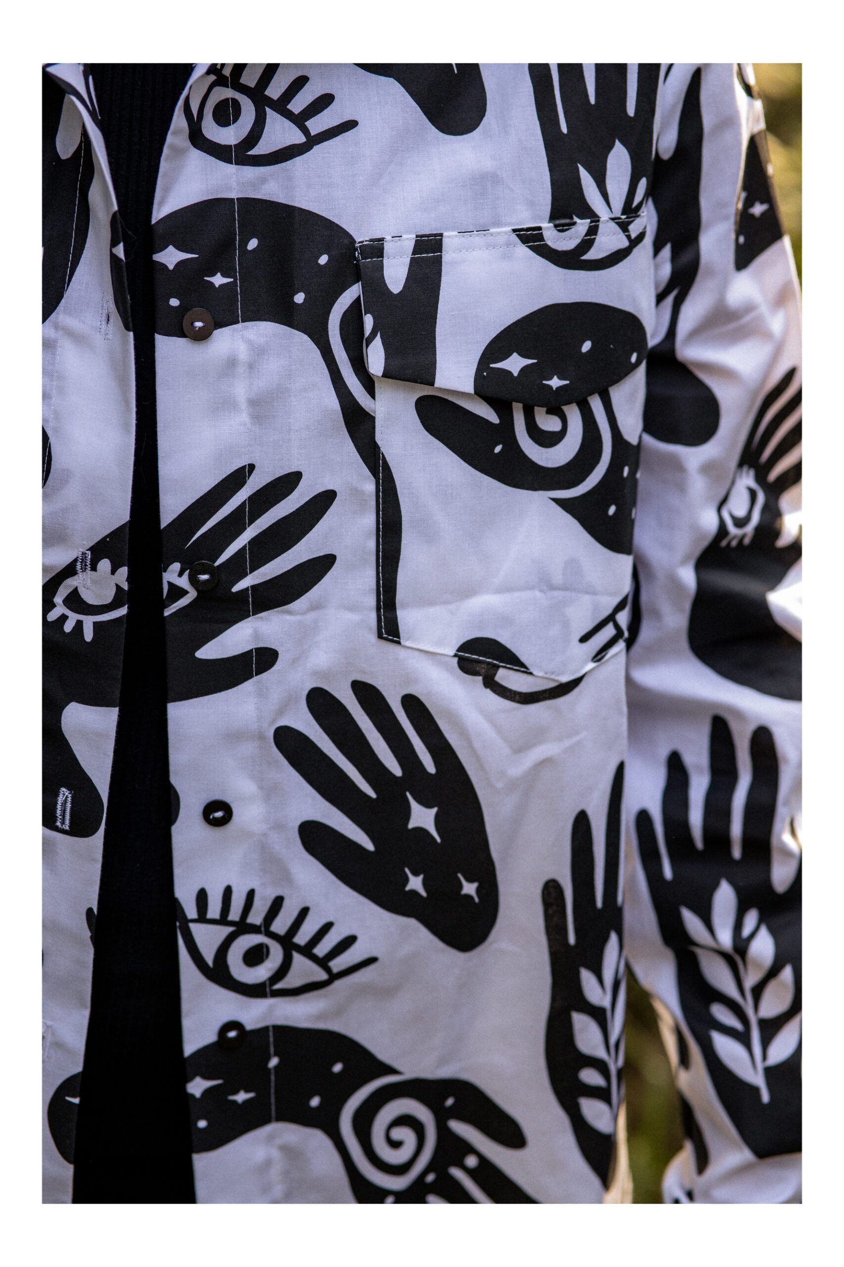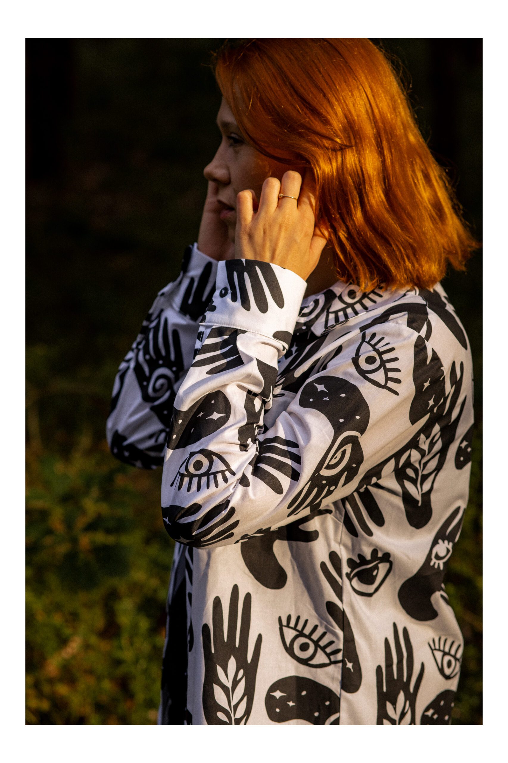 Koszula o kroju oversize, z lekko szerszymi i opadającymi rękawami z mankietem. Koszula uszyta została z bawełny.  Posiada duże kieszenie oraz klasyczny kołnierzyk. Zapinana jest na  guziki. Oryginalny wzór dodaje jej charakteru. Koszula jest bardzo wygodna, można ją nosić na „luźno” z rozpiętymi guzikami, bądź klasycznie.