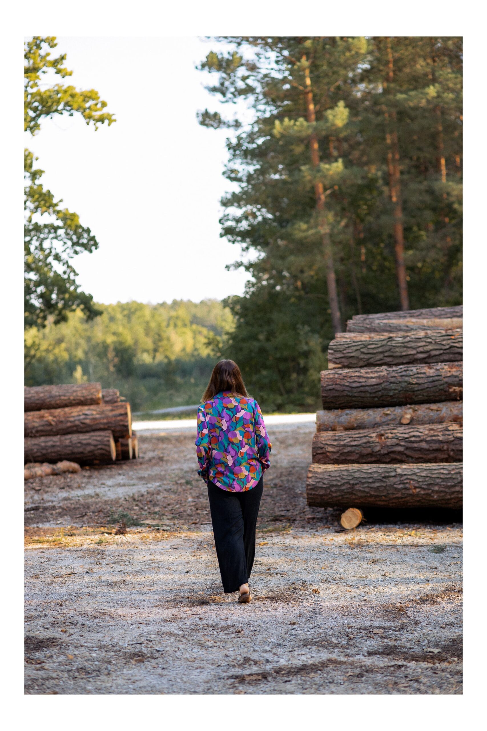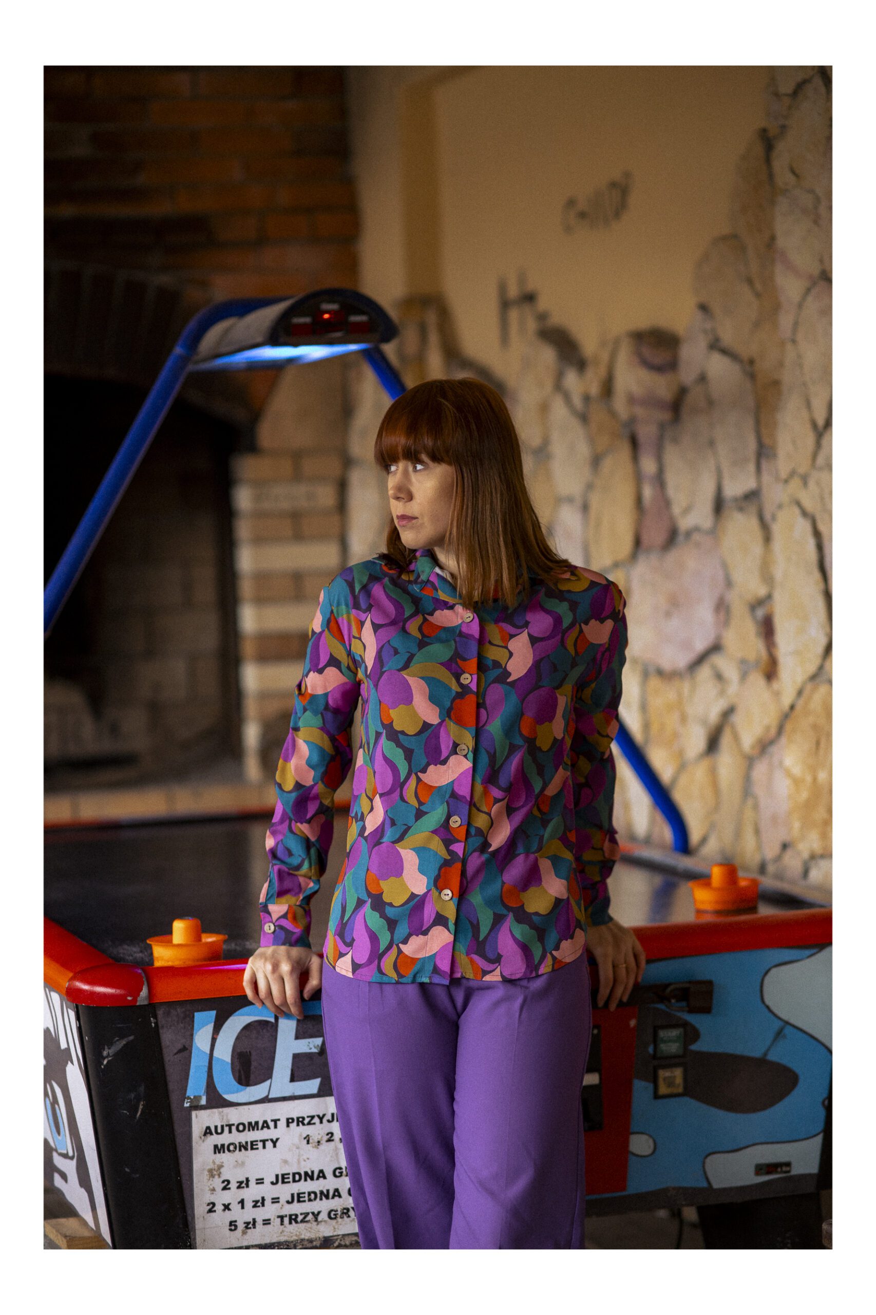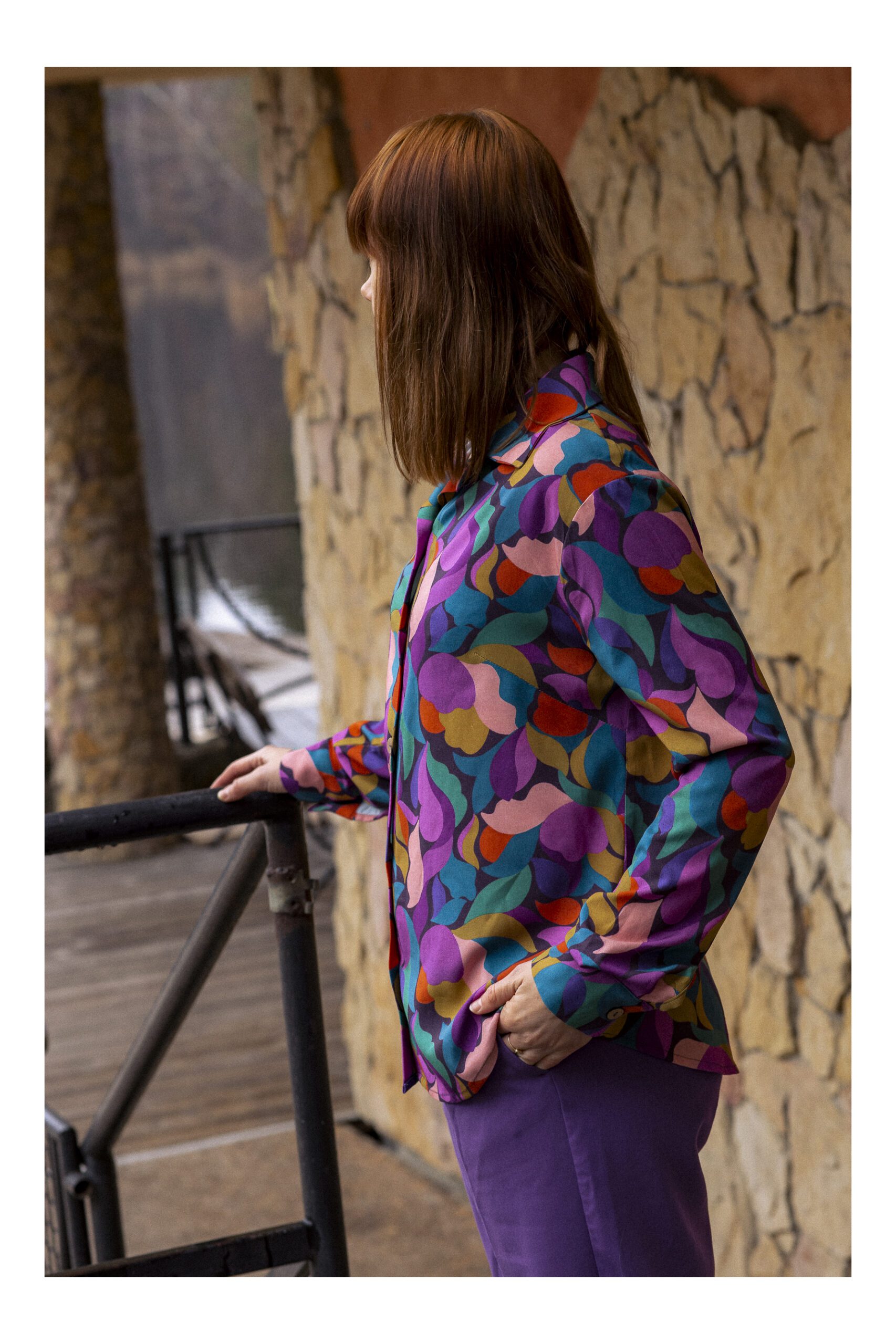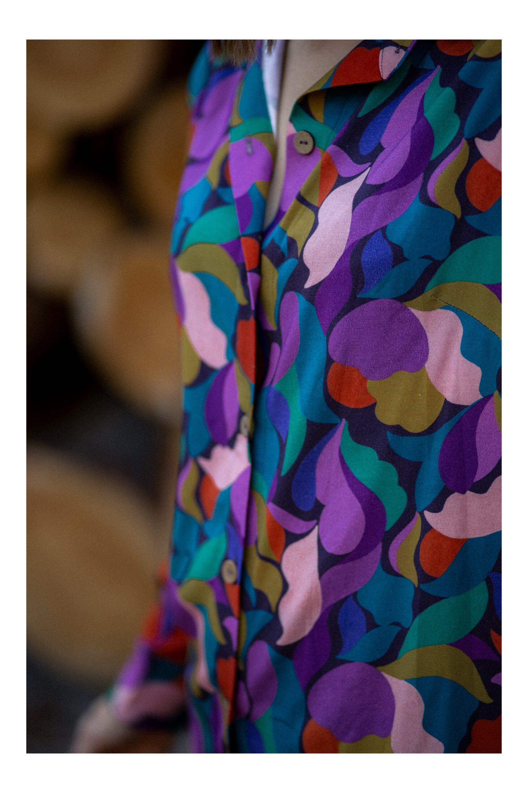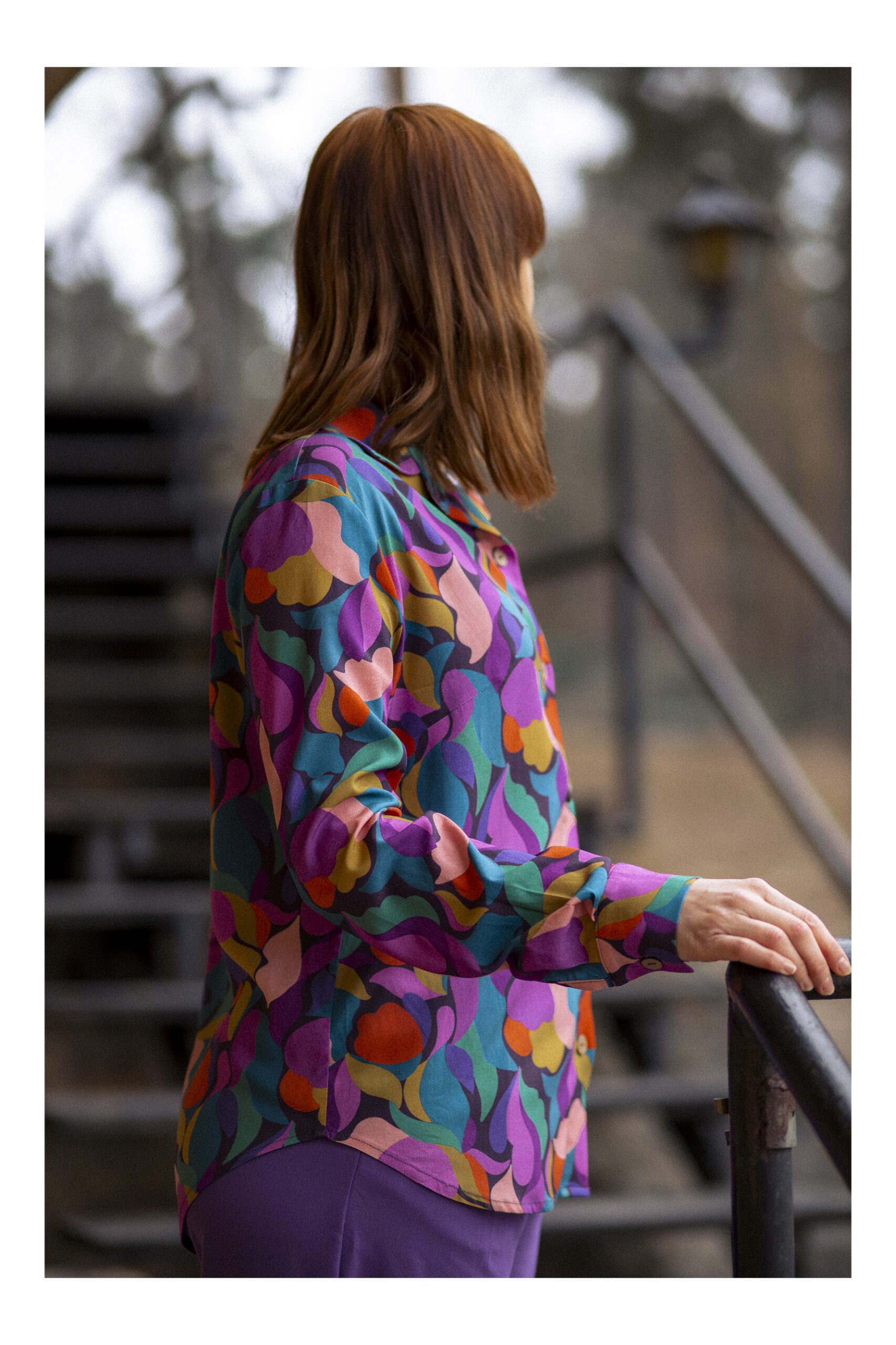 Koszula o luźnym kroju. w kolorowy wzór, została uszyta z wiskozy. Jest przyjemna w dotyku . Idealna na spotkanie ze znajomymi, a także jako element garderoby biurowej. Ma okrągły dekolt z kołnierzykiem i szerszy rękaw, zakończony mankietem zapinanym na guzik.