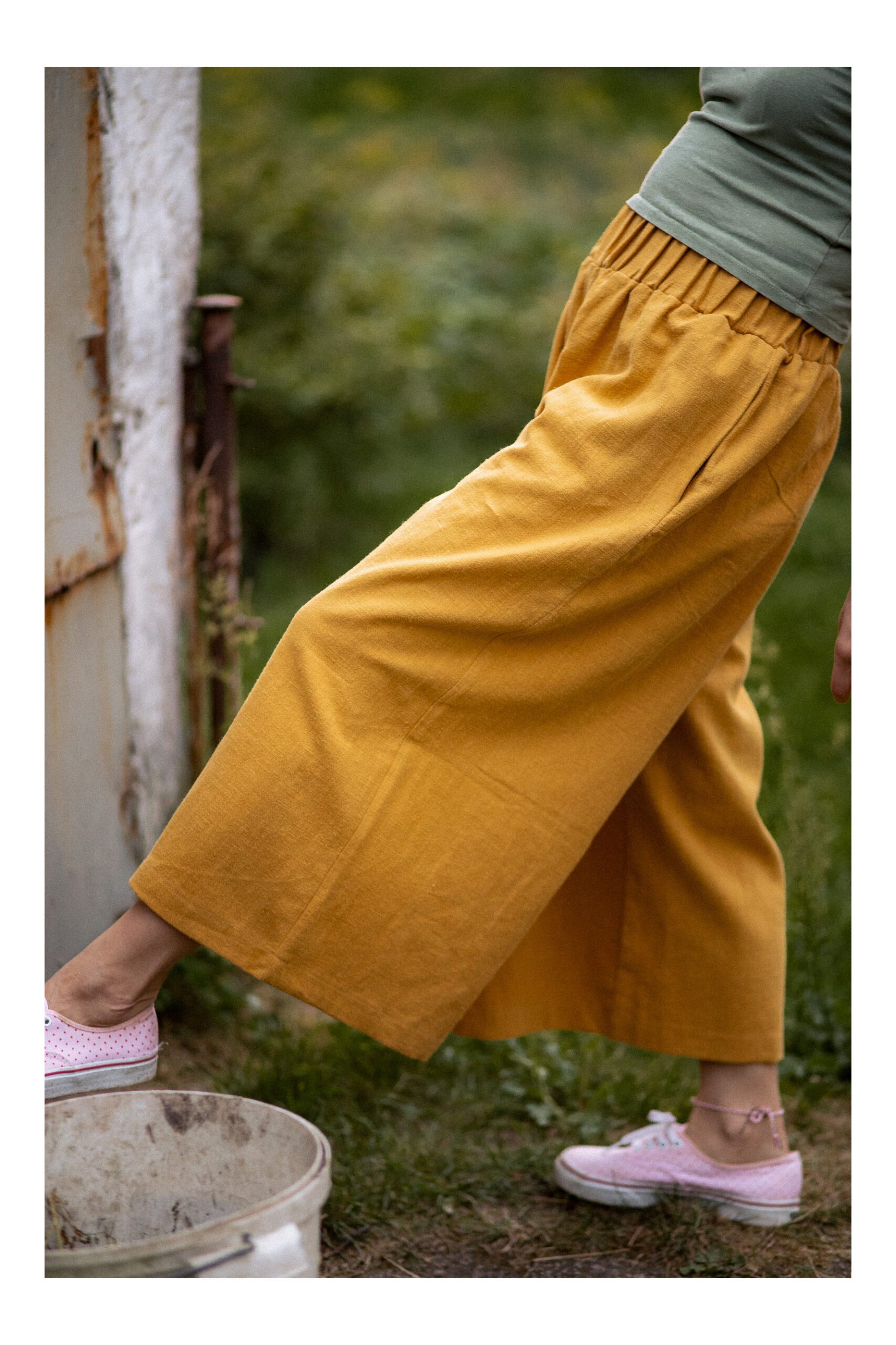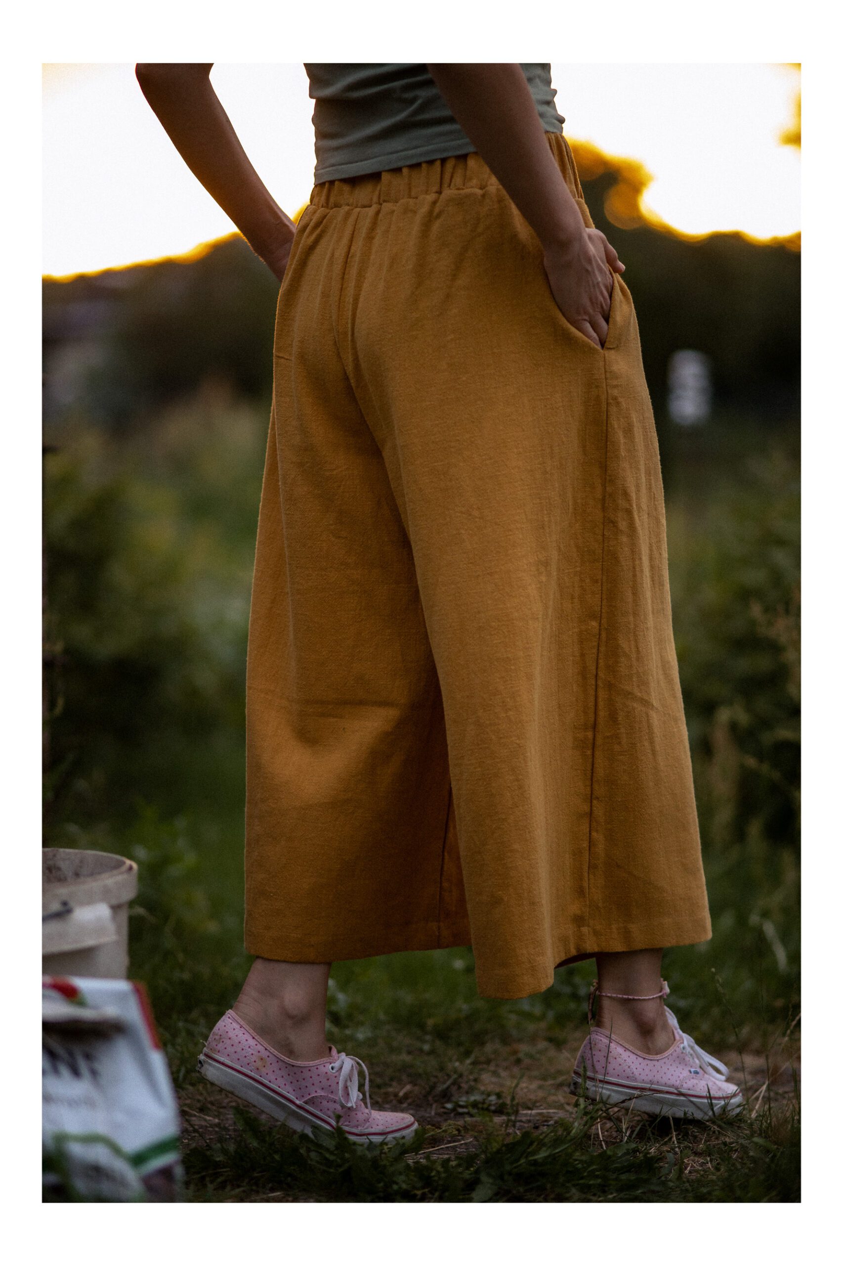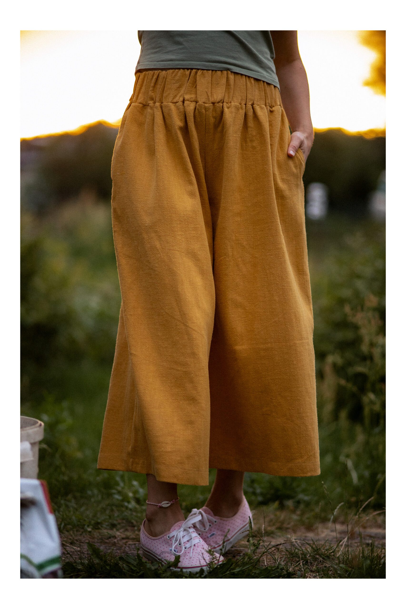 Zwiewne kuloty, uszyte z lnu, co sprawia, że są miękkie i delikatne w dotyku. Posiadają szerokie nogawki, o wygodnej długości 7/8. W pasie została wszyta szeroka i eleastyczna guma, podkreślająca naszą figurę. Spodnie posiadają boczne kieszenie. Idealnie nadają się na letnie, gorące dni – zarówno na plaże, jak i do „biegania” po mieście.