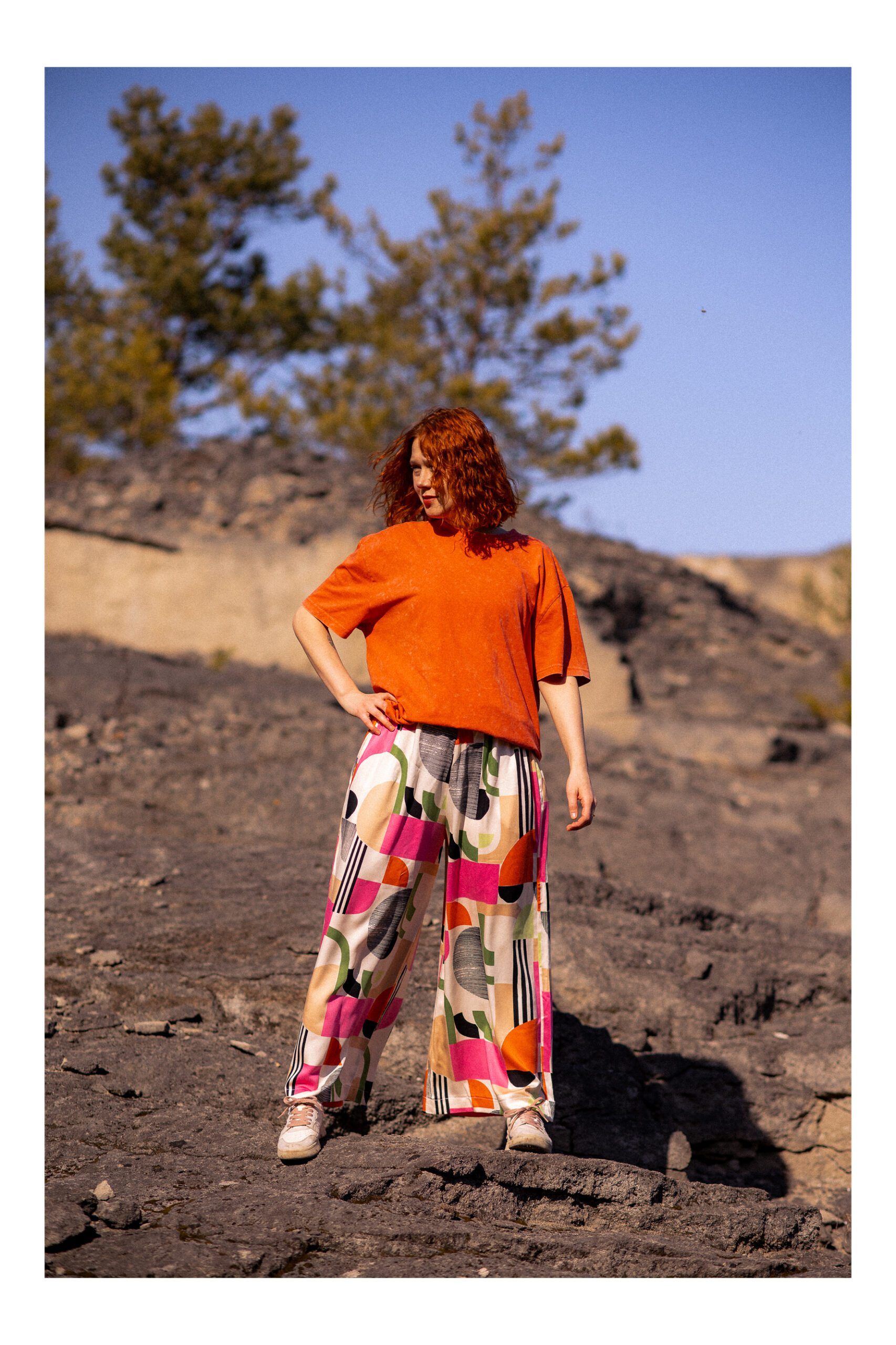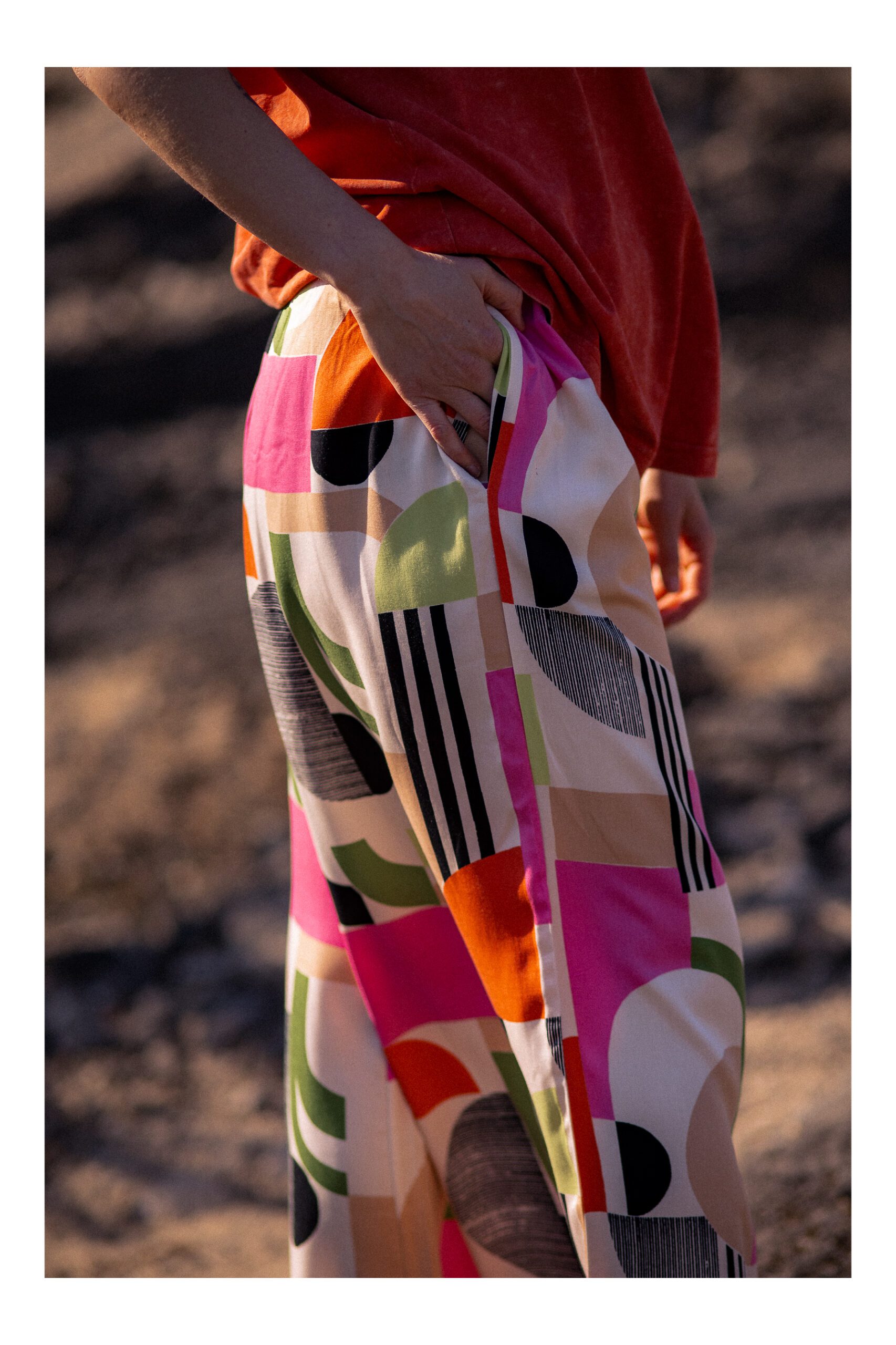 Te spodnie to połączenie wygody i wyrazistego stylu. Szeroka, luźna nogawka pięknie układa się w ruchu, a kolorowy, geometryczny wzór przyciąga spojrzenia i dodaje charakteru każdej stylizacji. W pasie wszyta jest elastyczna guma, dzięki czemu spodnie idealnie dopasowują się do sylwetki i zapewniają komfort noszenia przez cały dzień. Dodatkowym atutem są praktyczne boczne kieszenie, które podkreślają ich casualowy, swobodny charakter. Idealne zarówno na co dzień, jak i na letnie wyjazdy.