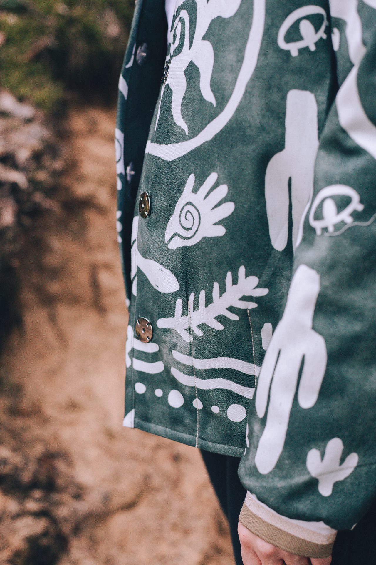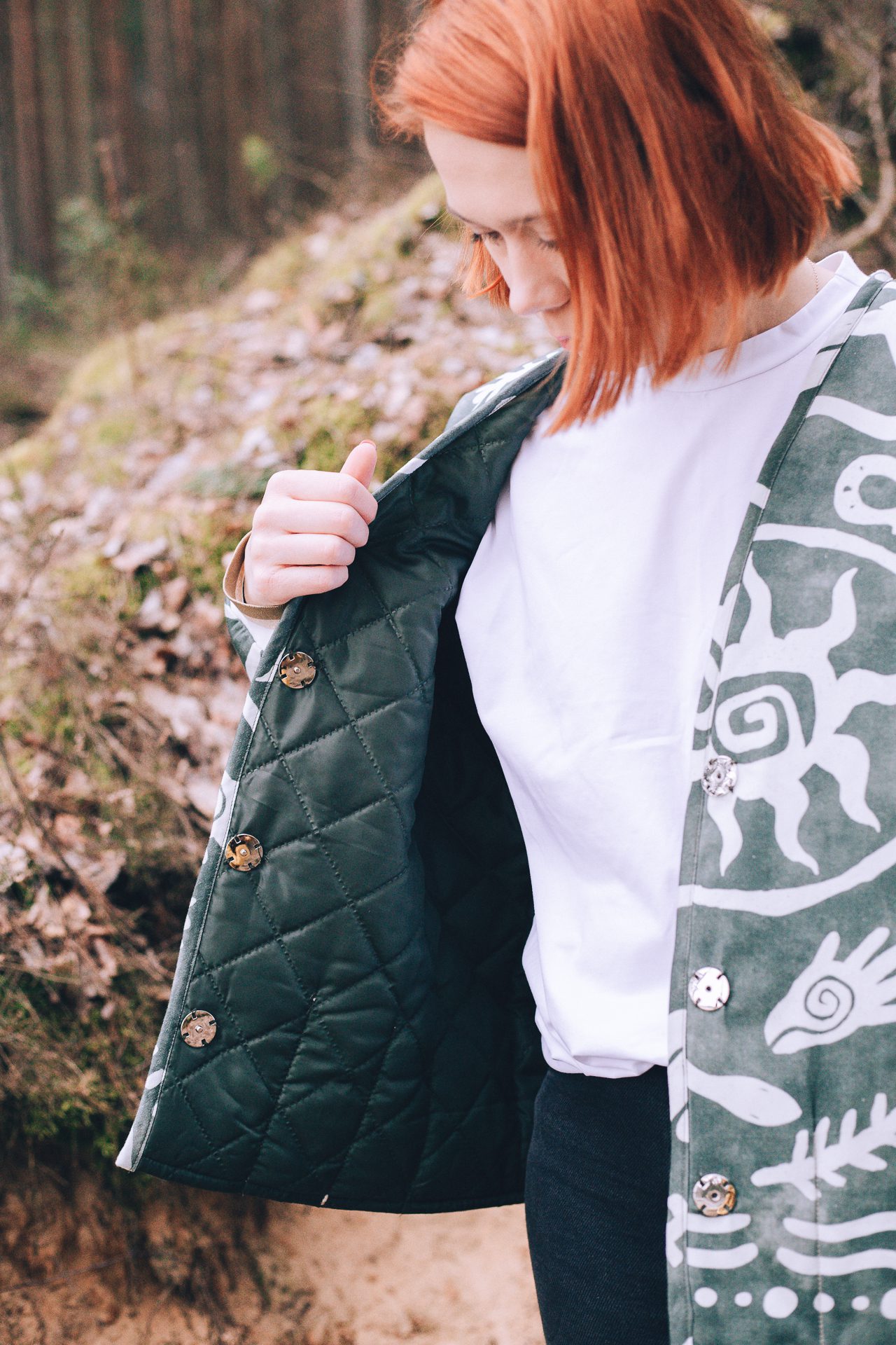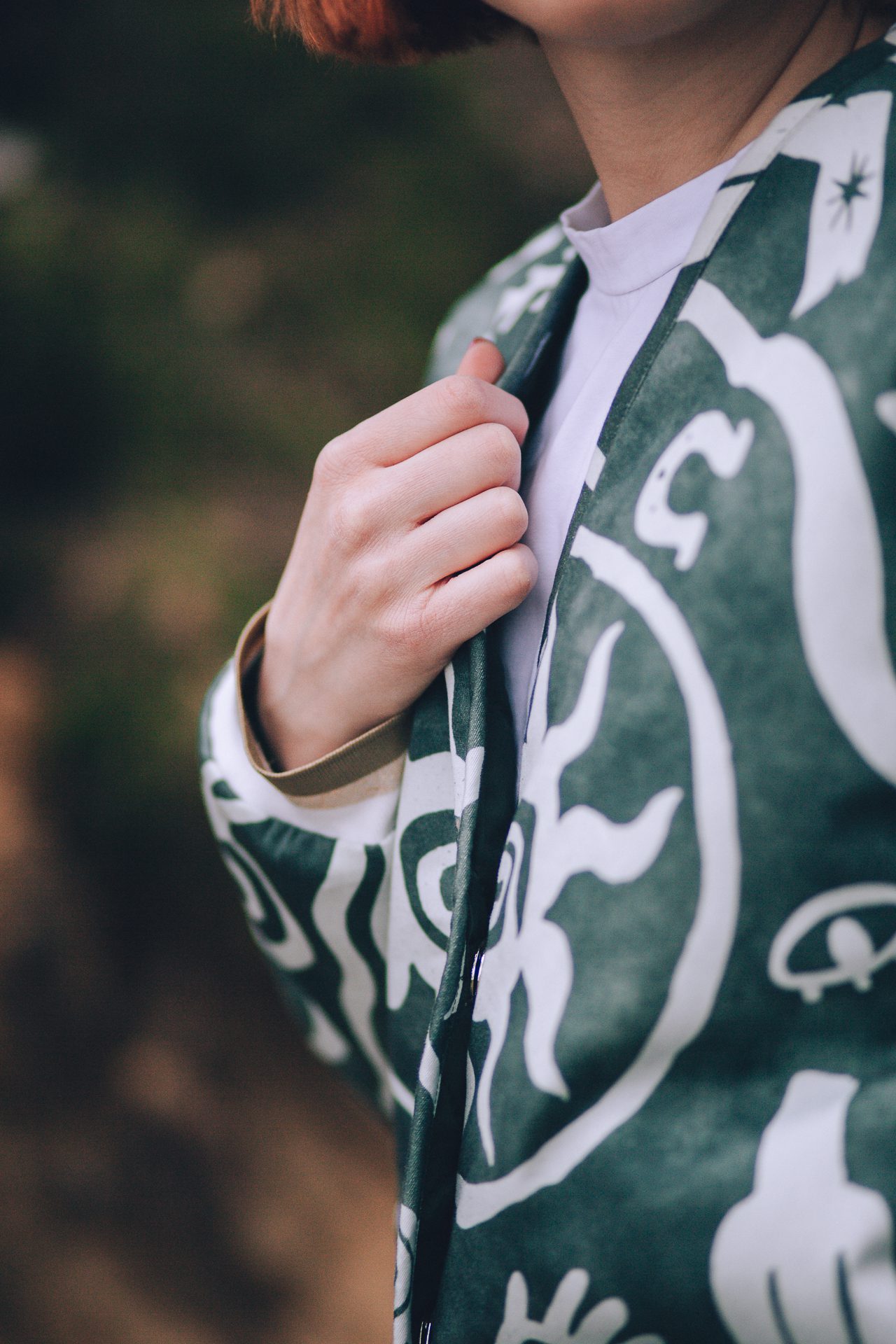 Kurtka o luźnym kroju z pikowaną podszewką. Ozdobiona jest u dołu zaszewkami. Długi rękaw, wykończony ściągaczem (możliwa opcja wykończenia gumką) oraz dekolt w „V”. Zapinana z przodu za zatrzaski. Kurtka przejściowa, sprawdzi się jako uniwersalne okrycie na jesienno-wiosenne dni, a także chłodniejsze letnie wieczory. Wzory na kurtce dodają oryginalnego charakteru.