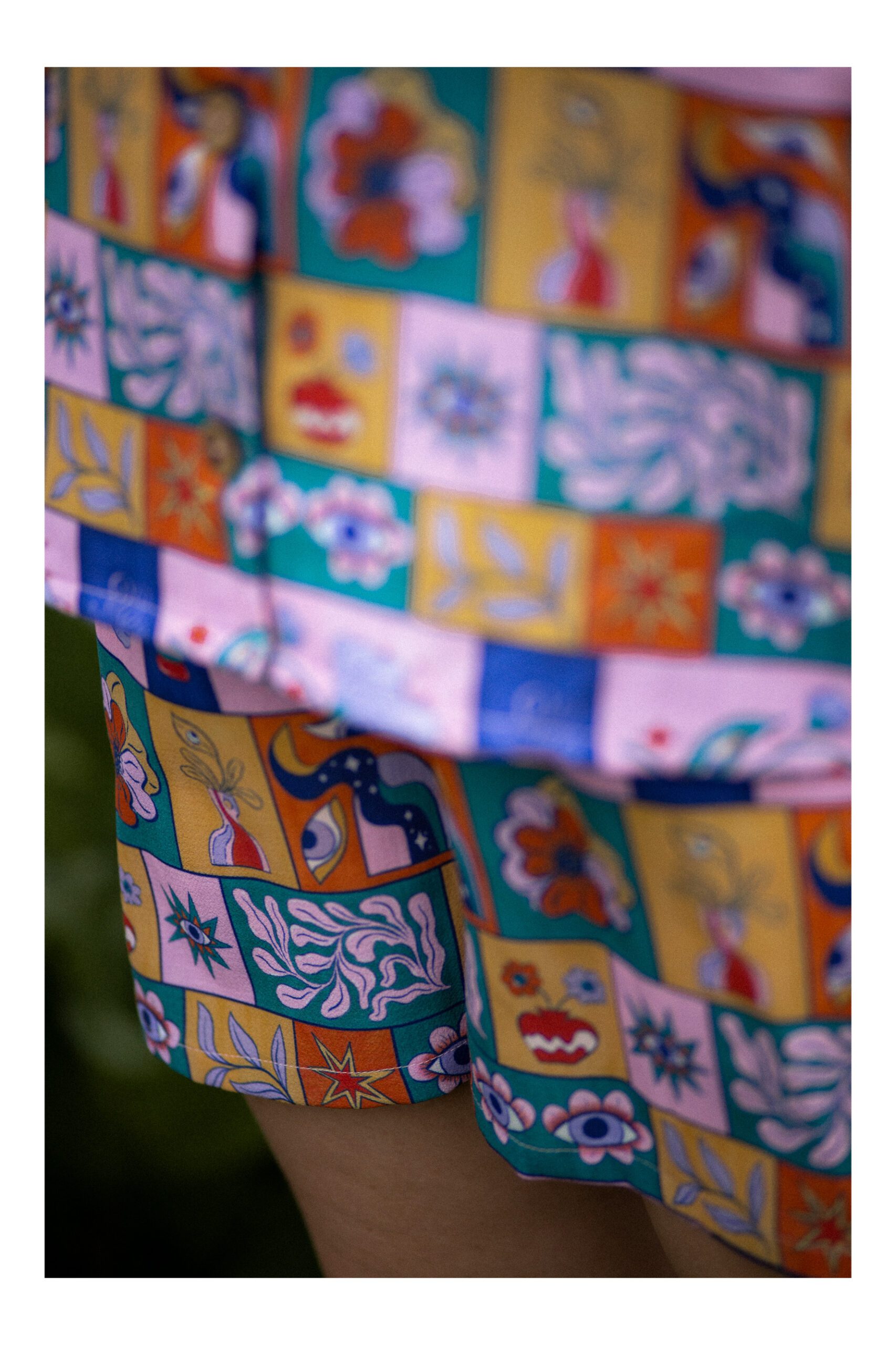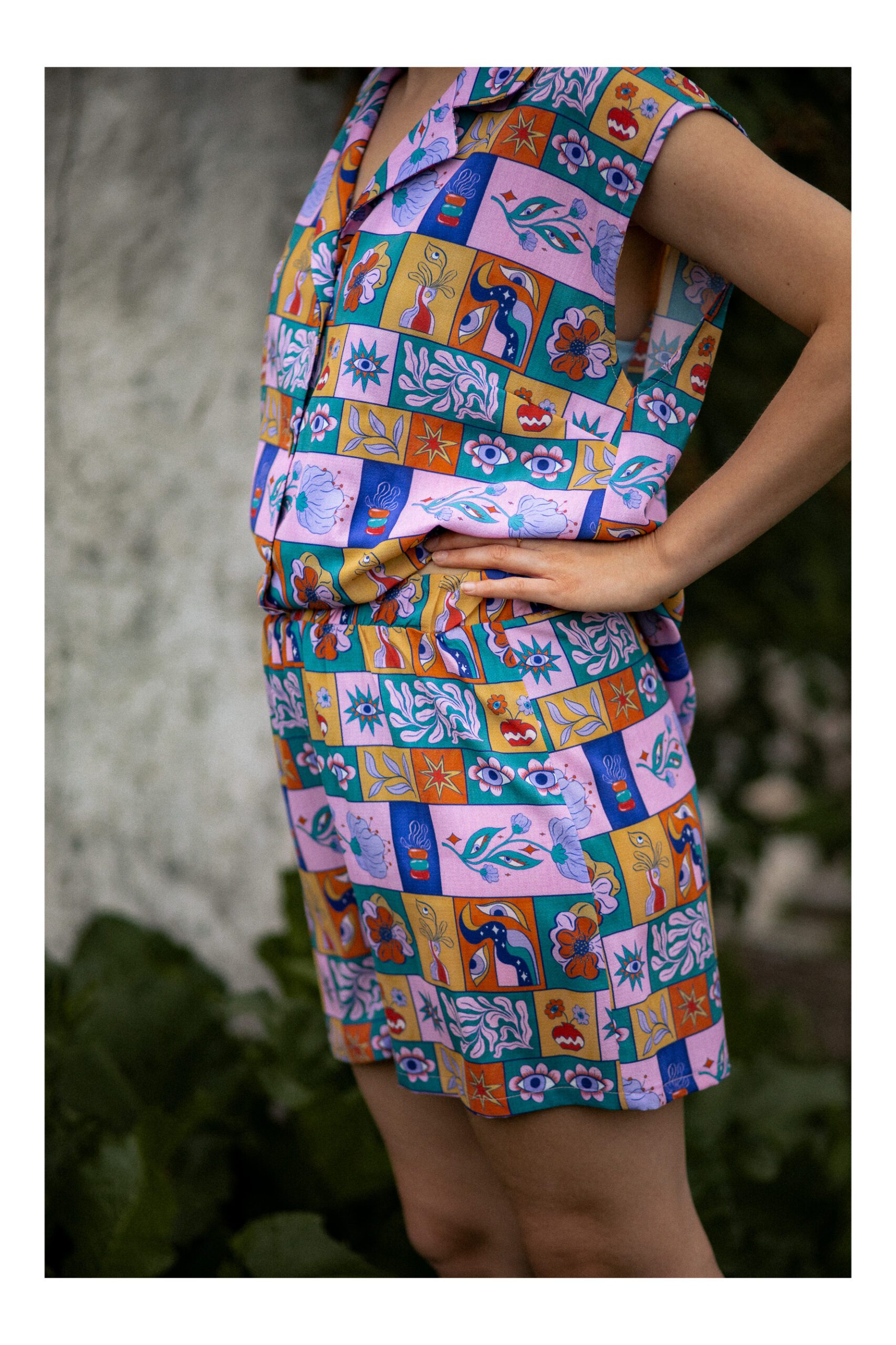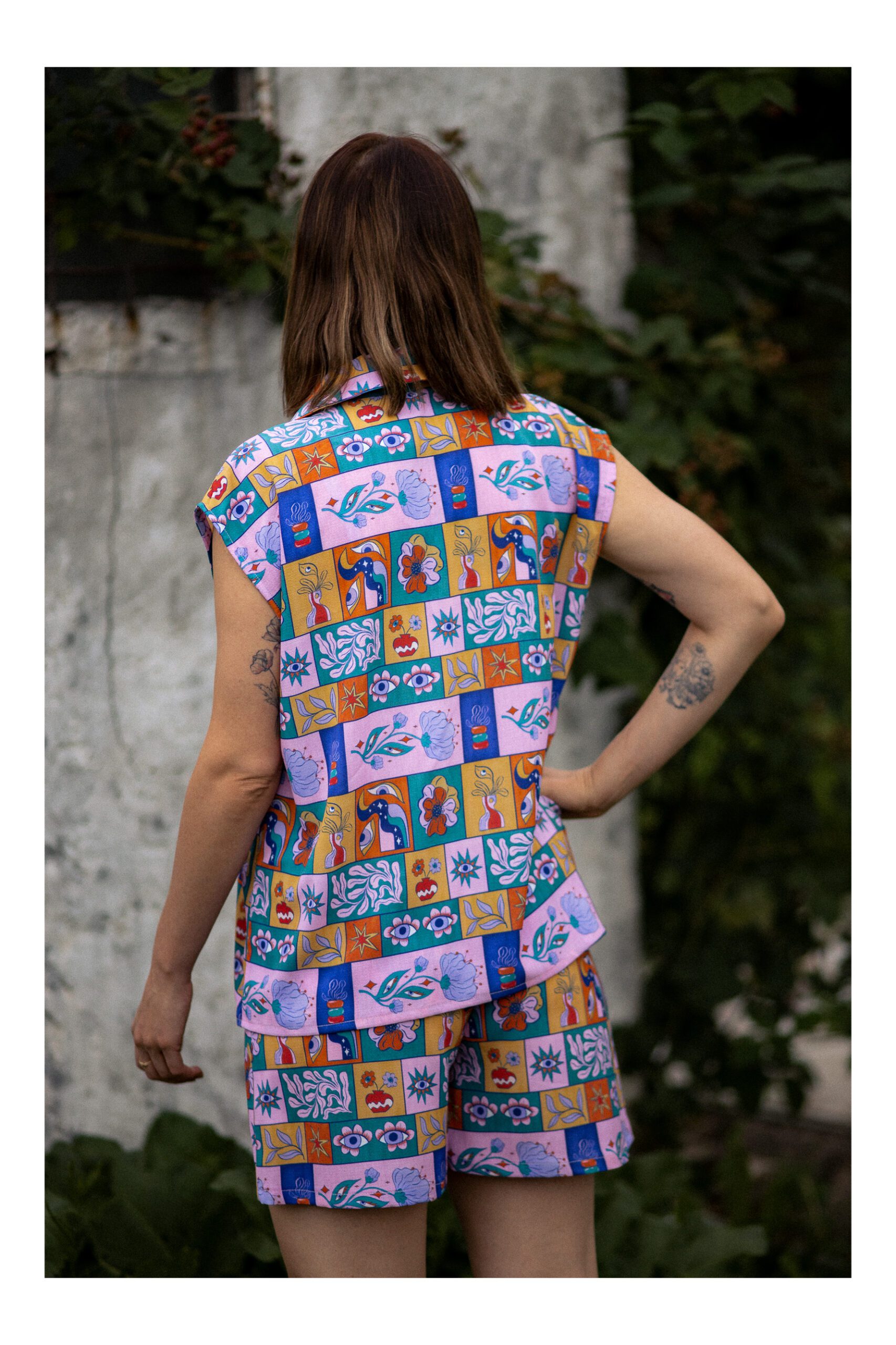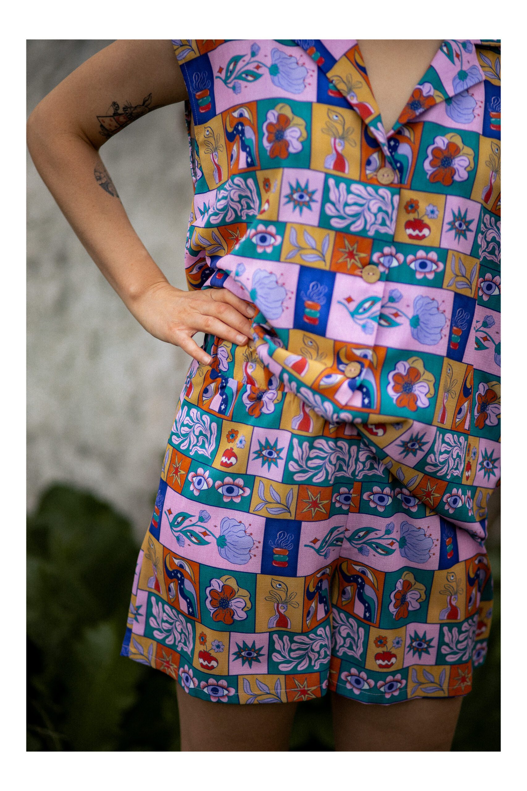 Letnie, damskie spodenki w oryginalny wzór , zaprojektowany przez POLSKĄ ARTYSTKĘ. Uszyte z lekkiej tkaniny, która jest idealna na ciepłe dni . W pasie została wszyta elastyczna guma, zapewniająca dopasowanie spodenek do każdej sylwetki.  Sprawdzą się one idealnie do wielu letnich stylizacji. Ich prosty, luźny krój gwarantuje wygodę i komfort.