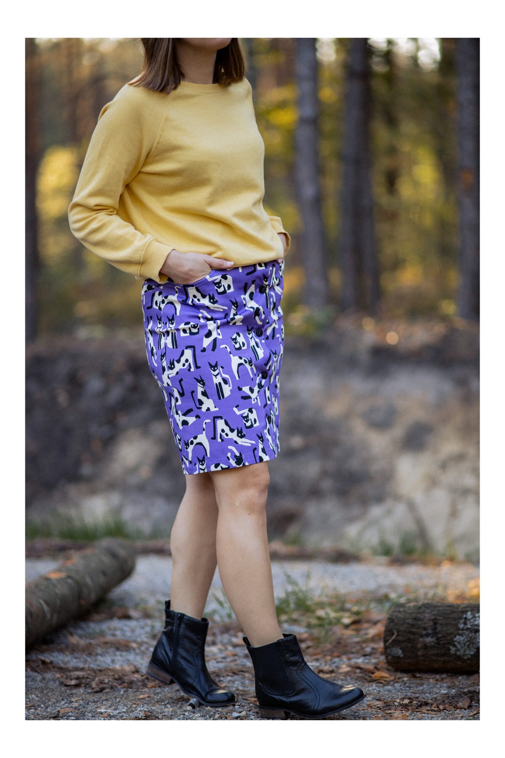 Spódnica o prostym krokju , z podwyższonym stanem. Zapinana na guziki. Uszyta została z grubszej bawełny z domieszką elastanu, nie jest sztywna a więc ładnie podkreśla nasza figurę. Dla naszej wygody w bokach spódnicy zostały wszyste kieszenie. Zdecydowanie mocny kolor fioletu oraz wzór w czarno białe koty dodaje spódnicy charakteru.
