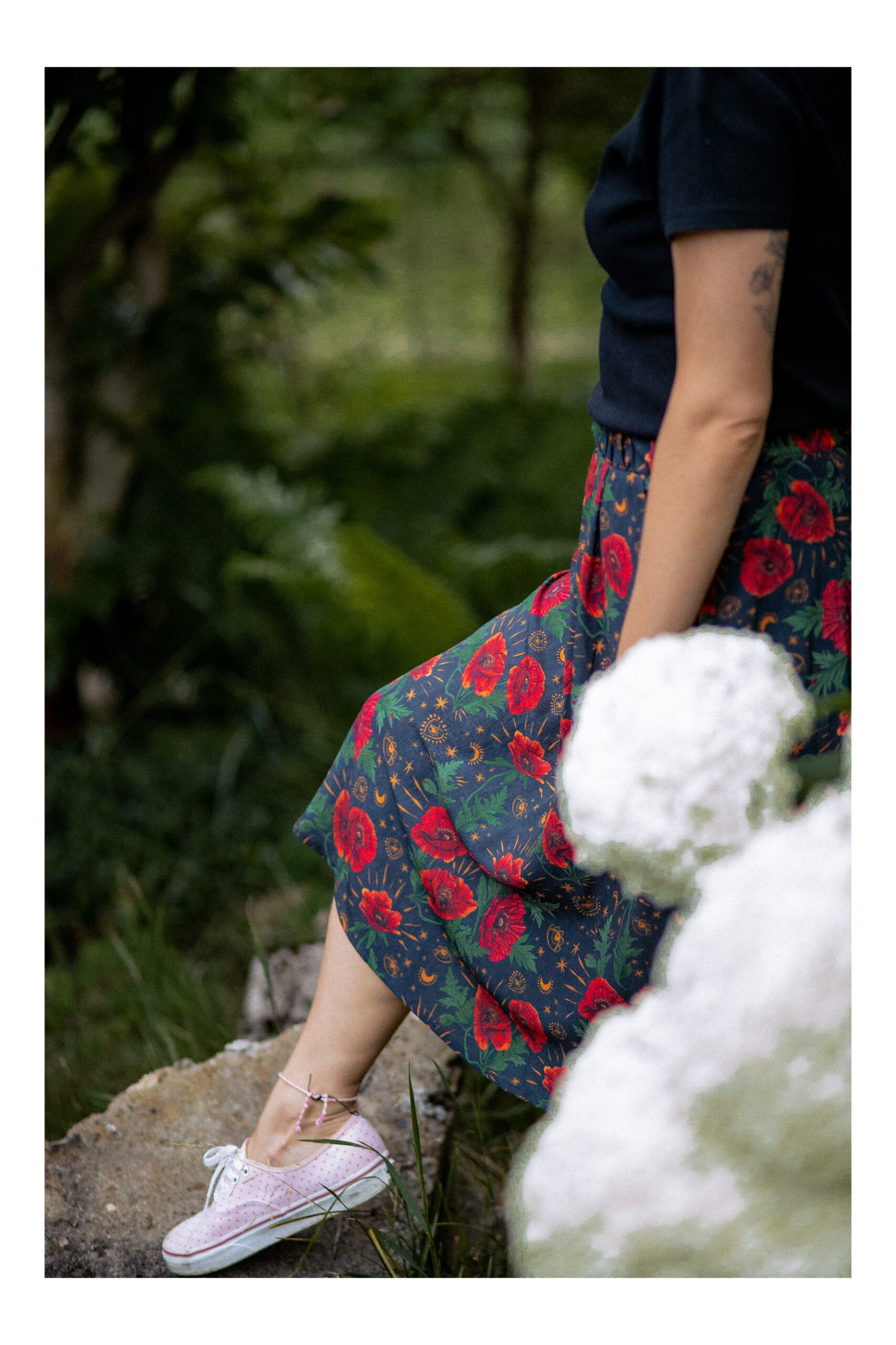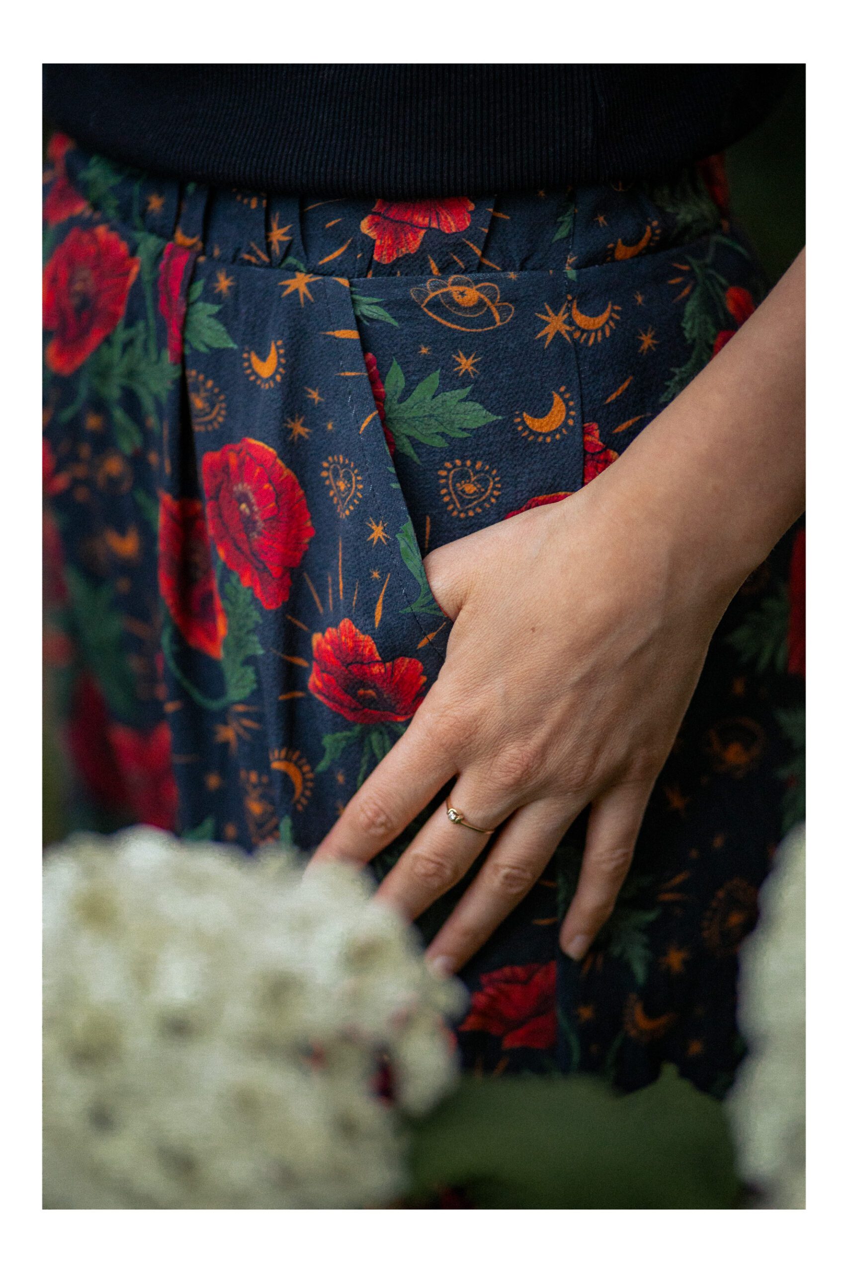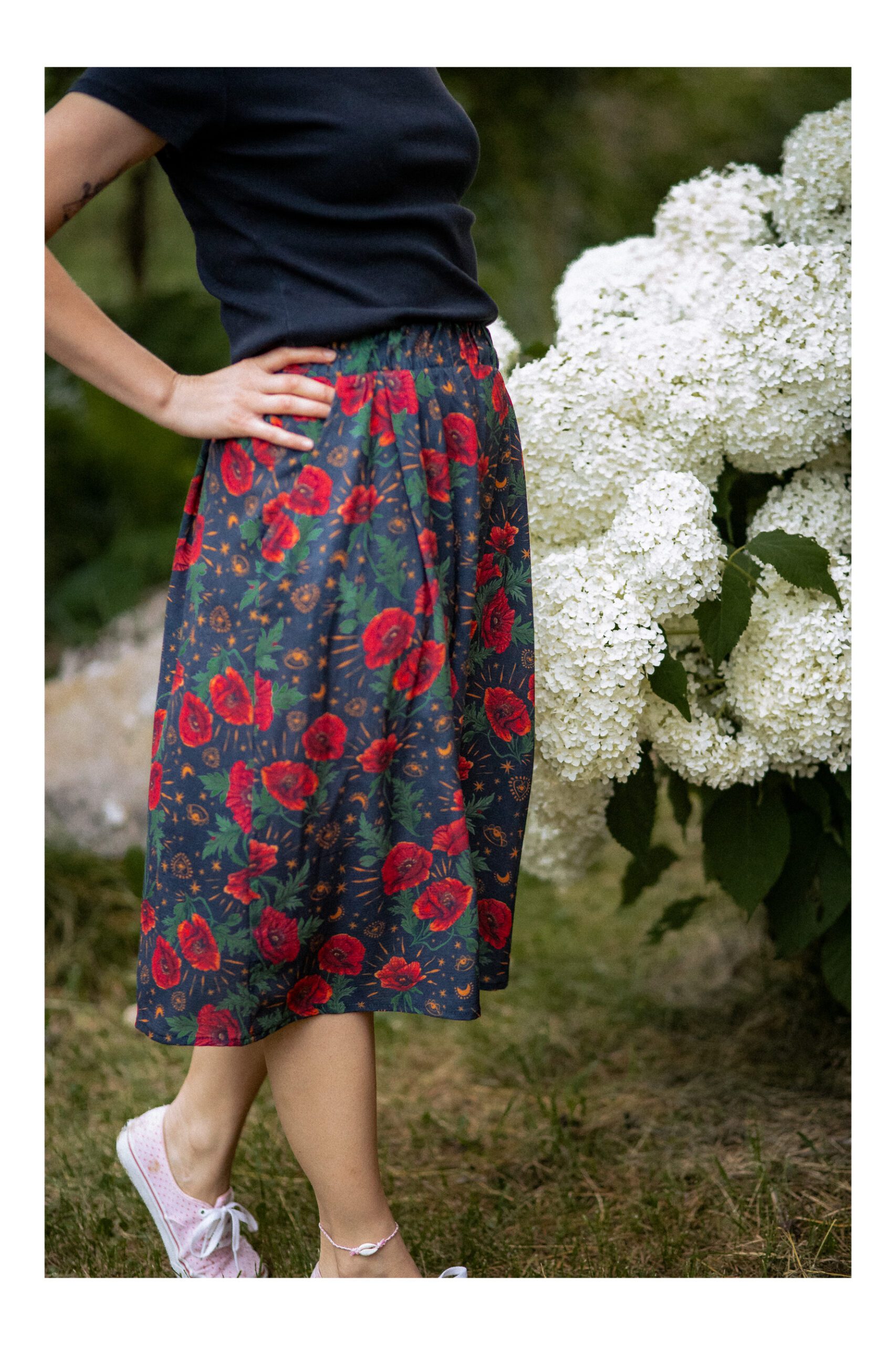 Spdódnica w kształcie trapezu, jest miękka i bardzo delikatna dla skóry. Tkanina, z której jest uszyta, dobrze pochłania wilgoć i jest przewiewna, co daje kmfort noszenia. W pasie została wszyta gumka, która dostosowywuje się do naszej sylwetki, ale nie gniecie. Dla naszej wygody w bokach spódnicy zostały wszyste kieszenie. Spódnica idalnie nadaje się na ciepłe dni. Wzór na spódnicy zapropjektowany przez POLSKĄ ARTYSTKĘ.