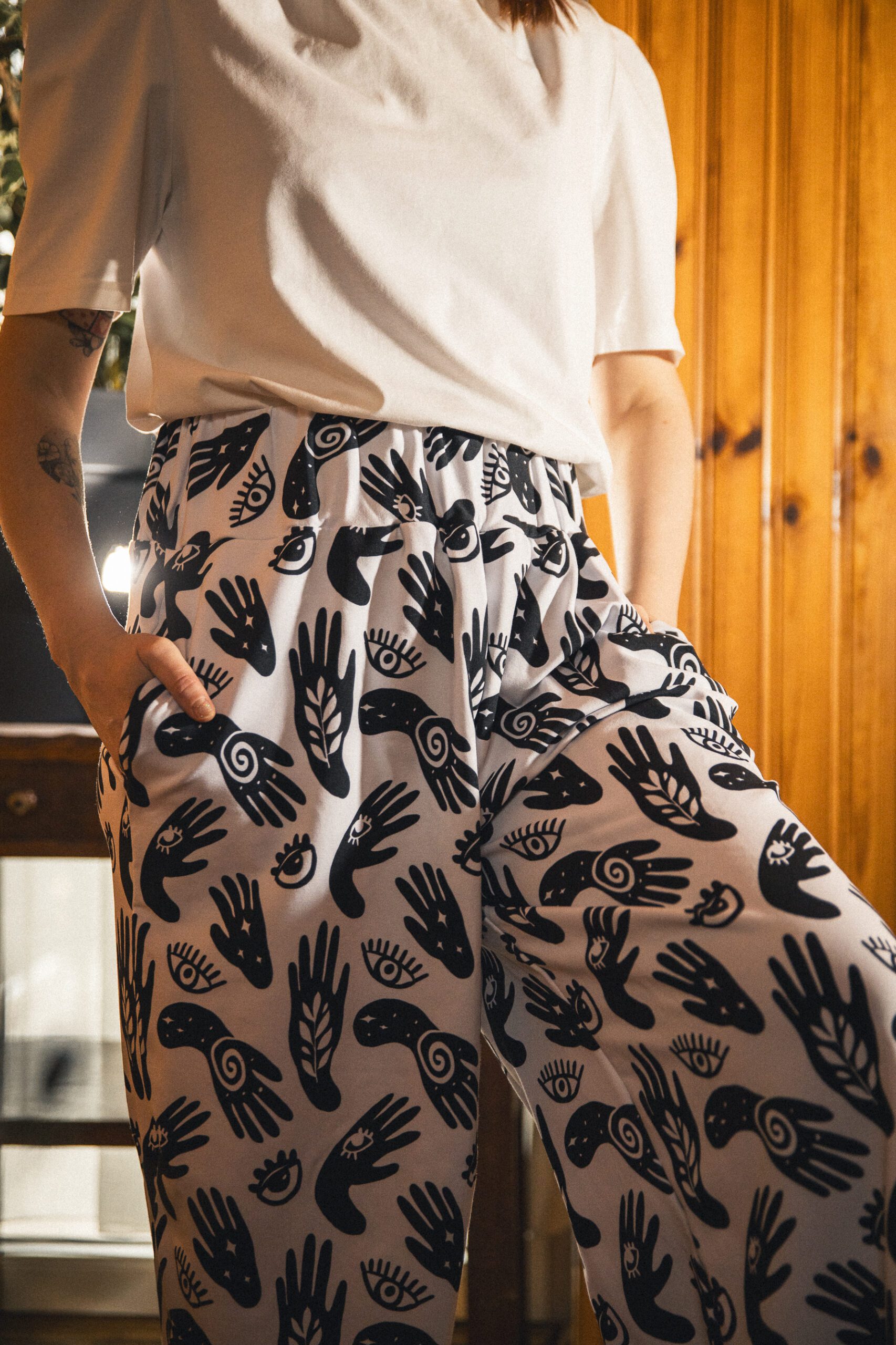 Spodnie zostały uszyte z dzianiny dresowej. Mają szerokie nogawki, dla większej swobody w boki zostały wszyste kieszenie. Szeroka guma w pasie podkreśla talię. Spodnie są bardzo lekkie i miękkie w dotyku. Idealne na chłodniejsze dni. Wzór w czarne ręce na białym tle dodają charakteru.