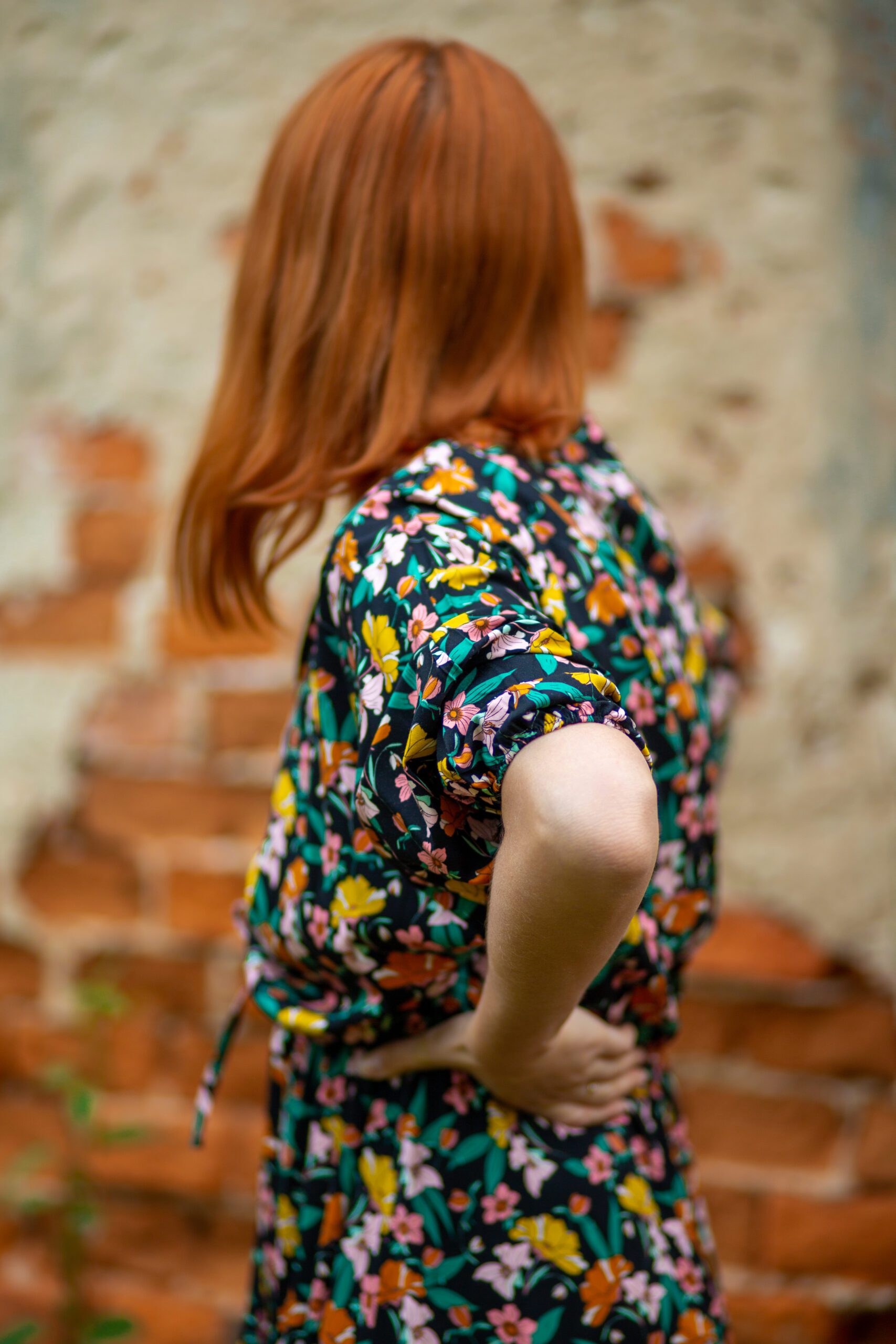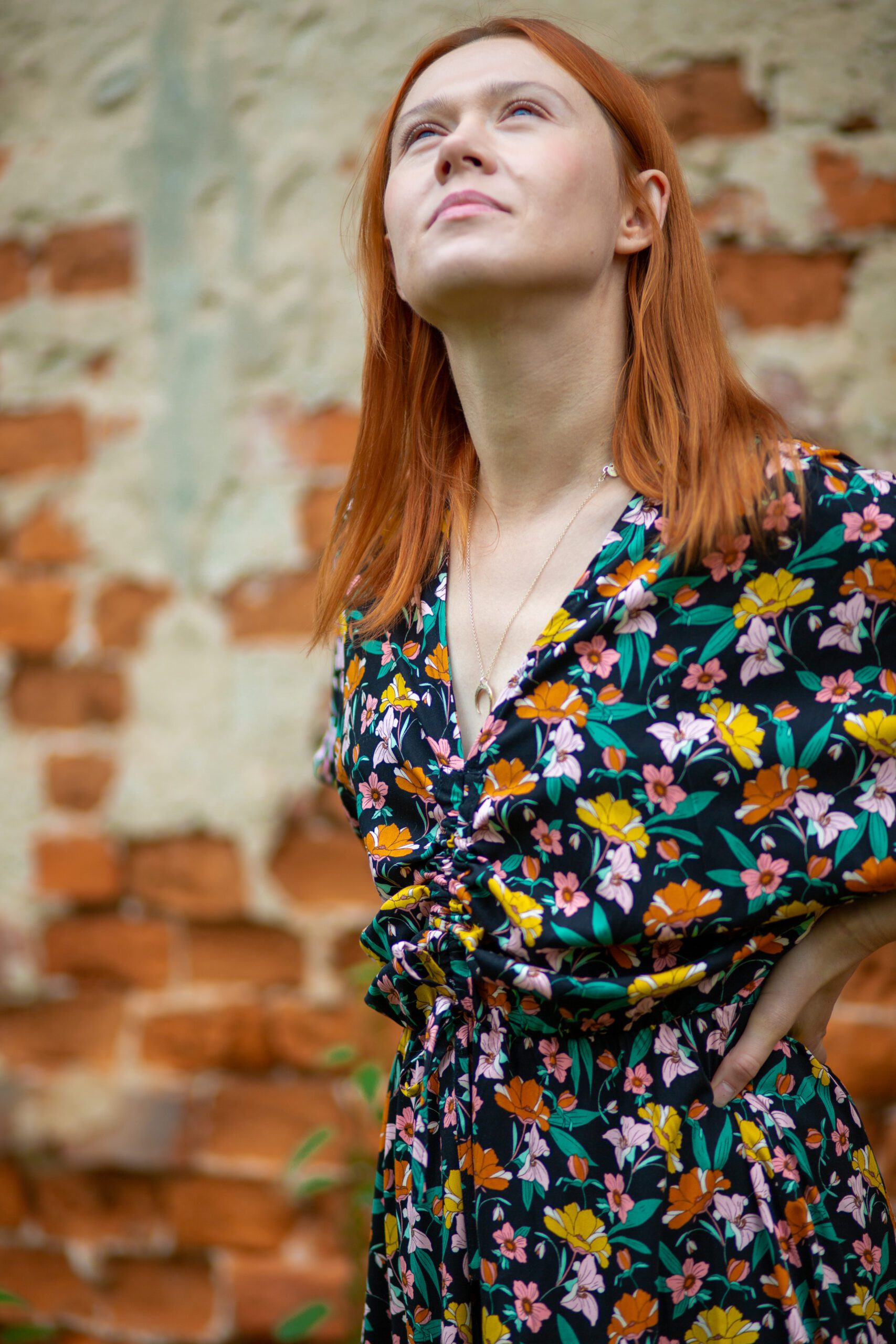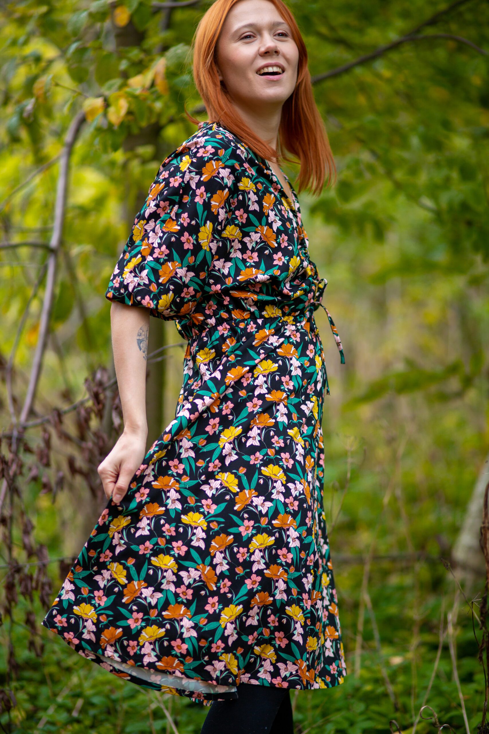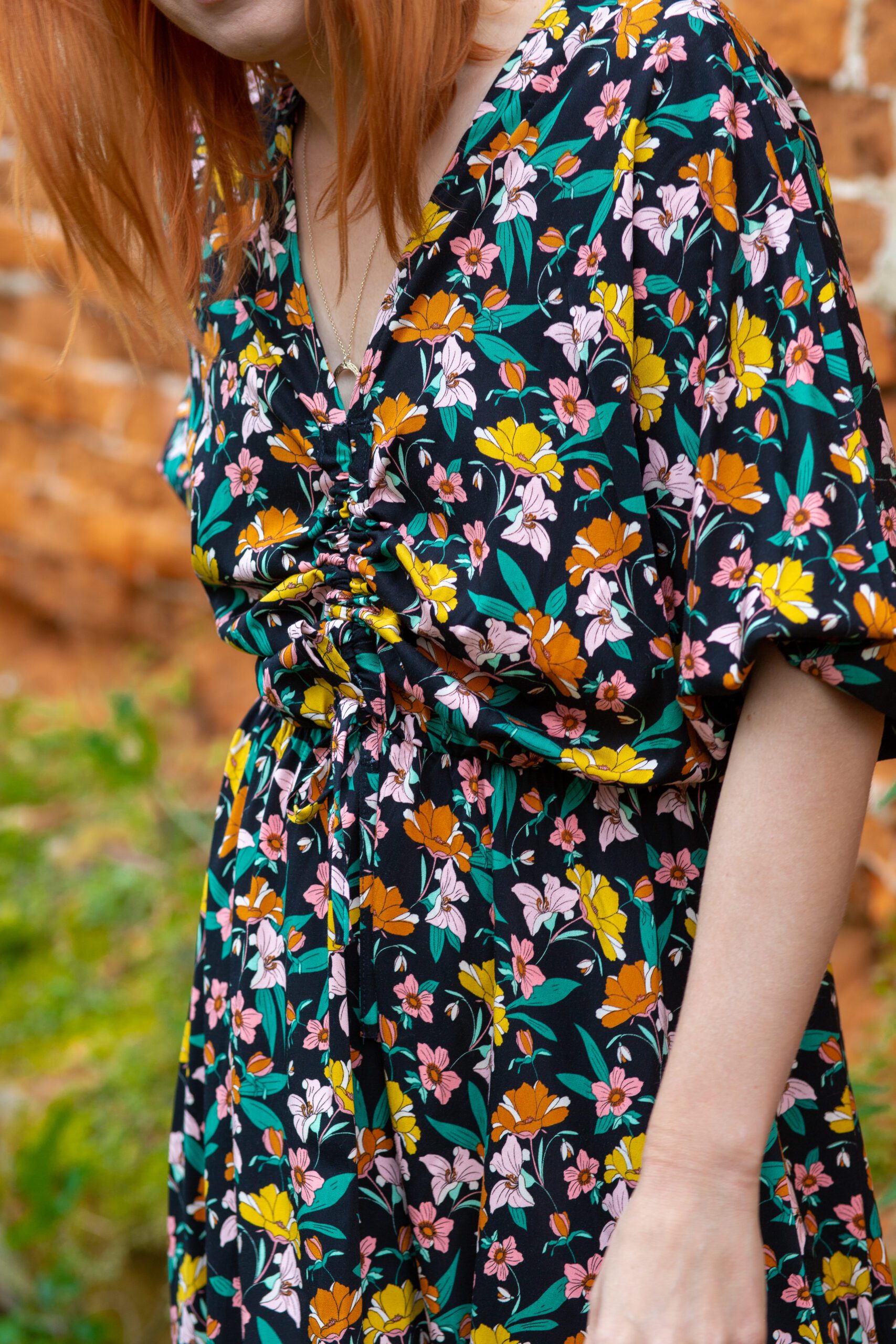 Sukienka uszyta jest z delikatnej i lekkiej tkaniny w piękne kwiaty.