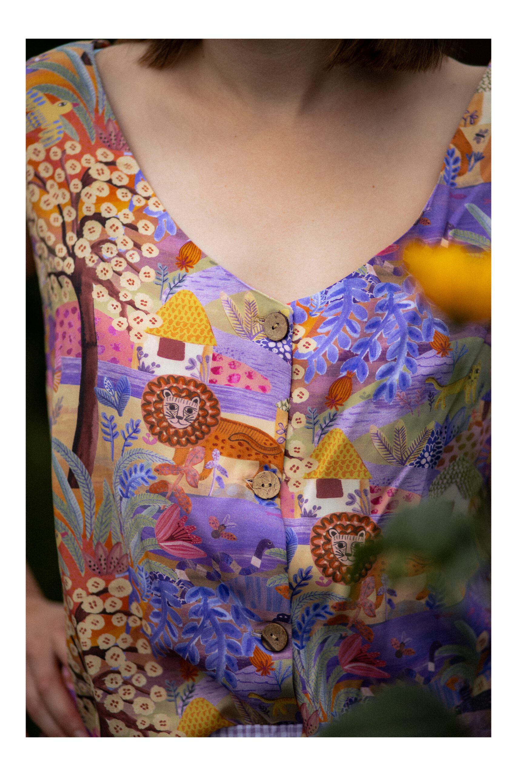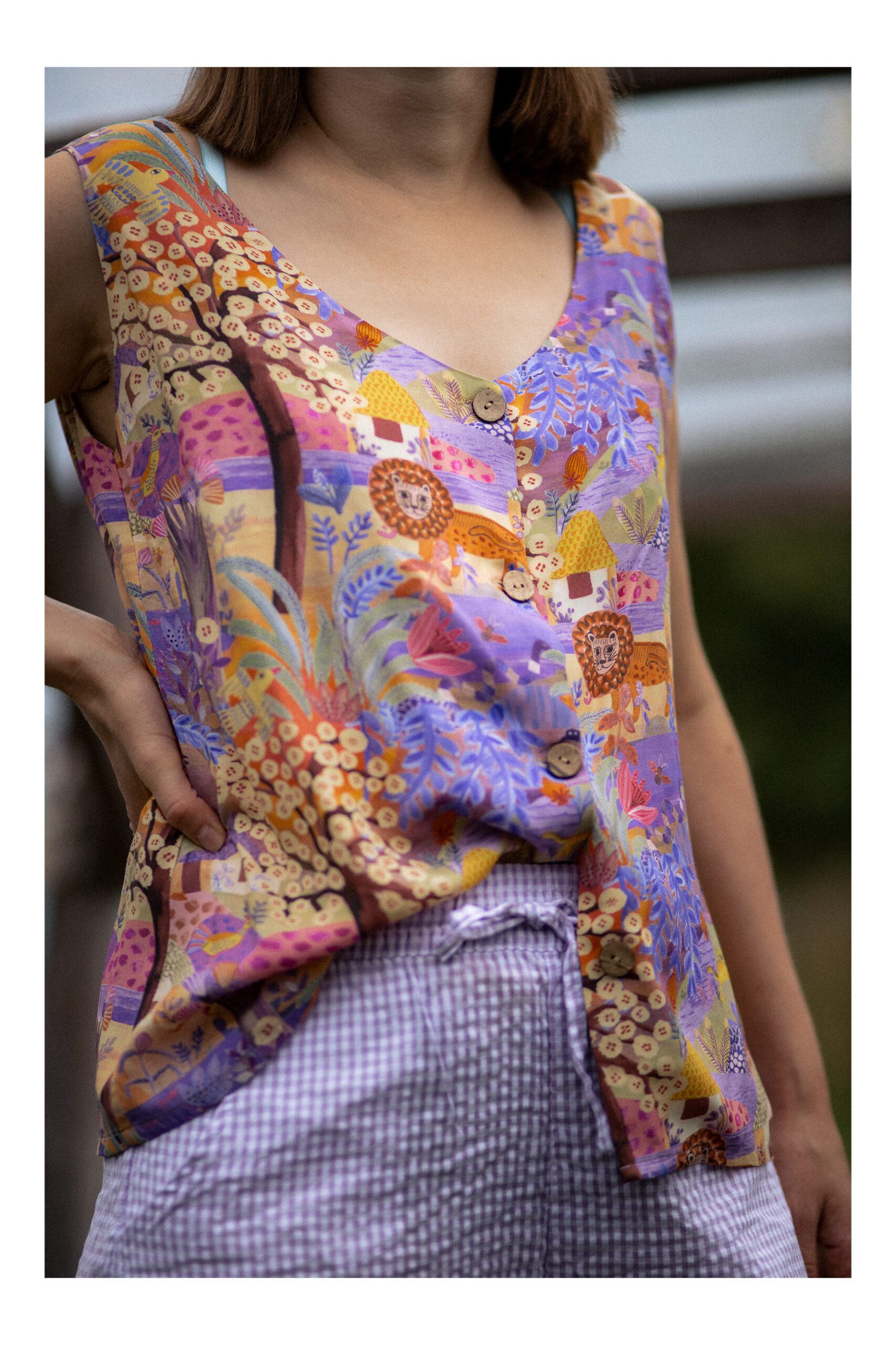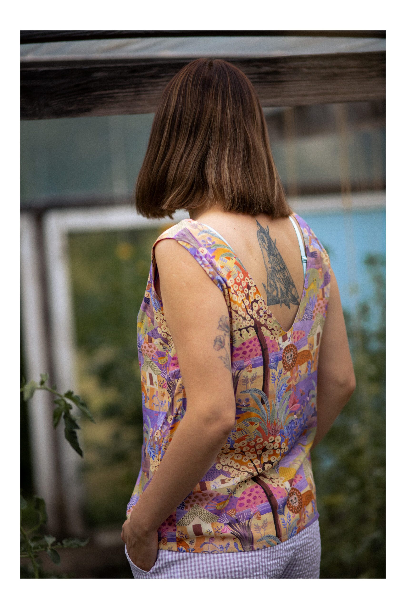 Luźna koszulka na grubych ramiączkach, z głębokim dekoltem w „V” zarówno z przodu, jak i z tyłu. Koszulka lekko rozkloszowana w pasie, w kolorowy wzór, uszyta z wiskozy. Tkanina nie mechaci się, nawet po wielu pranaich. Nadruk jest trwały i nie spiera się. Koszulka zdecydowanie ma charakter, a przede wszystkim jest mega wygodna.