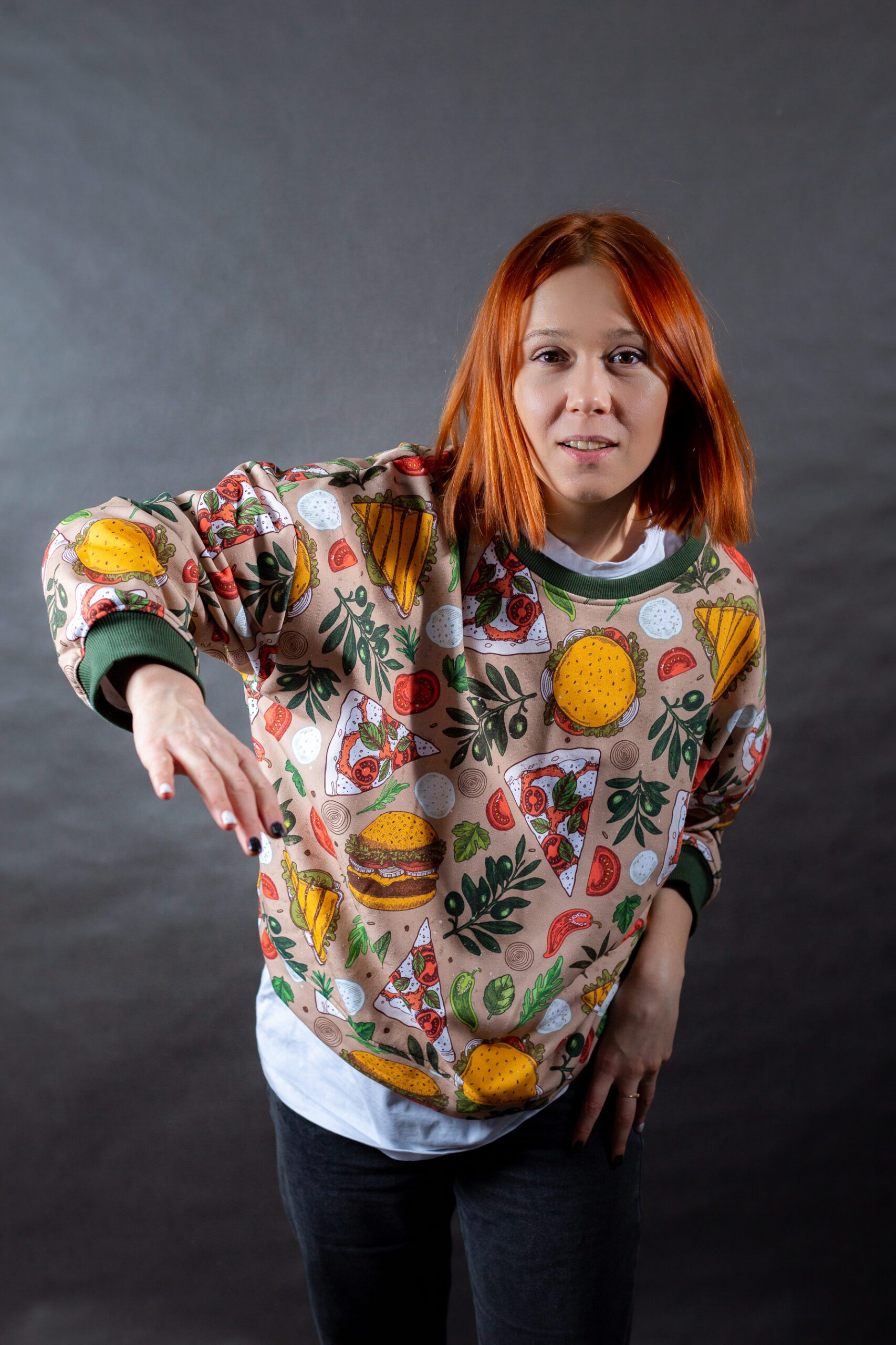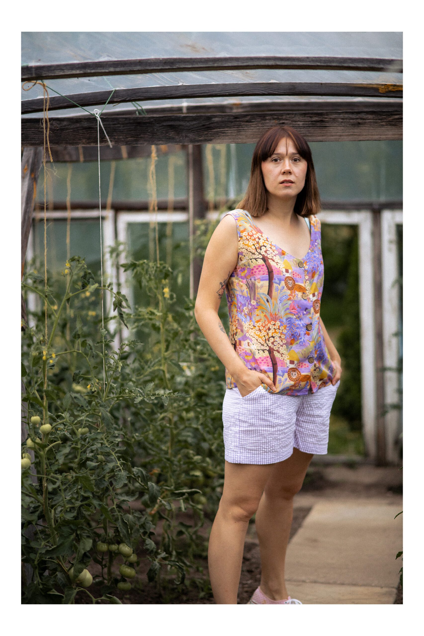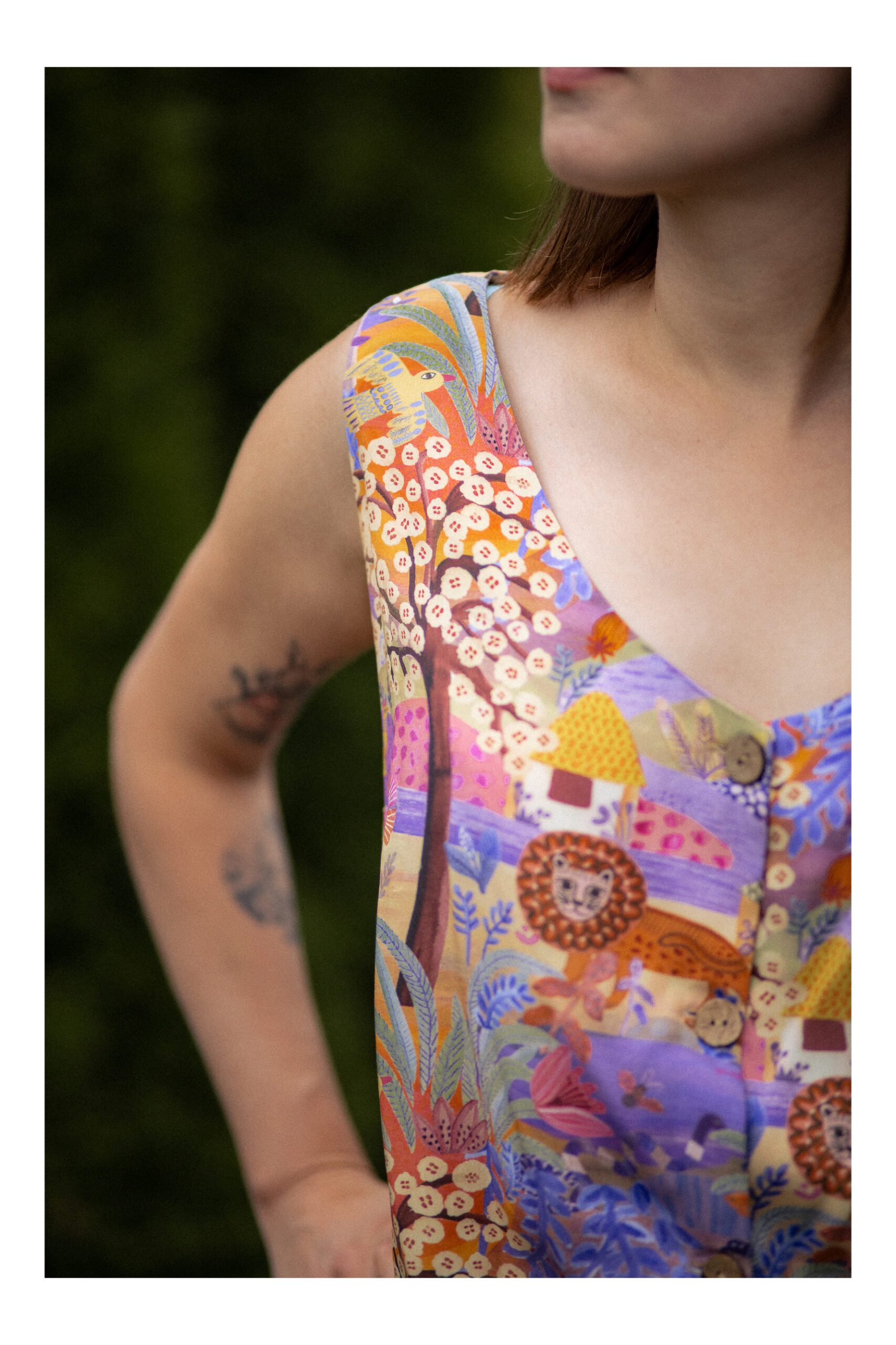 Luźna koszulka na grubych ramiączkach, z głębokim dekoltem w „V” zarówno z przodu, jak i z tyłu. Koszulka lekko rozkloszowana w pasie, w kolorowy wzór, uszyta z wiskozy. Tkanina nie mechaci się, nawet po wielu pranaich. Nadruk jest trwały i nie spiera się. Koszulka zdecydowanie ma charakter, a przede wszystkim jest mega wygodna.
