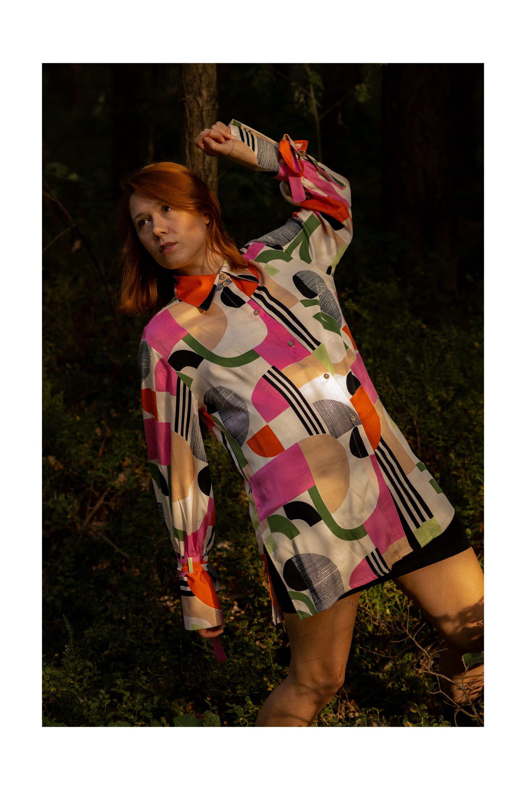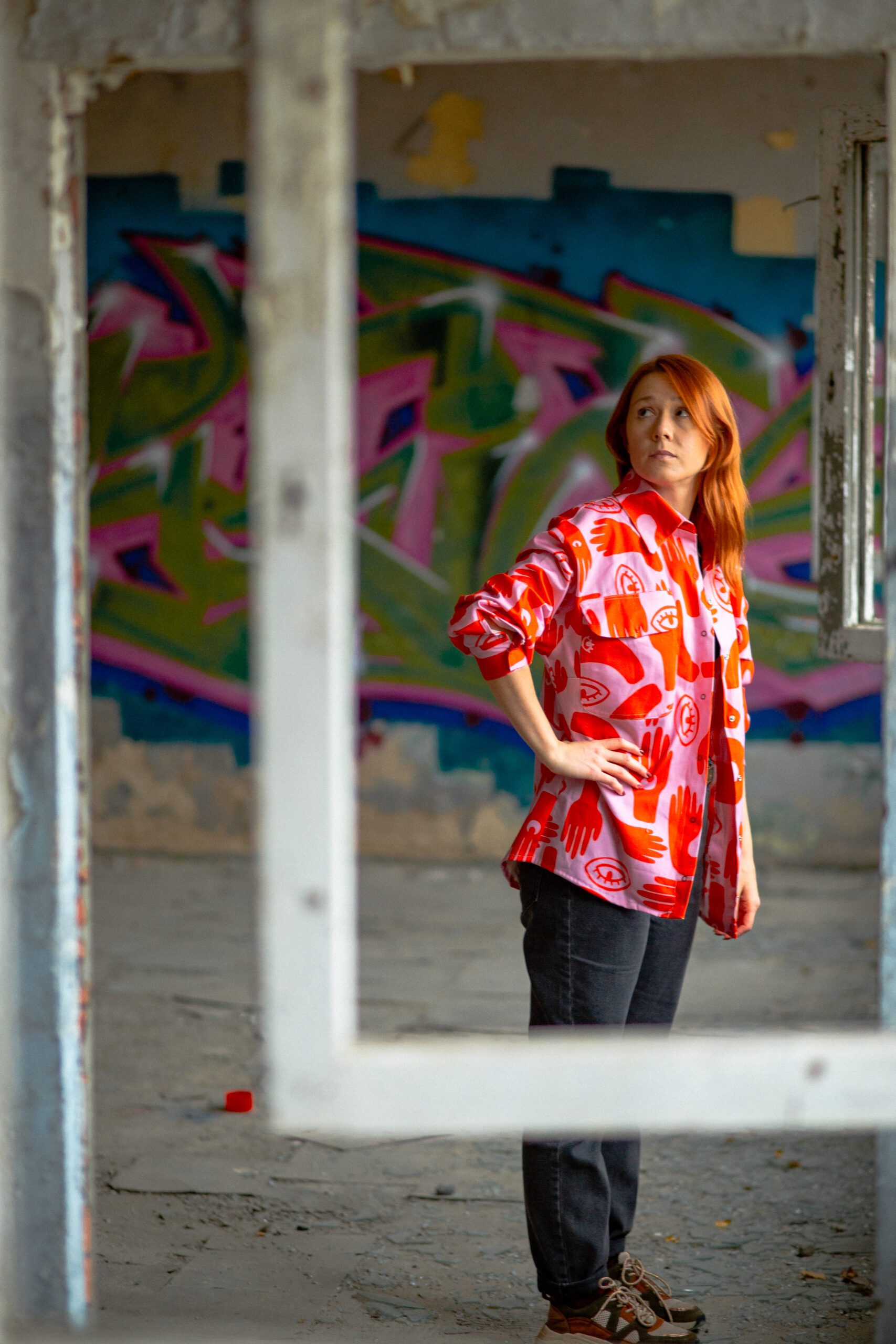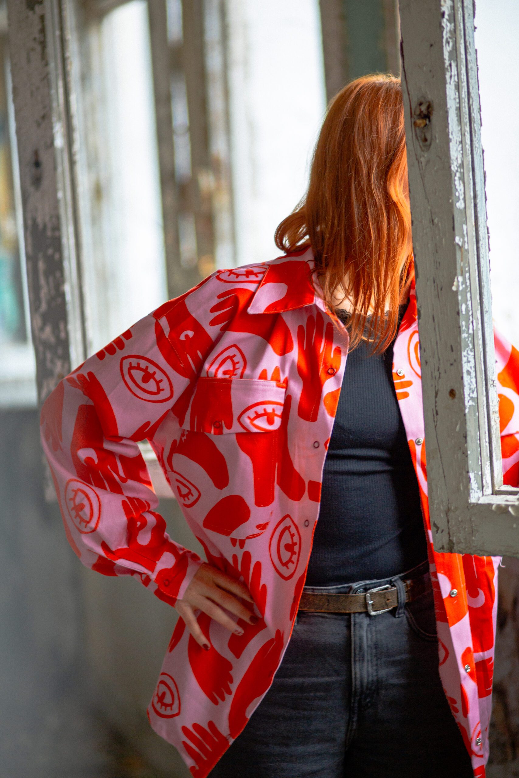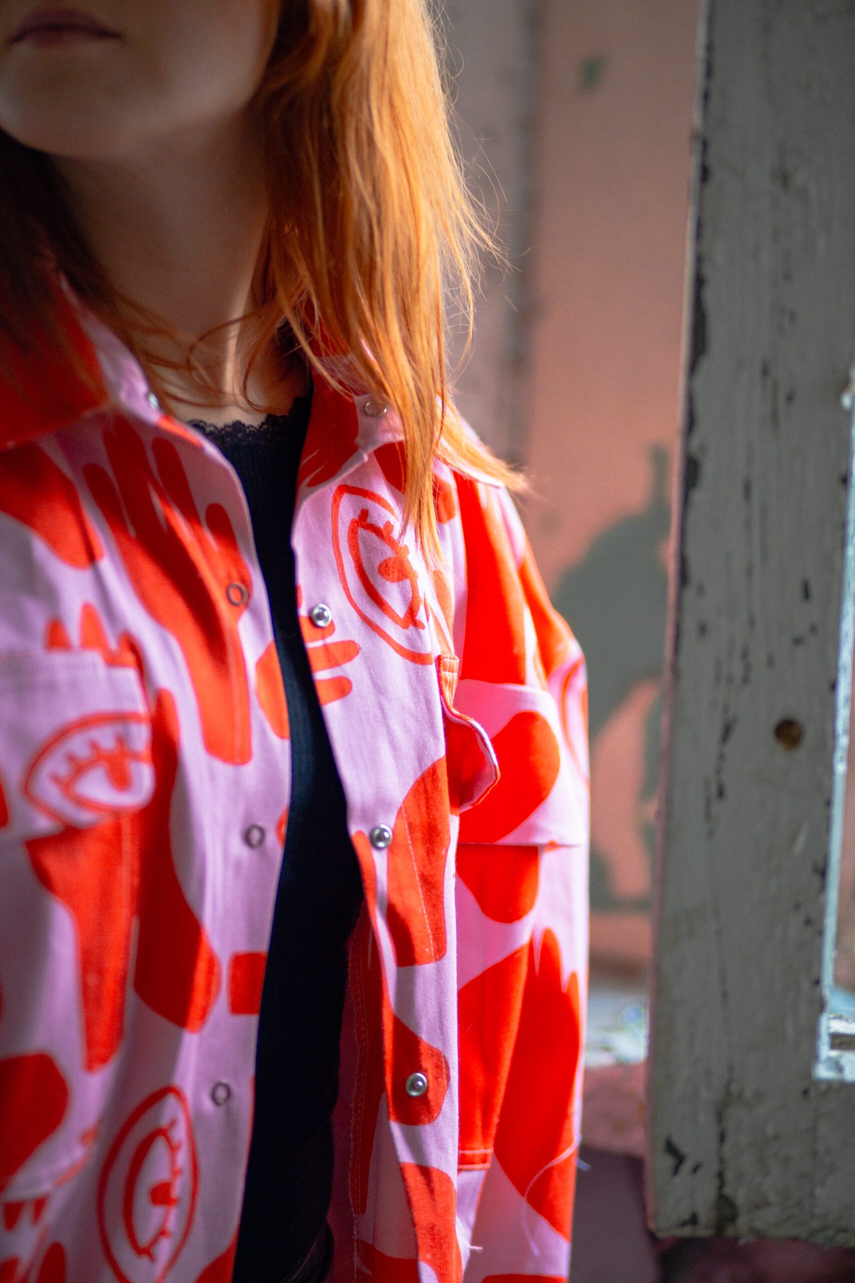 Koszula o kroju oversize, z lekko szerszymi i opadającymi rękawami z mankietem. Posiada duże kieszenie oraz klasyczny kołnierzyk. Zapinana jest z przodu, na zatrzaski*. Koszula uszyta została z grubszej bawełny, ma strukturę jeansu. Bardzo przyjemna w dotyku. Można ją traktować jako okrycie wierzchnie. Swoim oryginalnym wzorem dodaje charakteru. Możesz poczuć się w niej wyjątkowo.