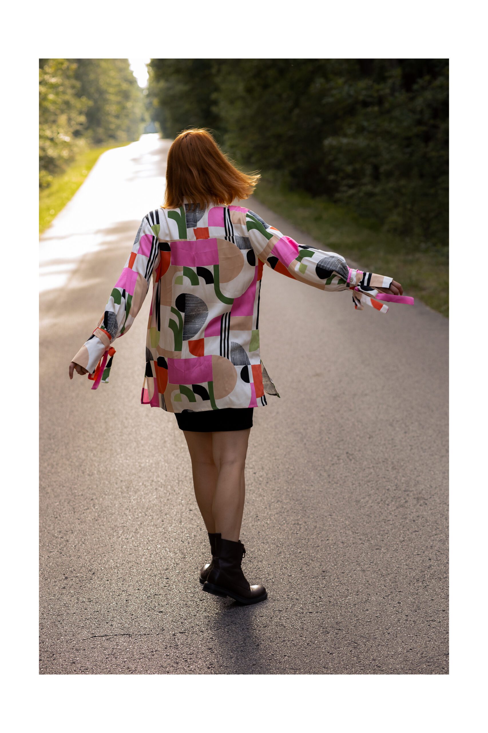 Wykończona dłuższym mankietem na rękawach z ozdobnym paskiem, który go przeplata.