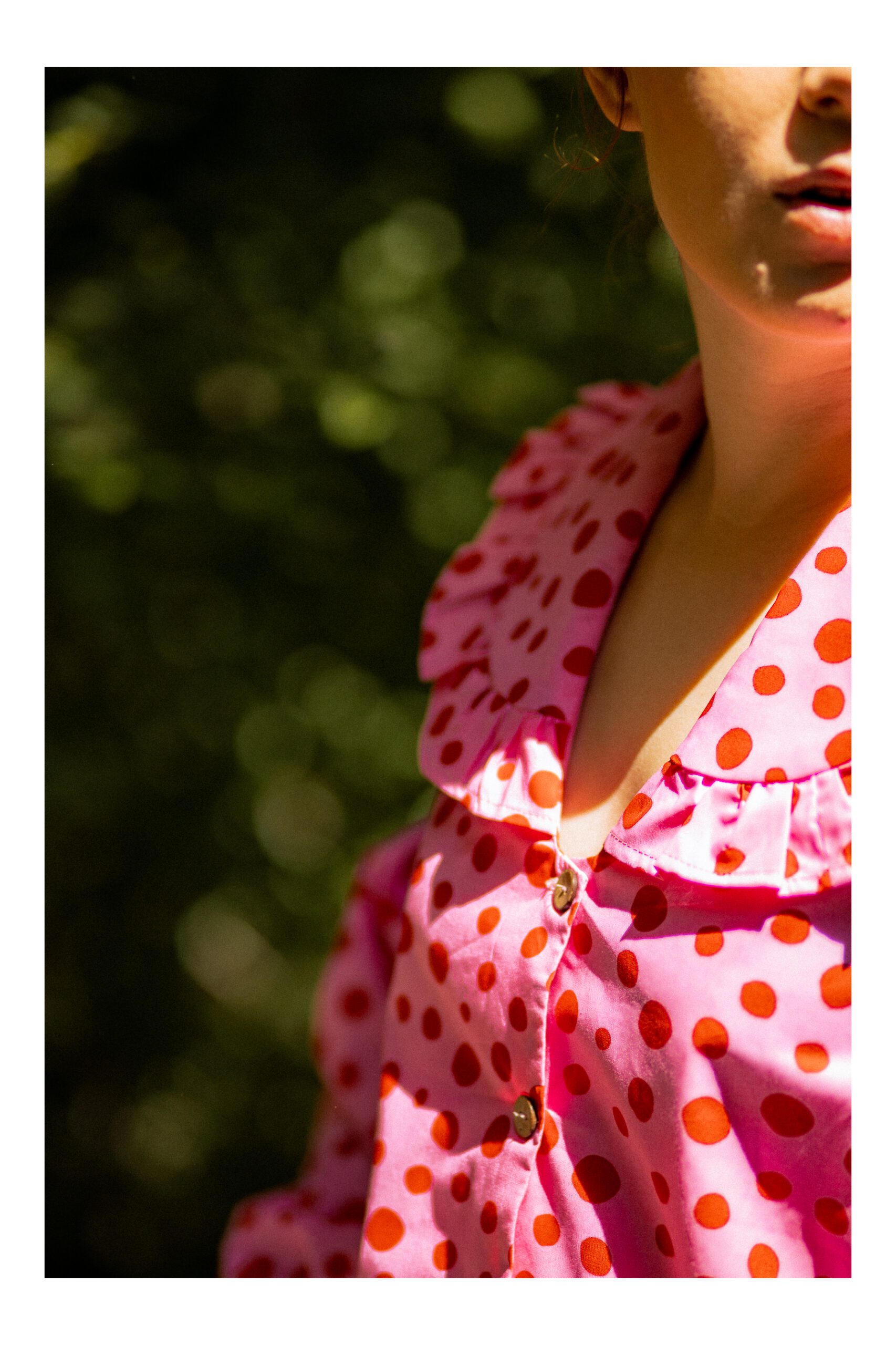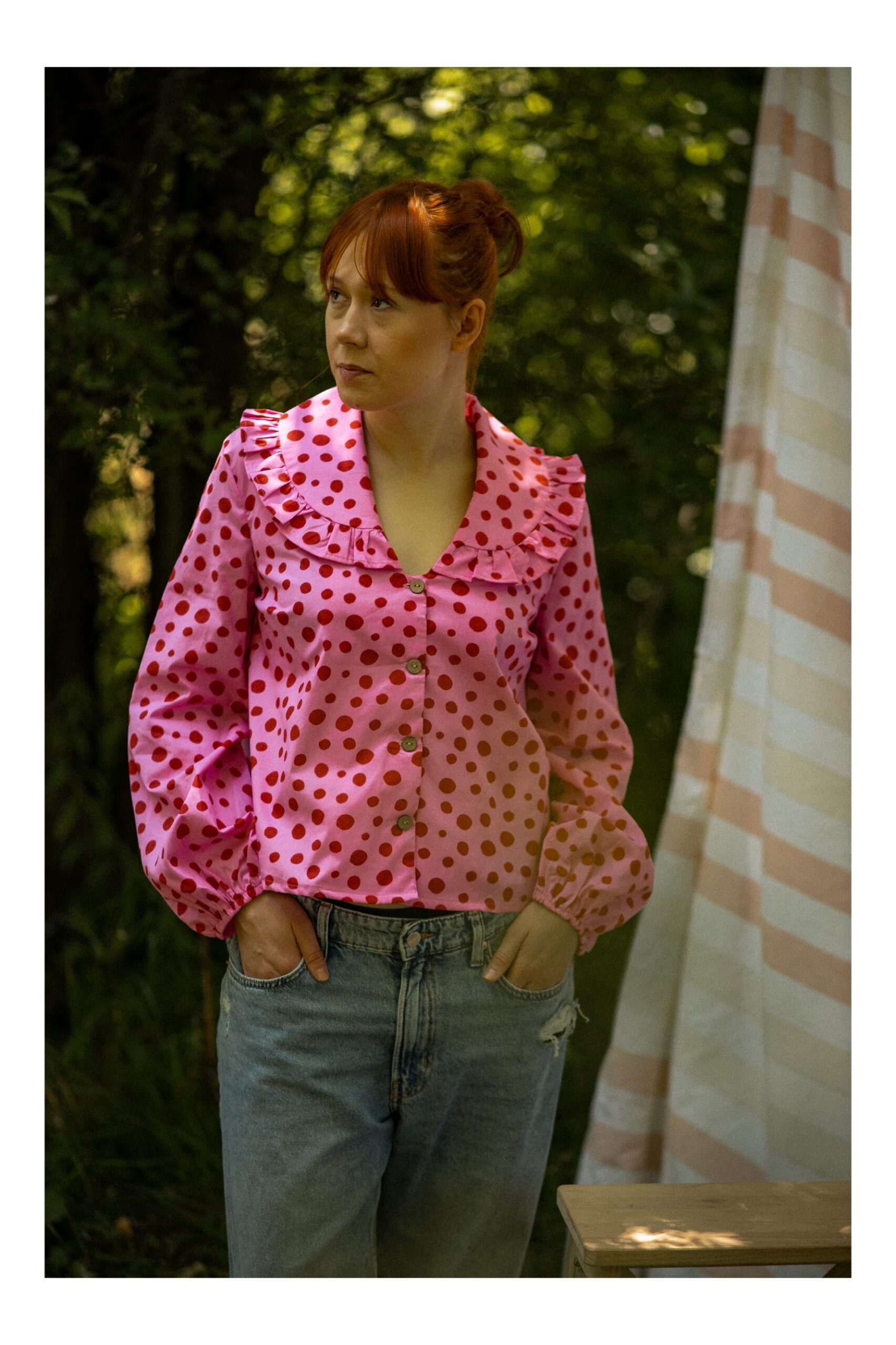Modelka na zdjęciu ma 164cm wzrostu i rozmiar koszuli M.