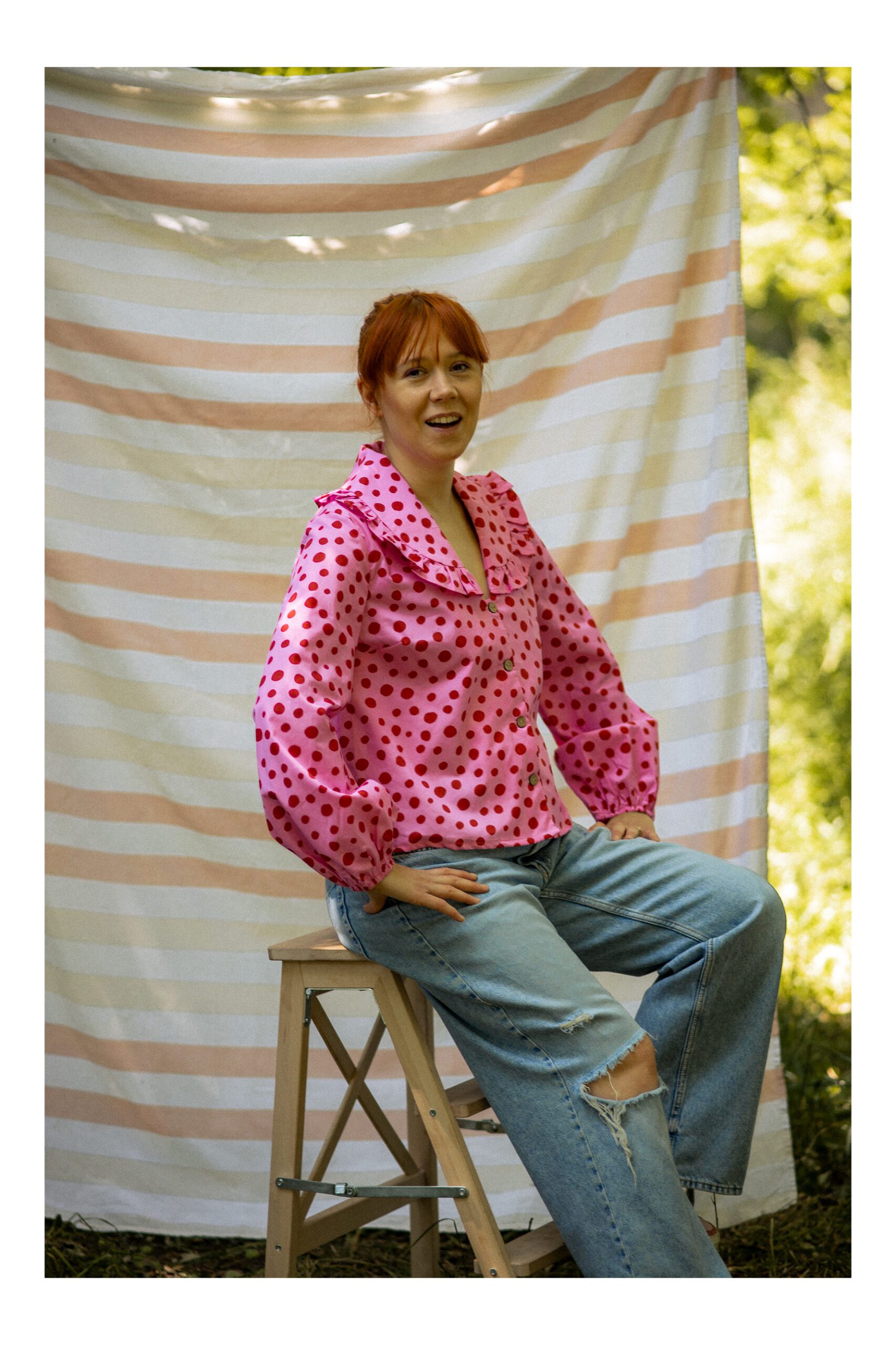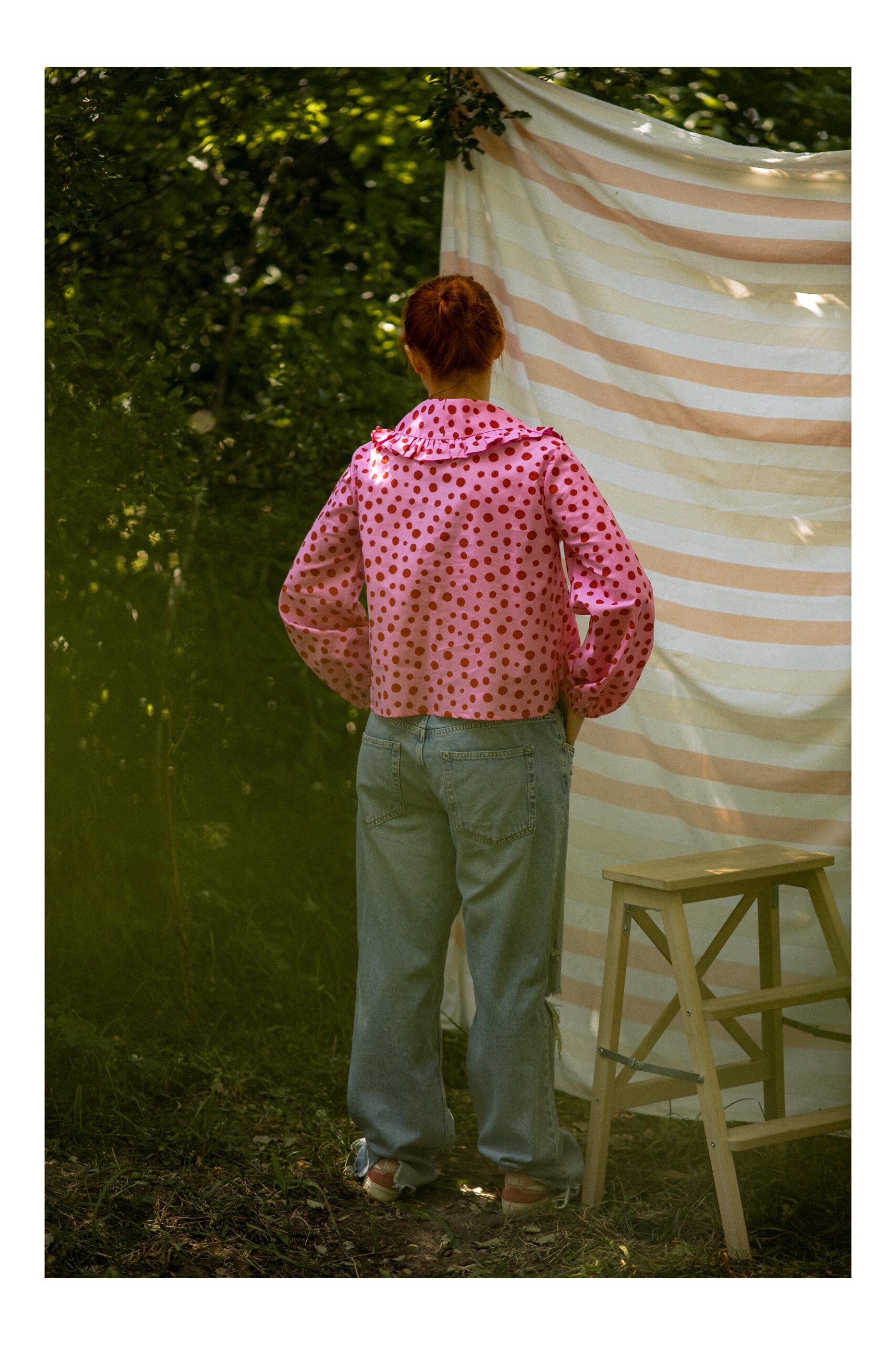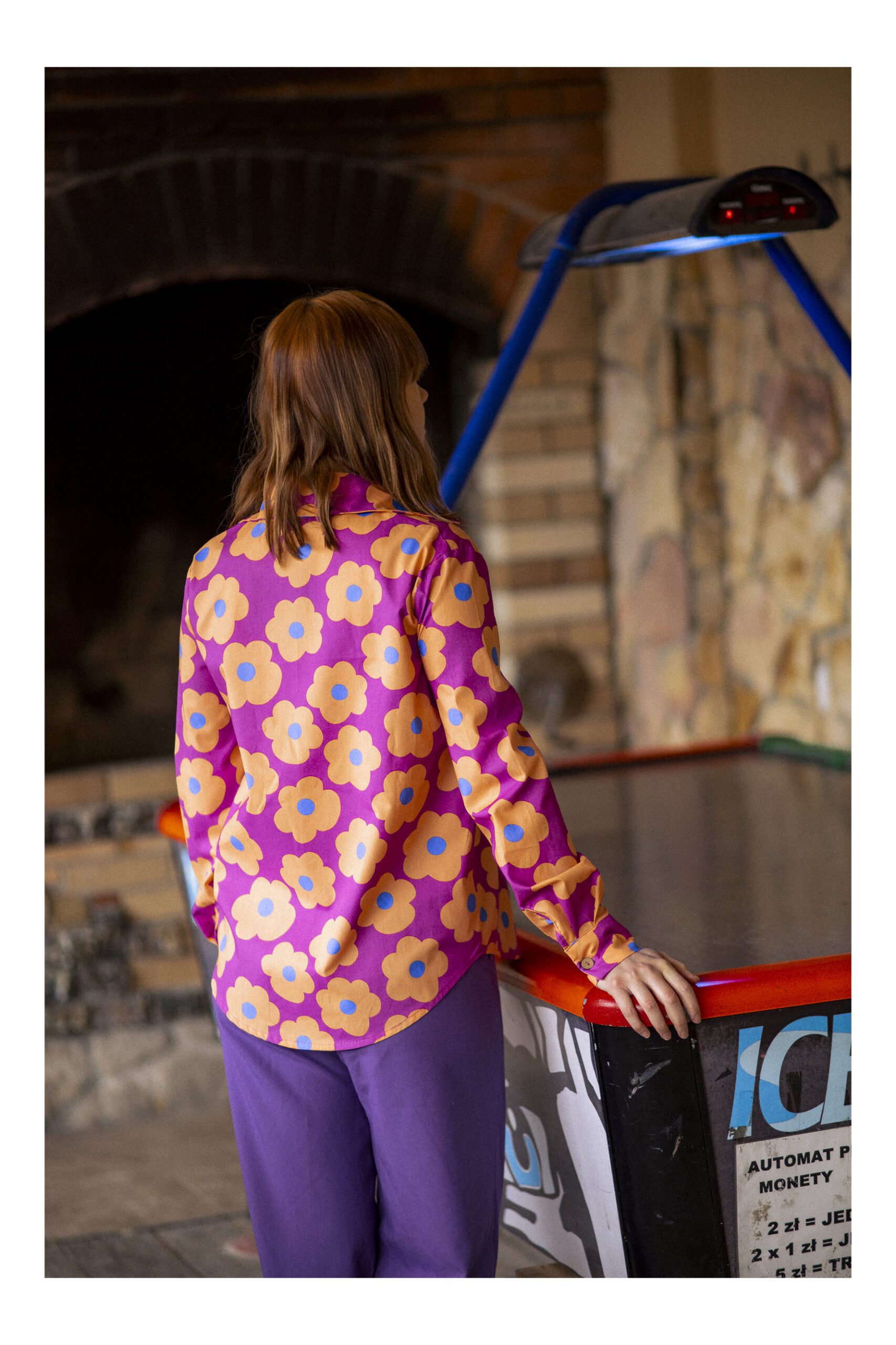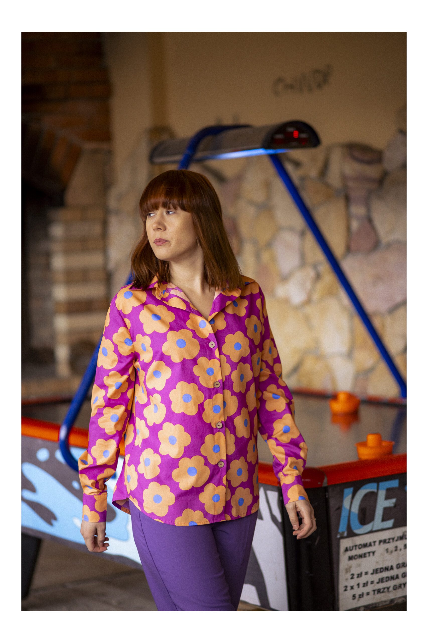 Stylowa koszula, uszyta z wysokiej jakości bawełny. Krój koszuli jest prosty, o luźnym kroju. Wyróżnia ją duży kołnierz wykończony falbanką. Rękawy są szersze, co daje swobodę ruchów, są lekko bufiaste, wykończone gumką. Koszula stworzona dla ludzi ceniących wygodę oraz oryginalność. Wzór na koszuli dodaje jej uroku i charakteru.