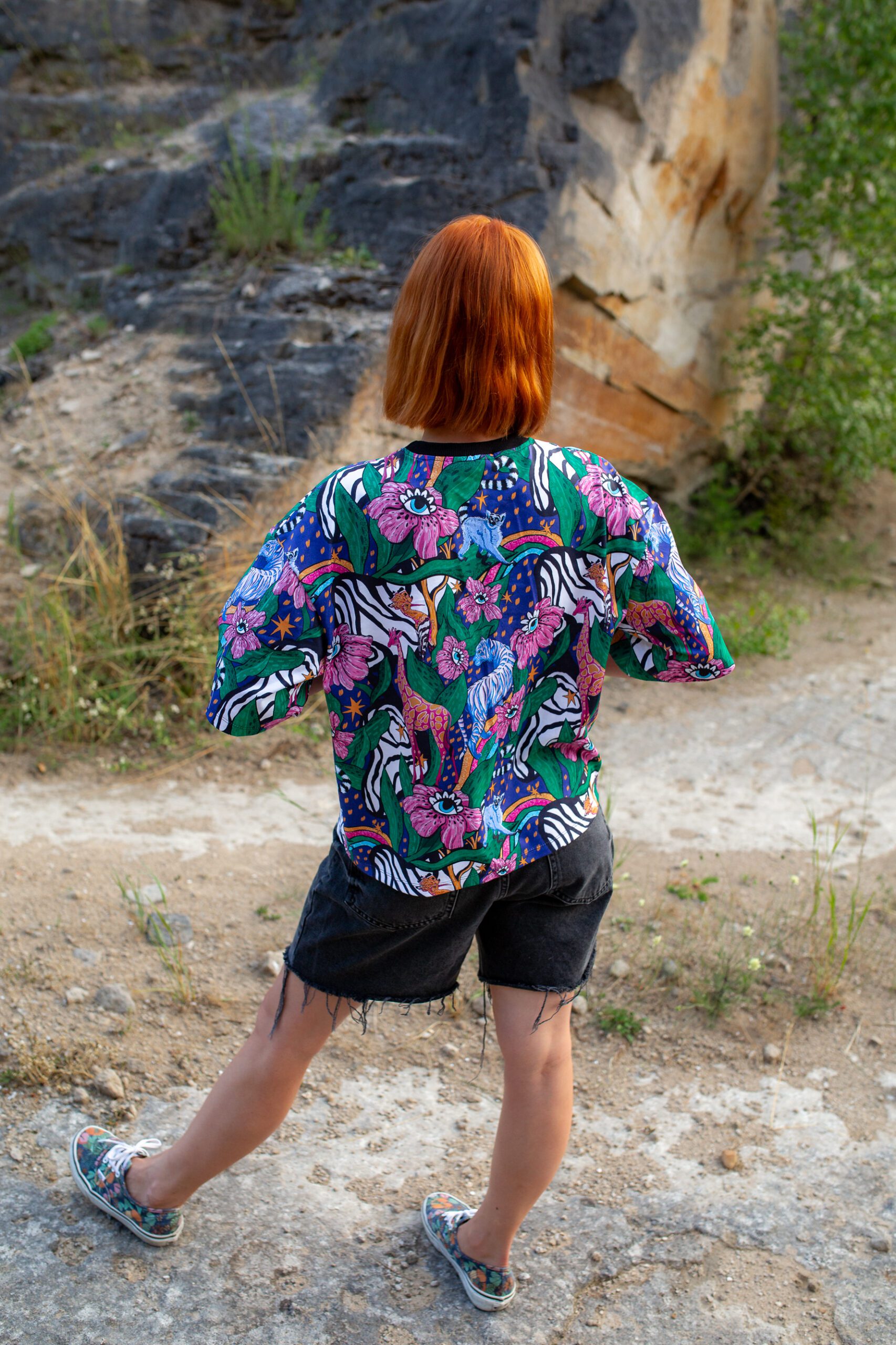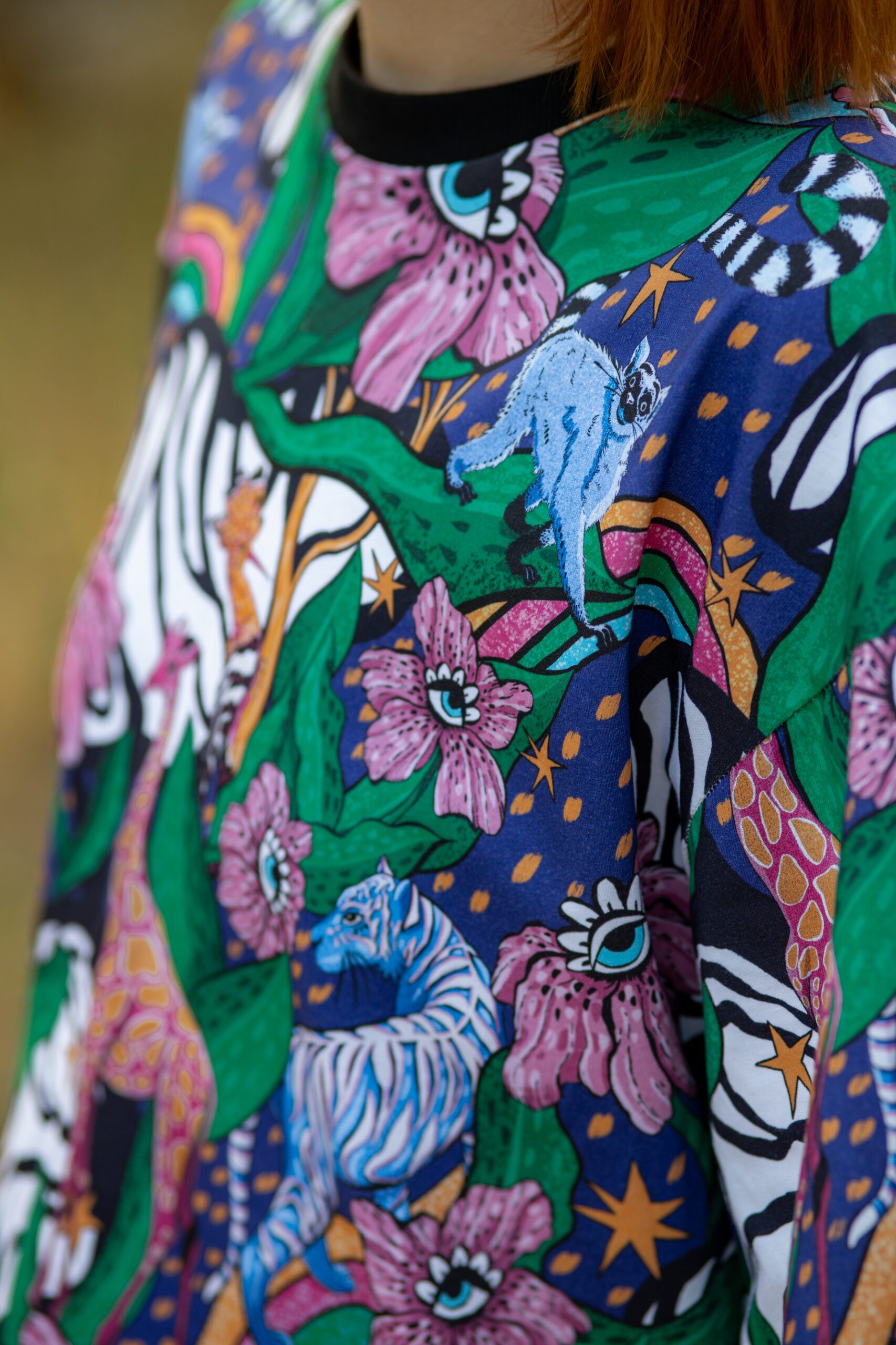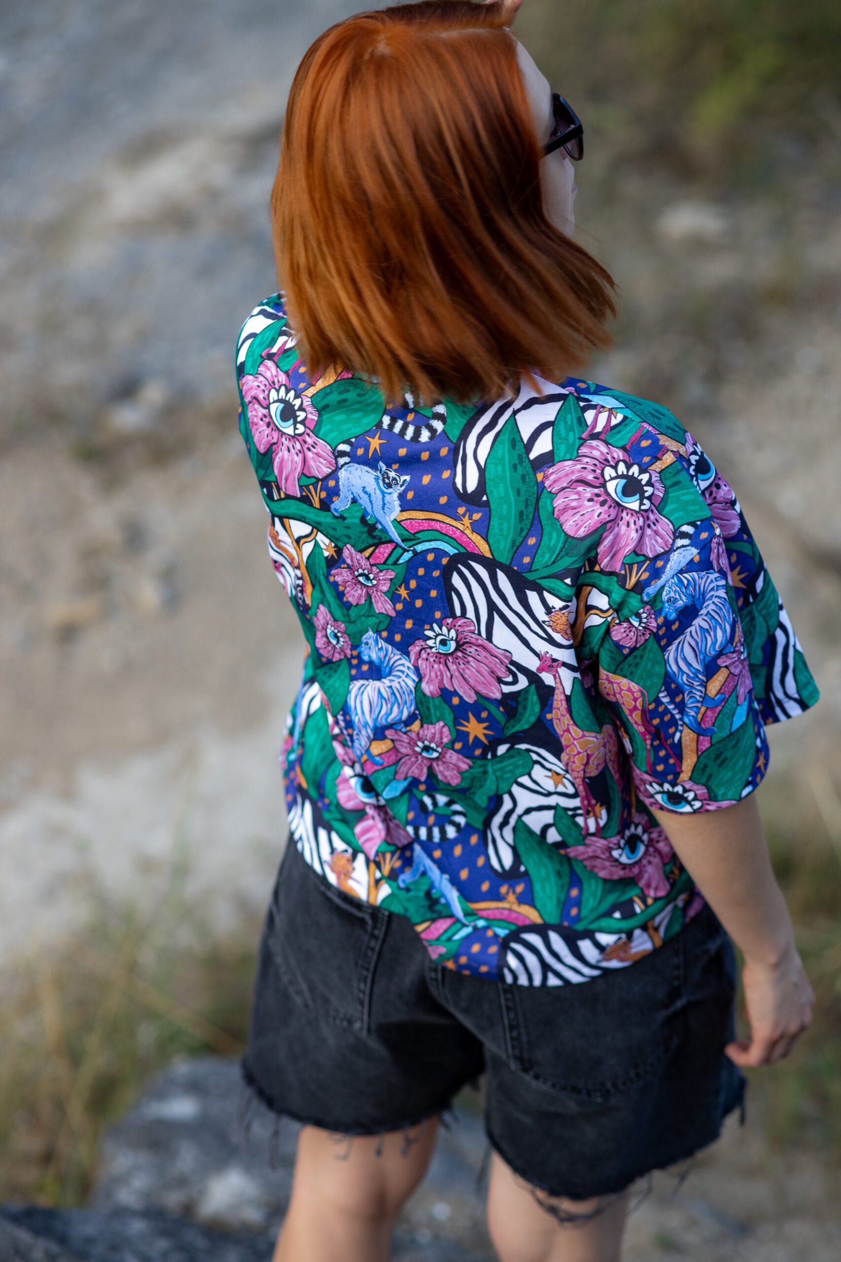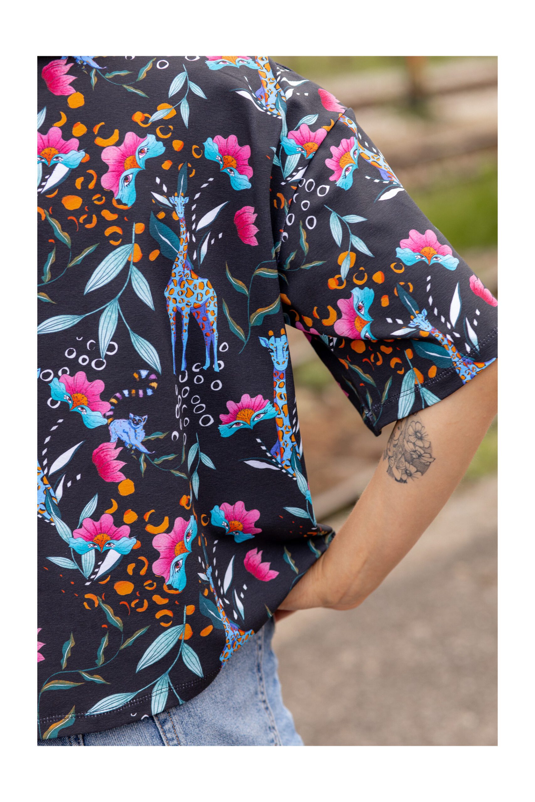 Wzór na koszulce zaprojektowany jest na wyłączność dla ŻE-CO. Znajdziemy na nim sporo zwierząt, abstrakcyjną roślinność, wszystko to w mocnych, odważnych kolorach.  Nadruk jest trwały i nie spiera się. Koszulka zdecydowanie ma charakter, a przede wszystkim jest mega wygodna.