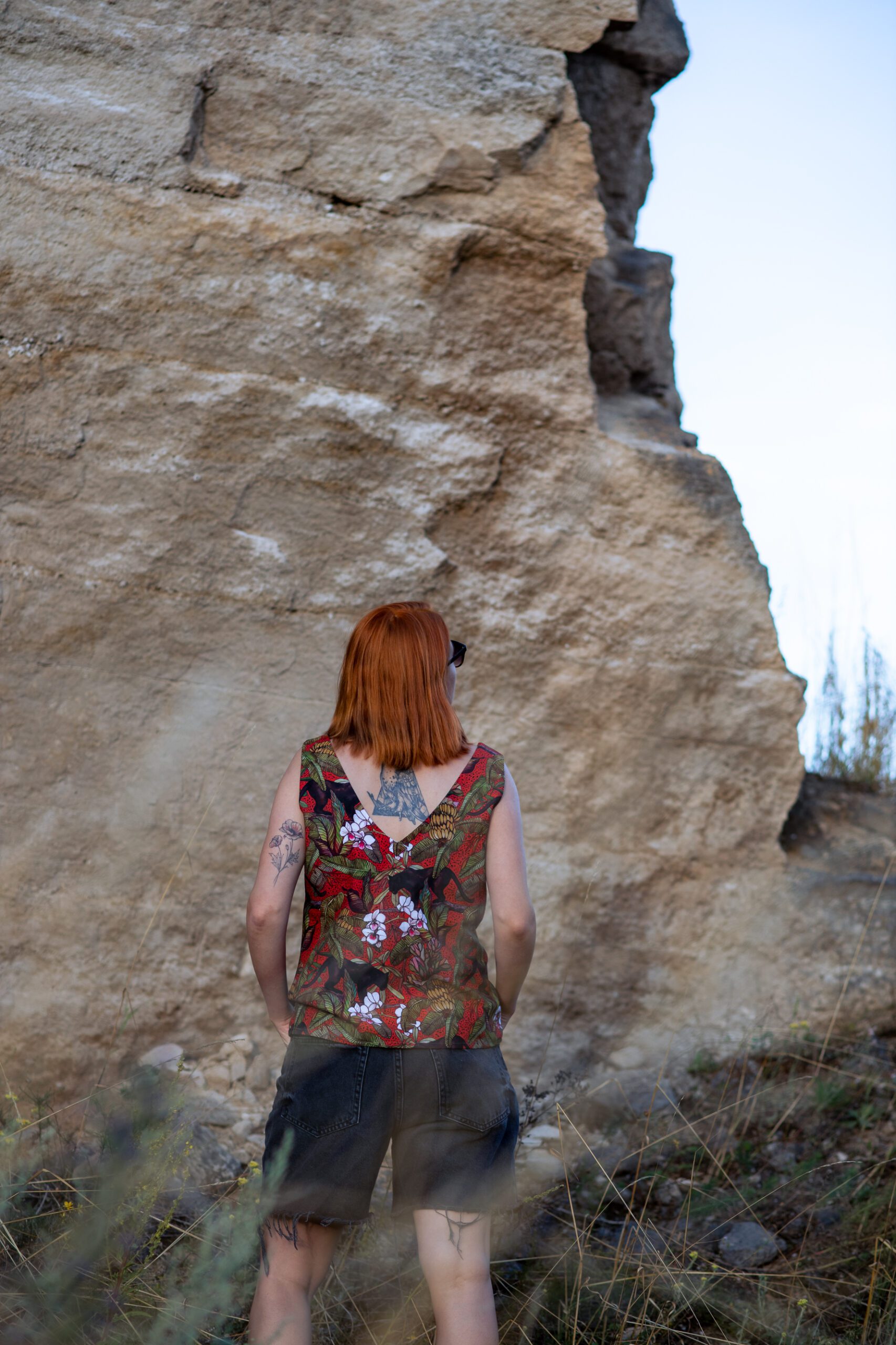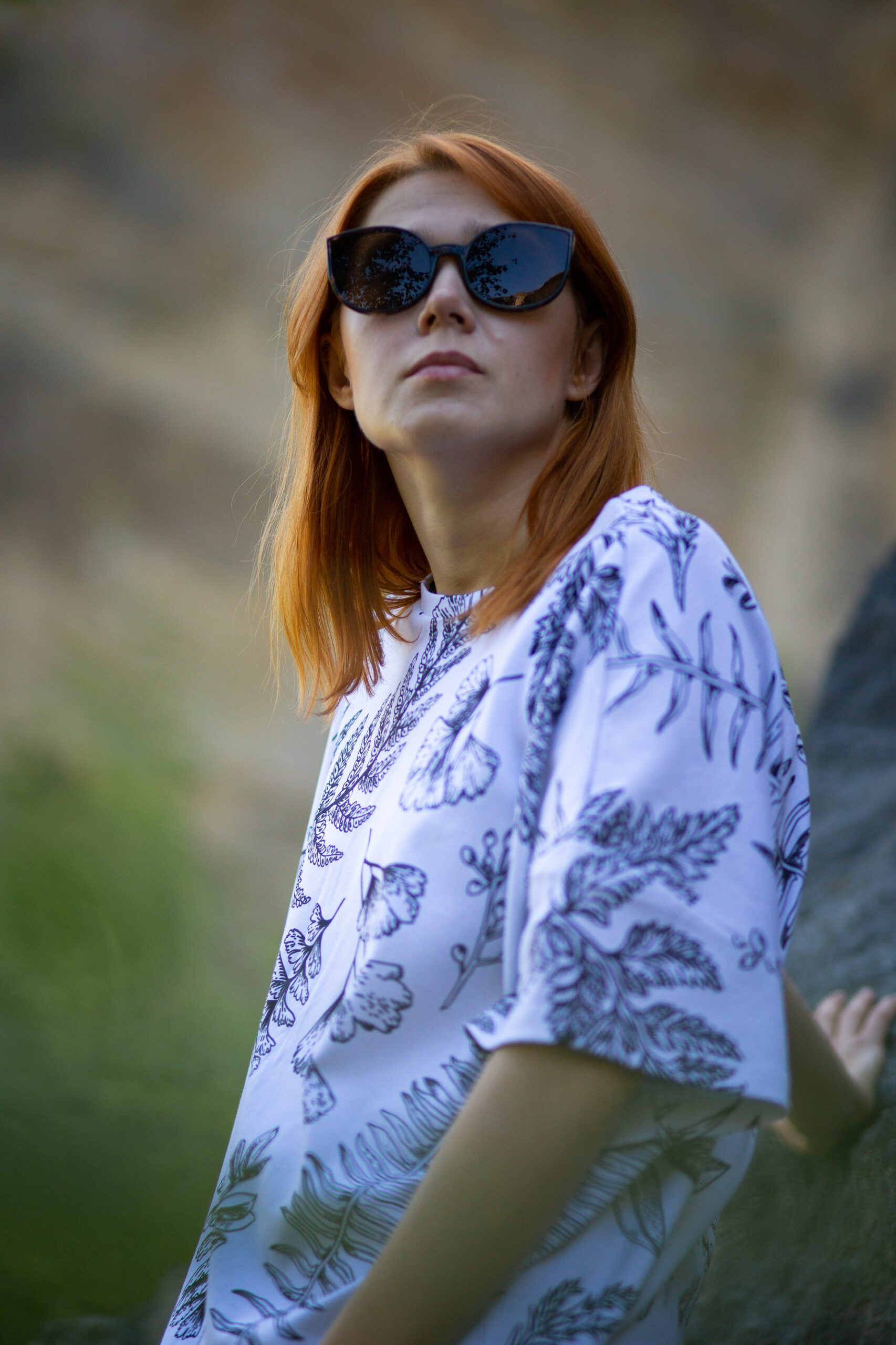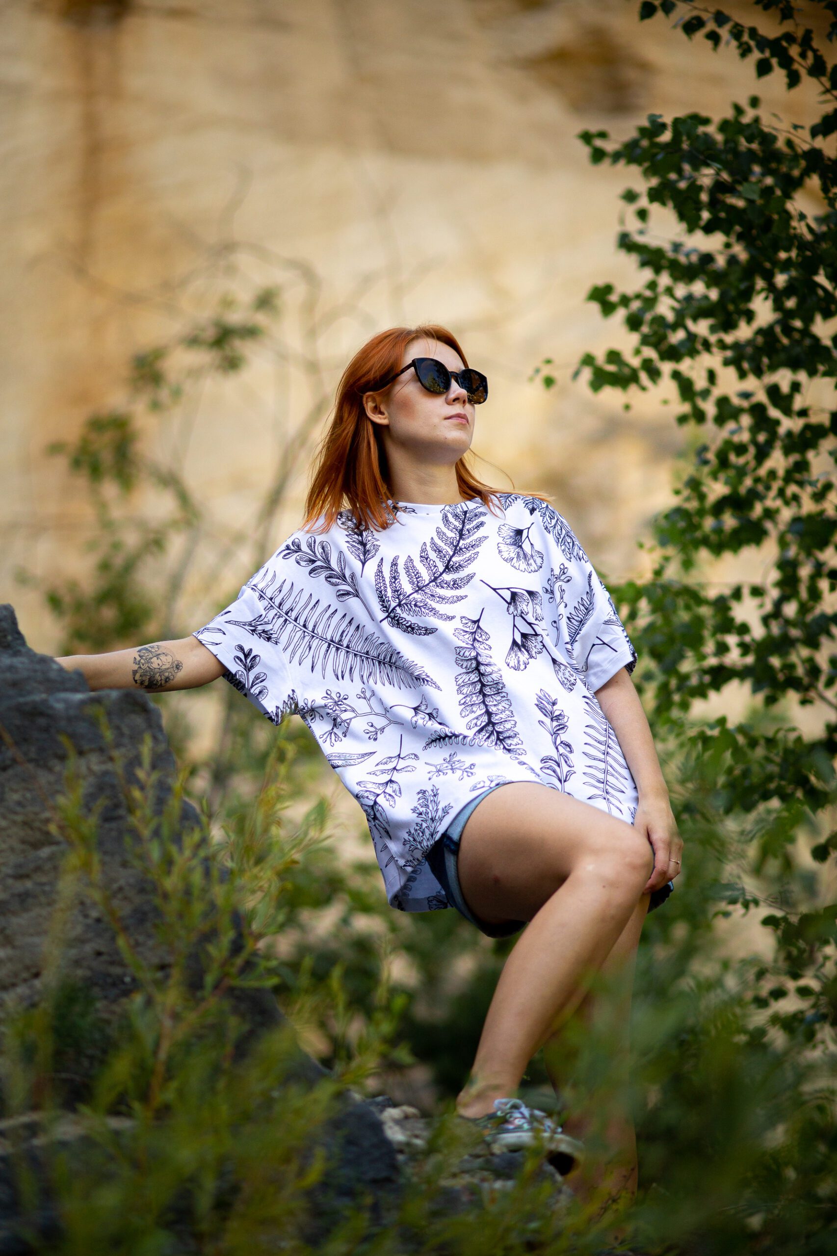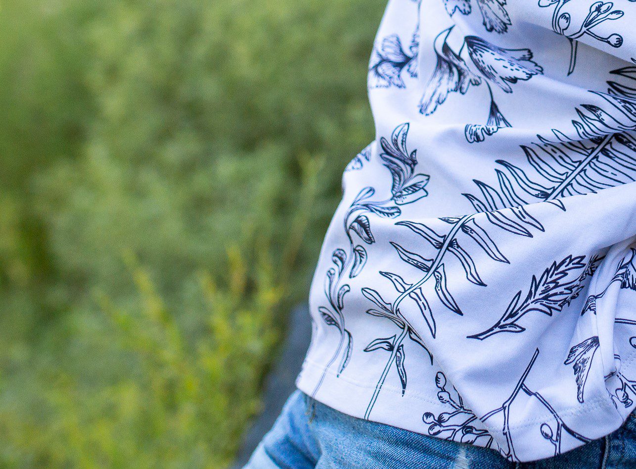 Koszulka jest koloru białego w duże paprocie oraz inne rośliny. Motyw kojarzony z lasem.