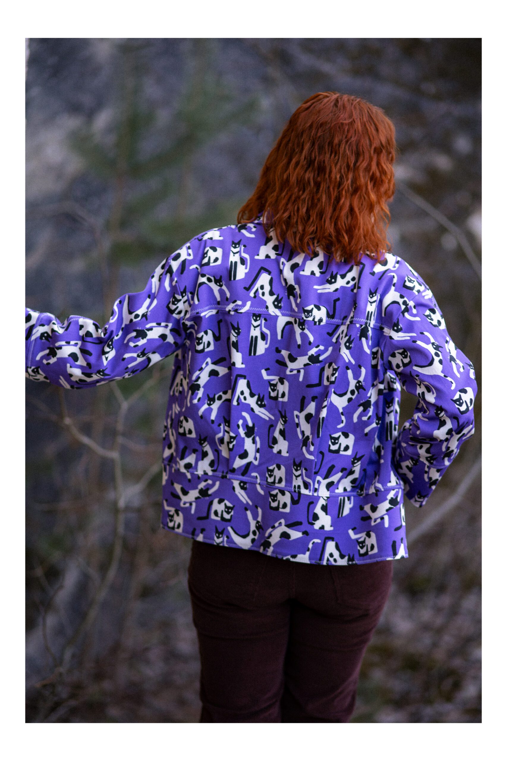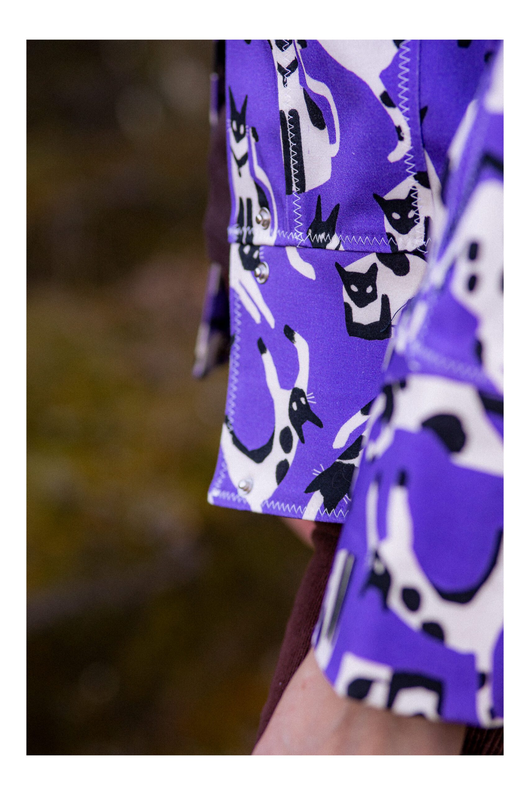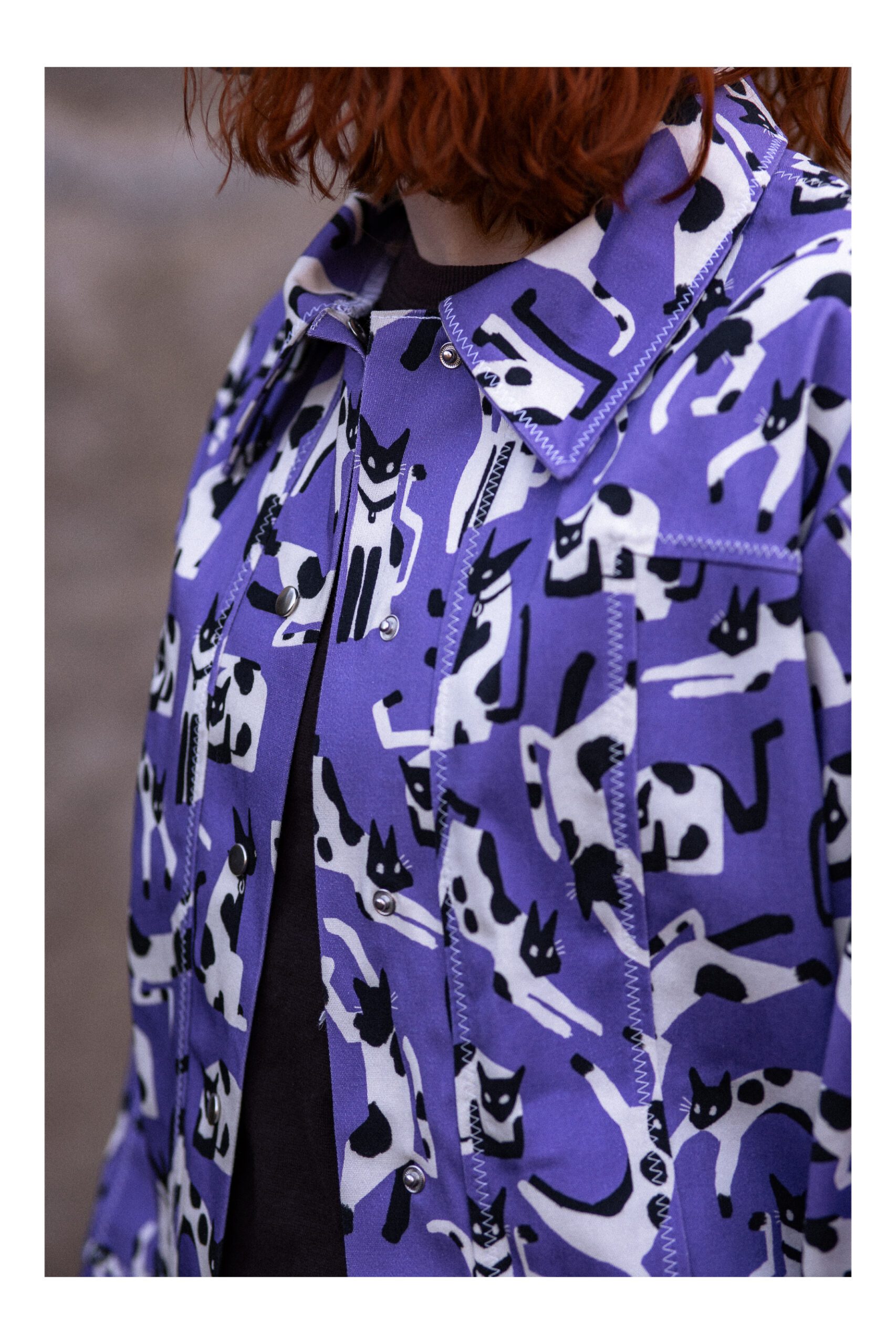 Ta kurtka to połączenie swobody, wyrazistego wzoru i dopracowanego rzemiosła. Uszyta z fioletowej tkaniny  z motywem kotów, przyciąga uwagę, ale jednocześnie pozostaje lekka i łatwa do noszenia na co dzień.