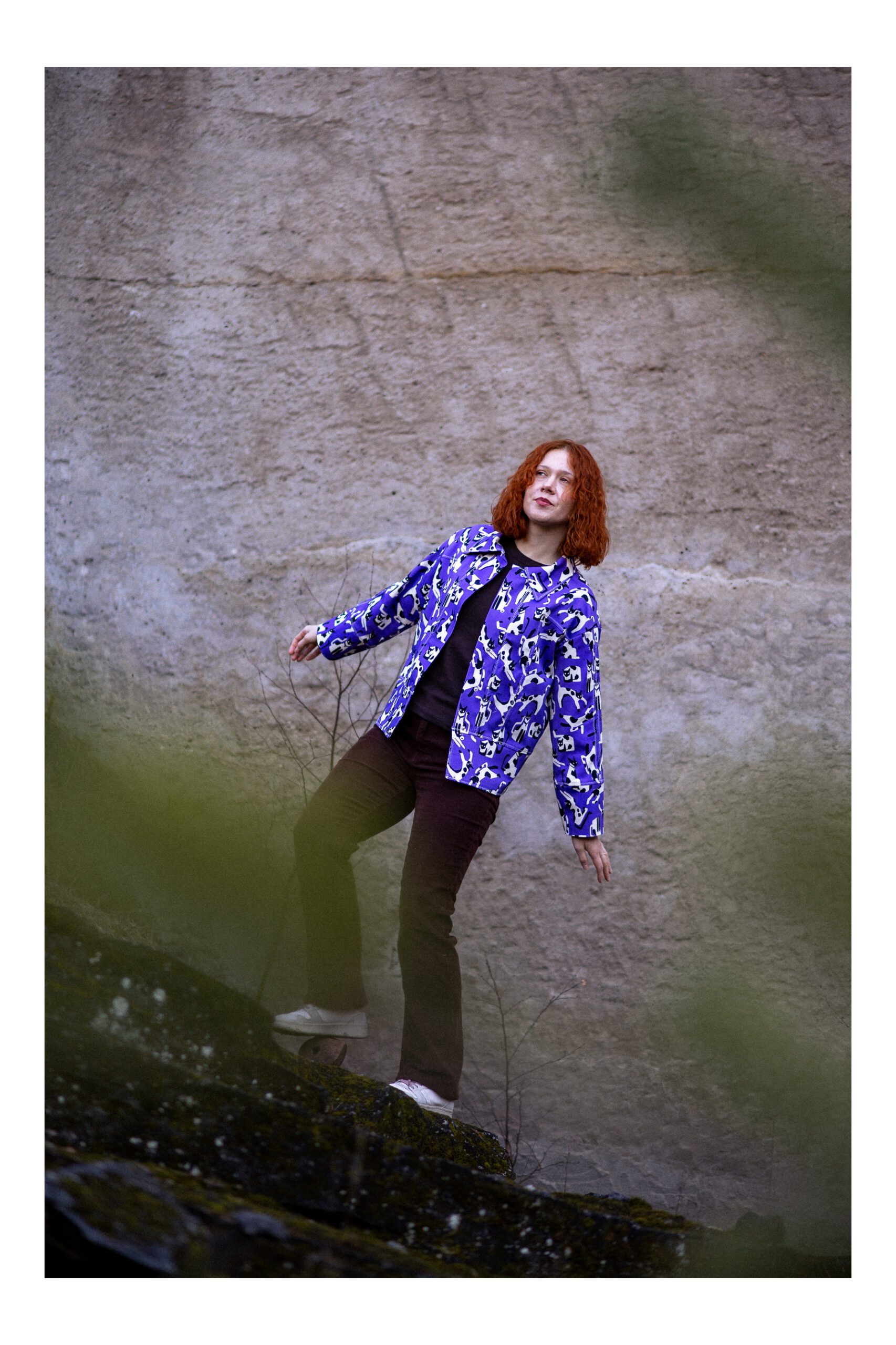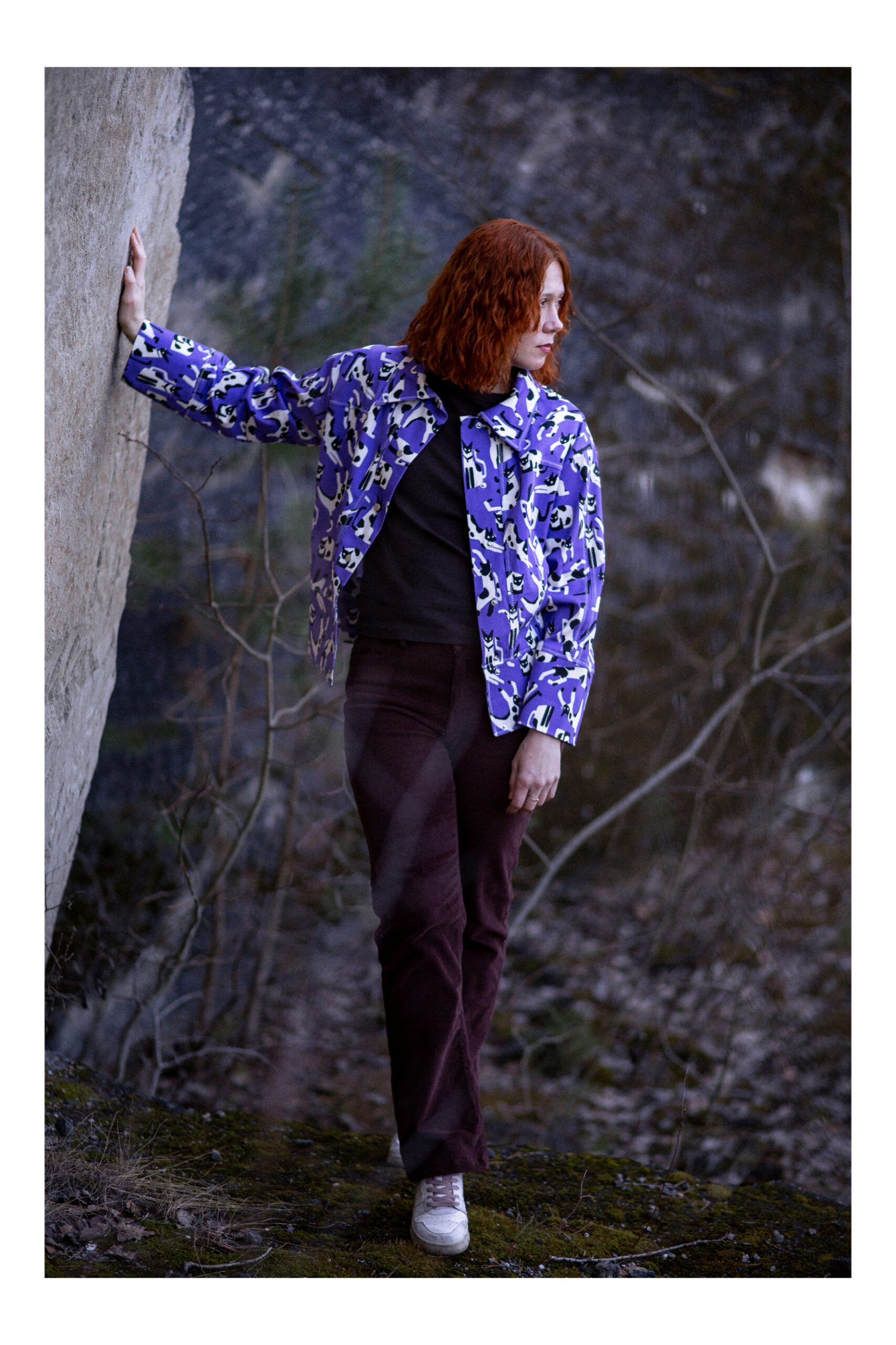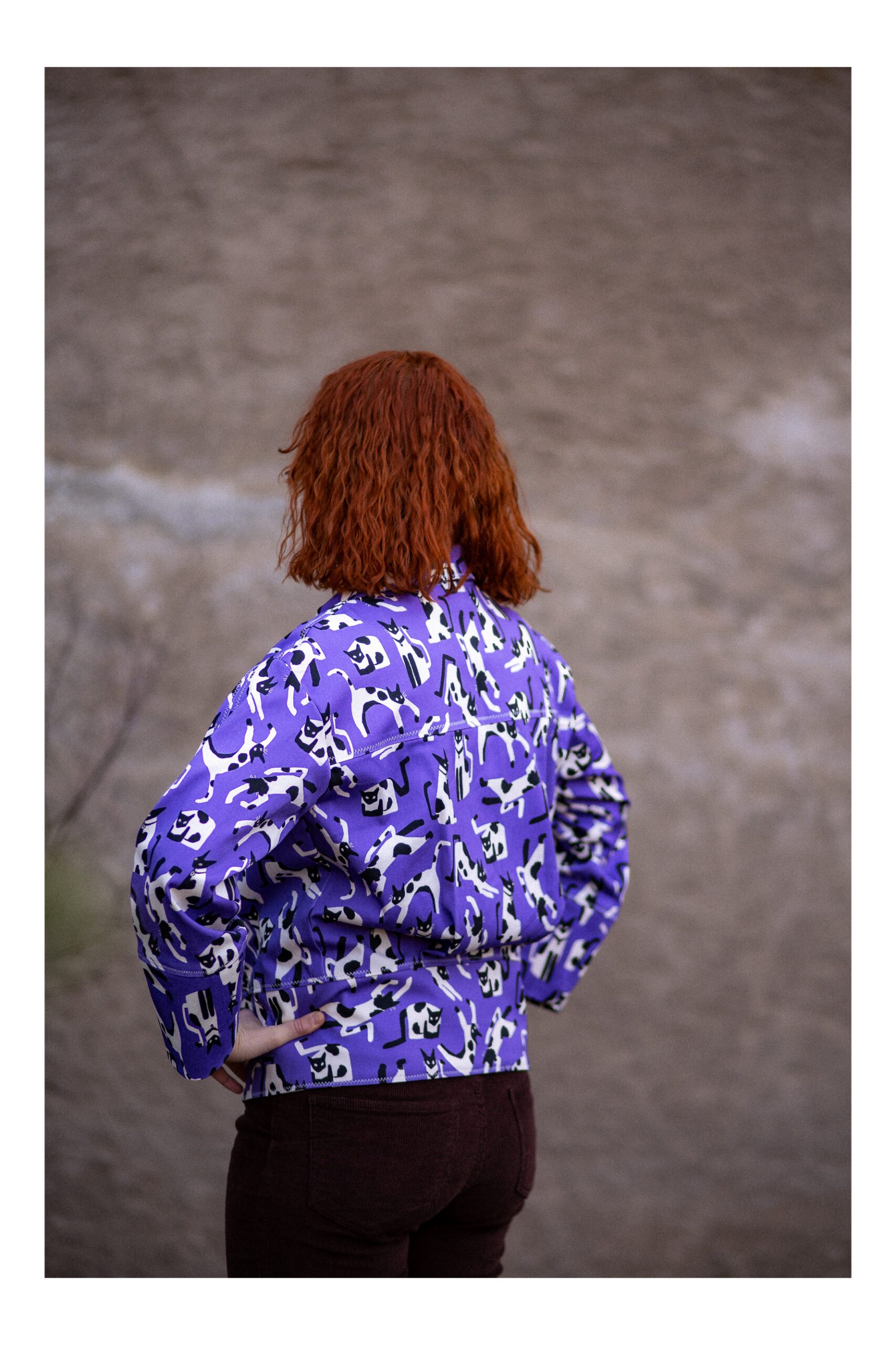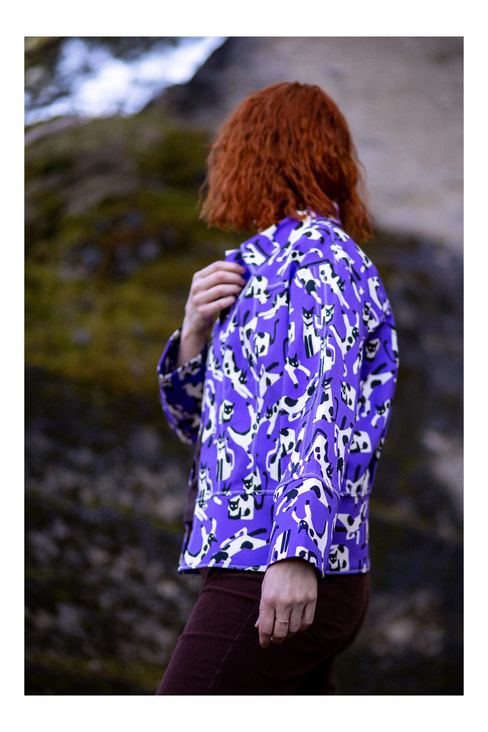 Ta kurtka to połączenie swobody, wyrazistego wzoru i dopracowanego rzemiosła. Uszyta z fioletowej tkaniny  z motywem kotów, przyciąga uwagę, ale jednocześnie pozostaje lekka i łatwa do noszenia na co dzień.