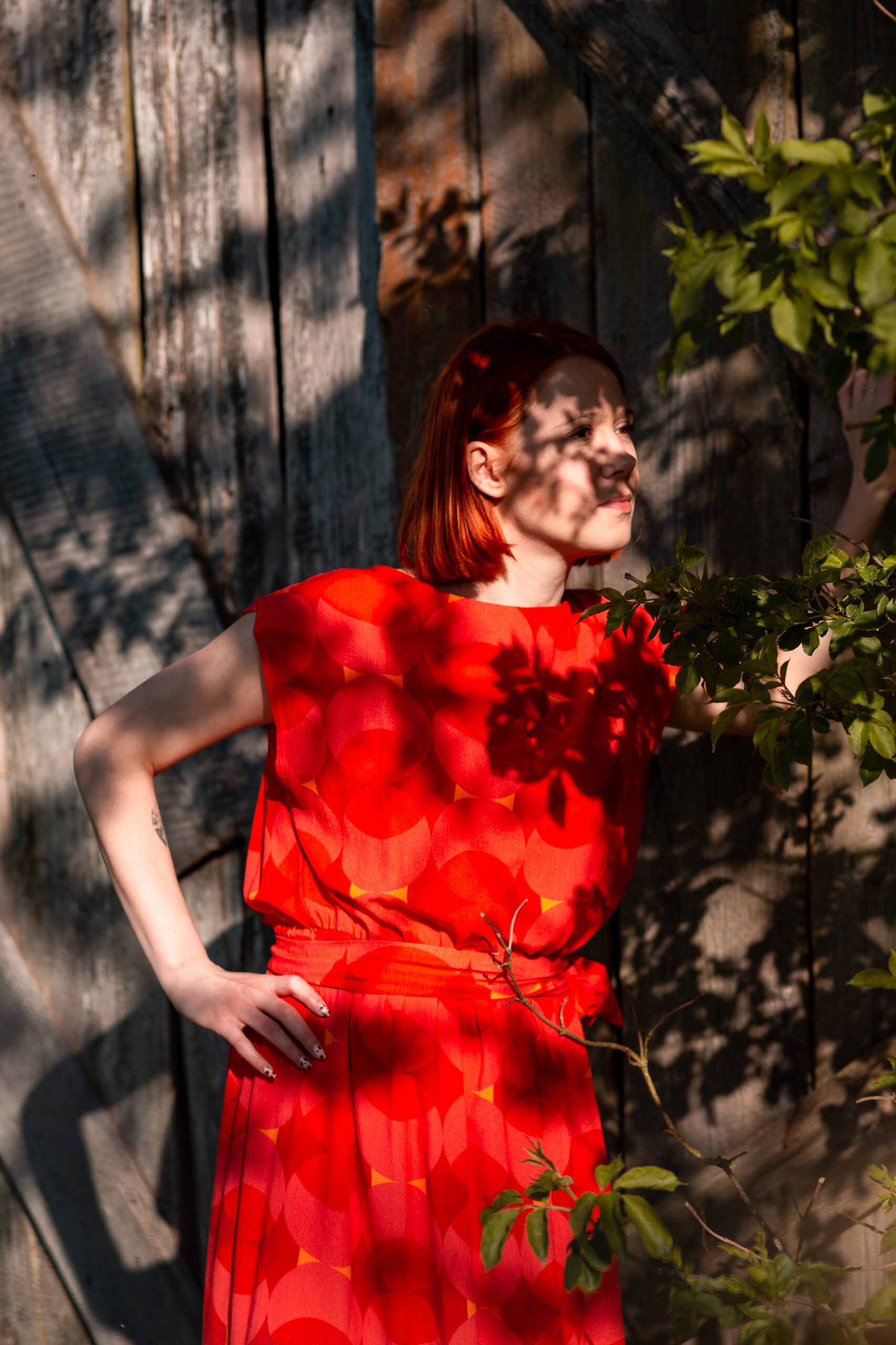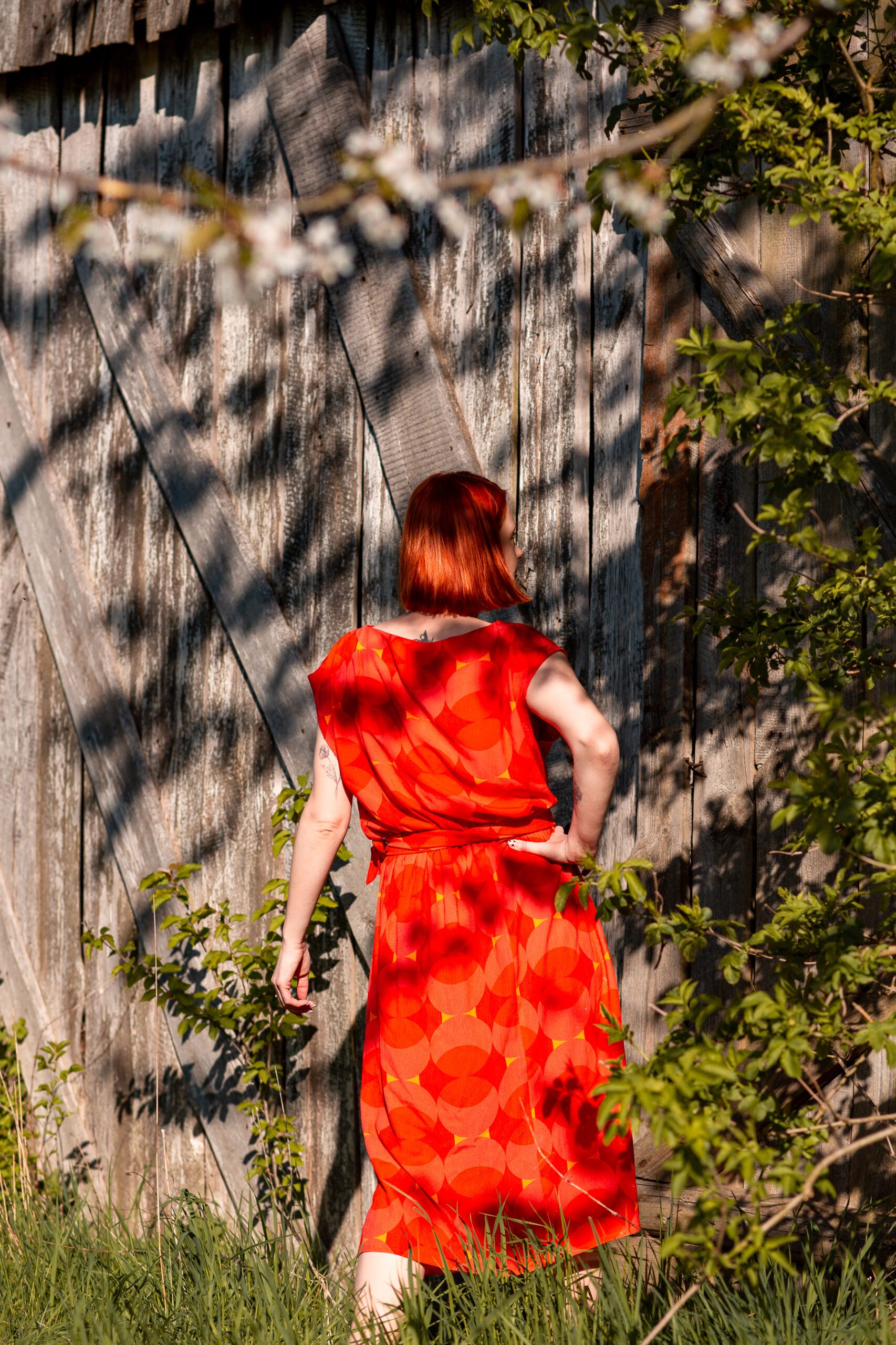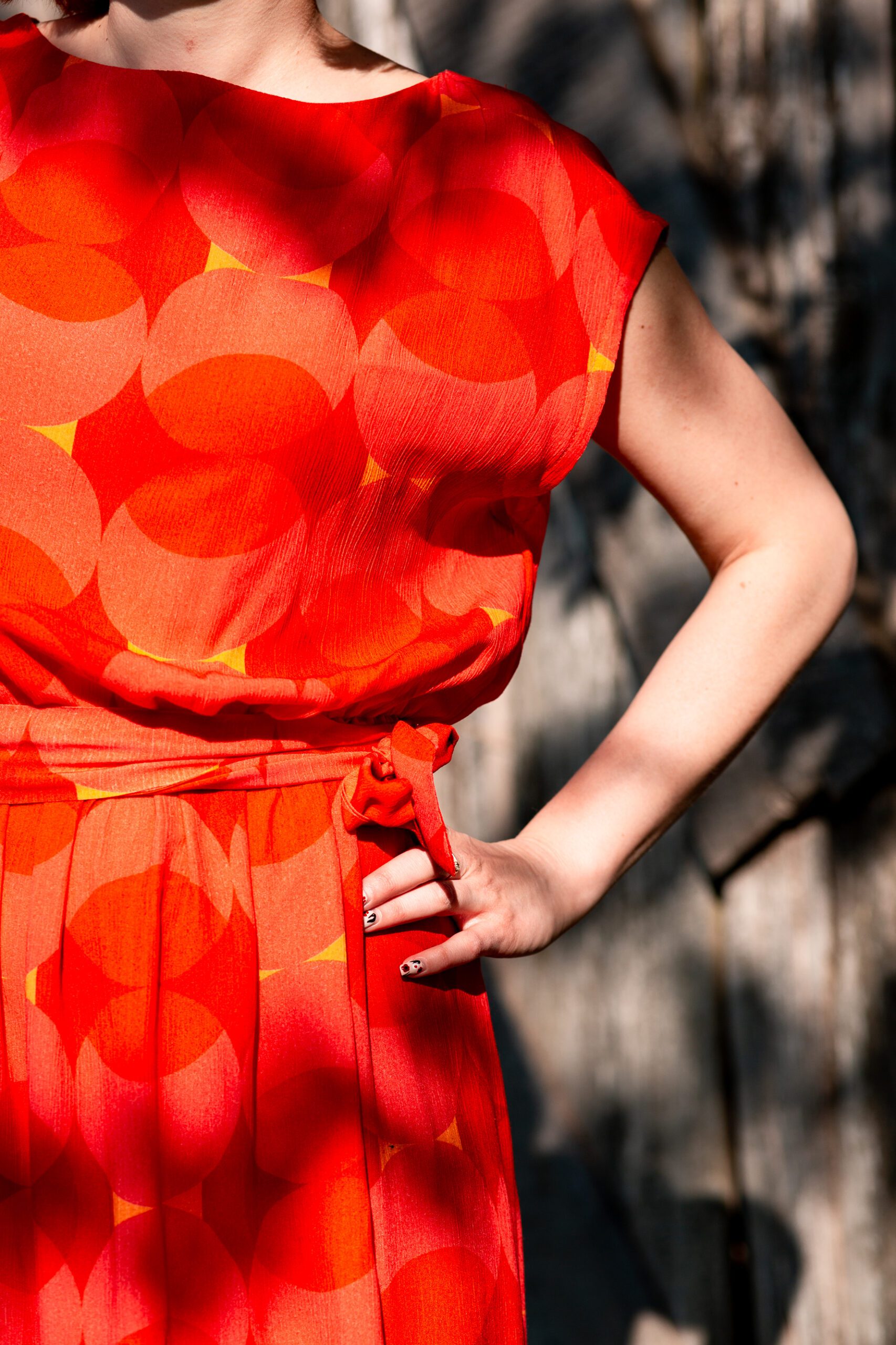Sukienka o prostym, luźnym kroju, z dekoltem w tzw. łódeczkę. Posiada lekko opadający rękaw. Sukienka w pasie wszytą ma gumkę, aby podkreślić bardziej talię można przewiązać ją paskiem. Wzór to duże, czerwone koła. Sukienka jest bardzo miękka i miła w dotyku, uszyta z wiskozy ecovero, tzn. że powstaje z mniejszym, negatywnym wpływem człowieka na środowisko niż standardowy materiał wiskozowy. Jest niesamowicie przewiewna, idealna na letnie dni. Może być w wersji zarówno eleganckiej, jak i do codziennego „biegania”.