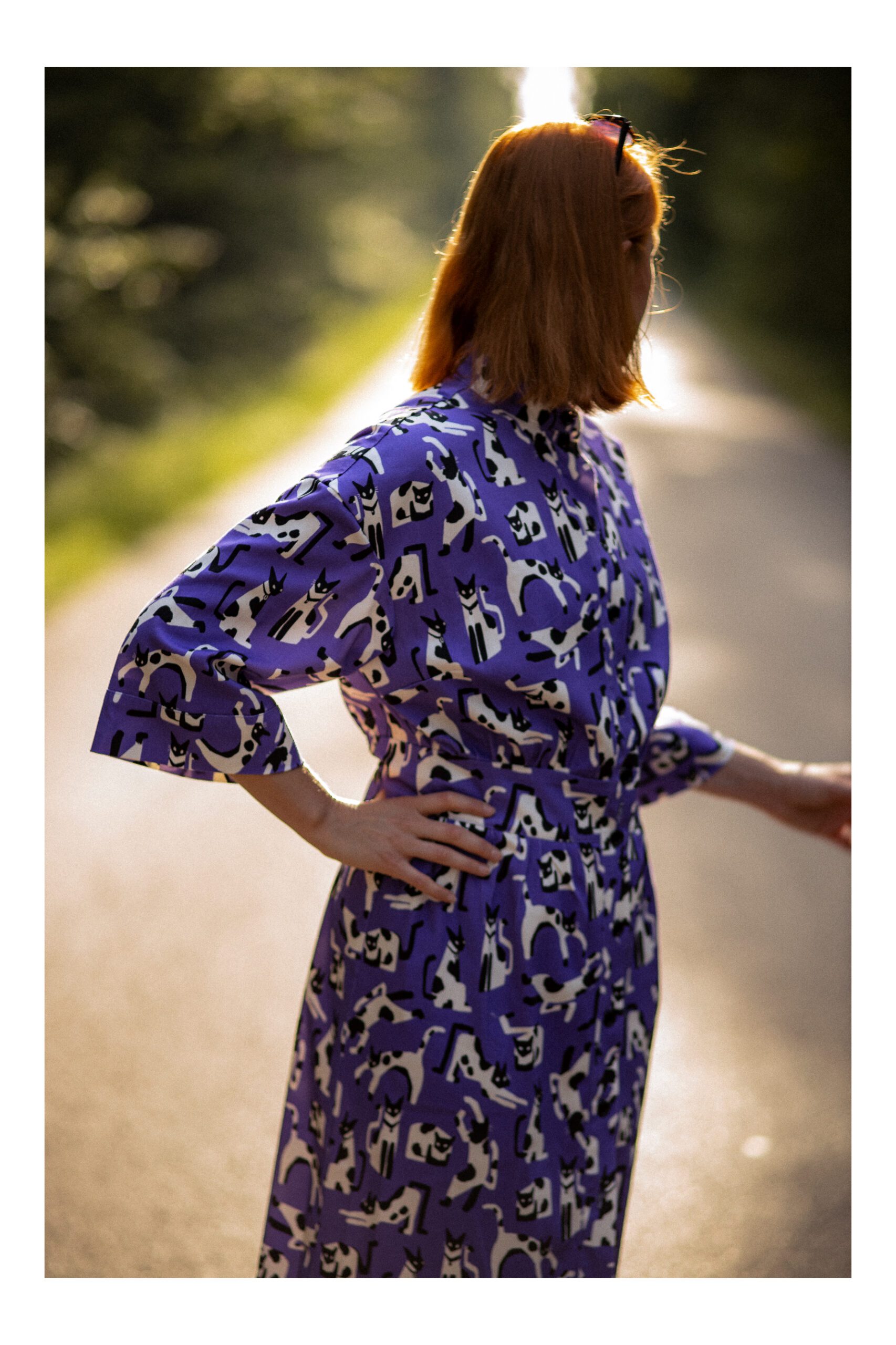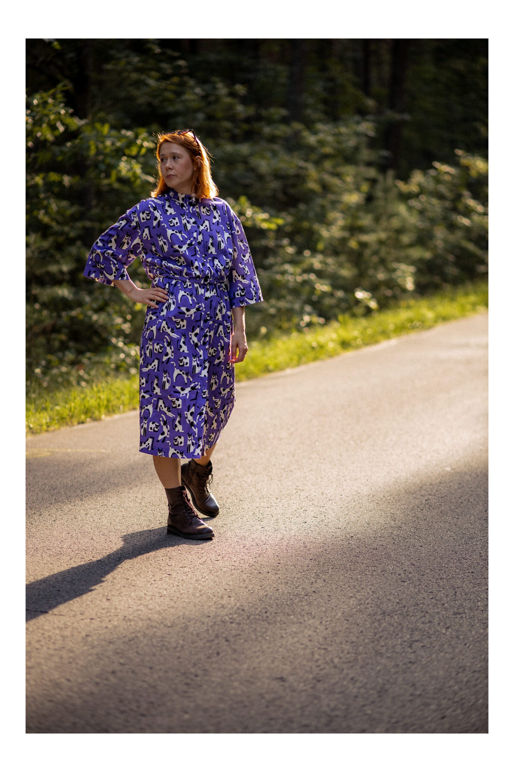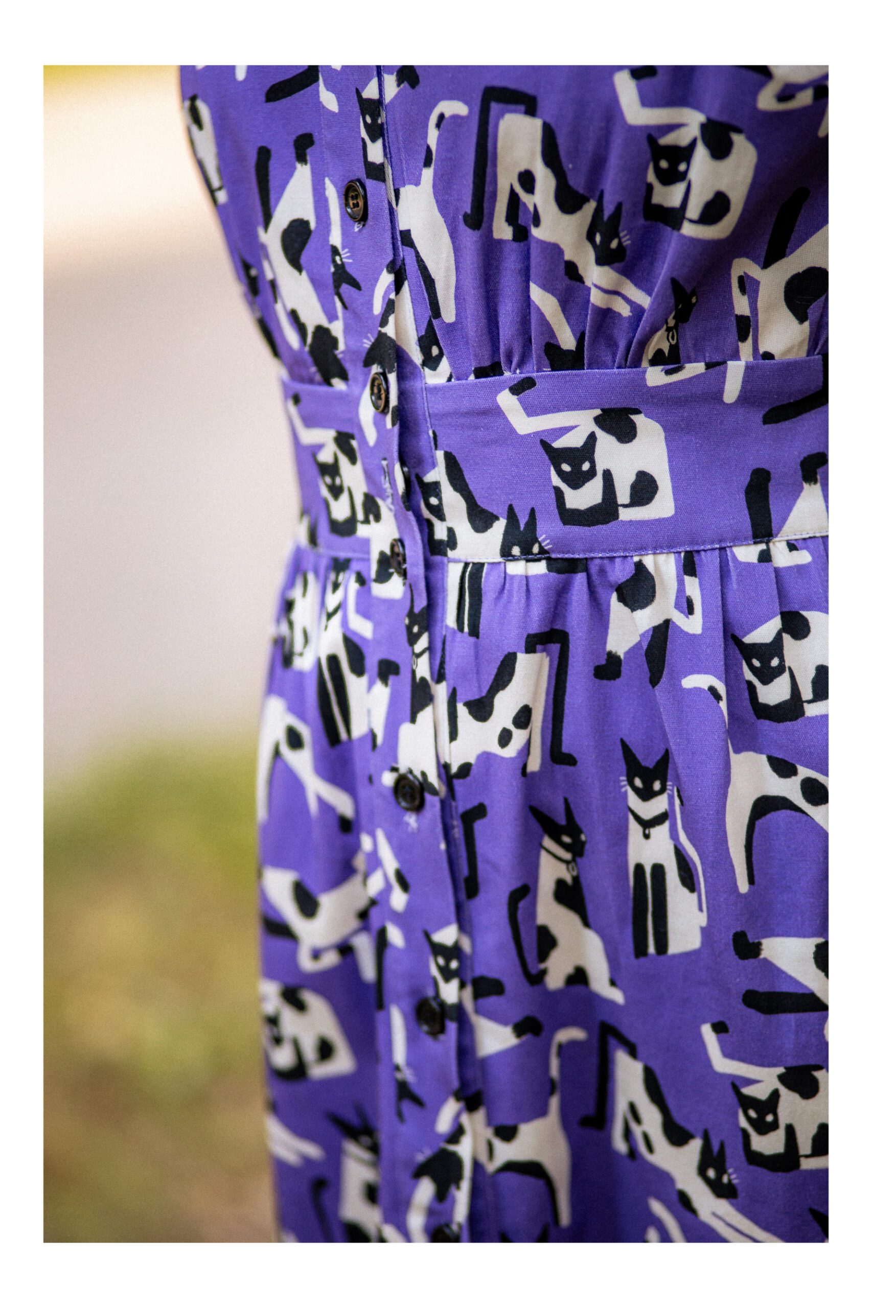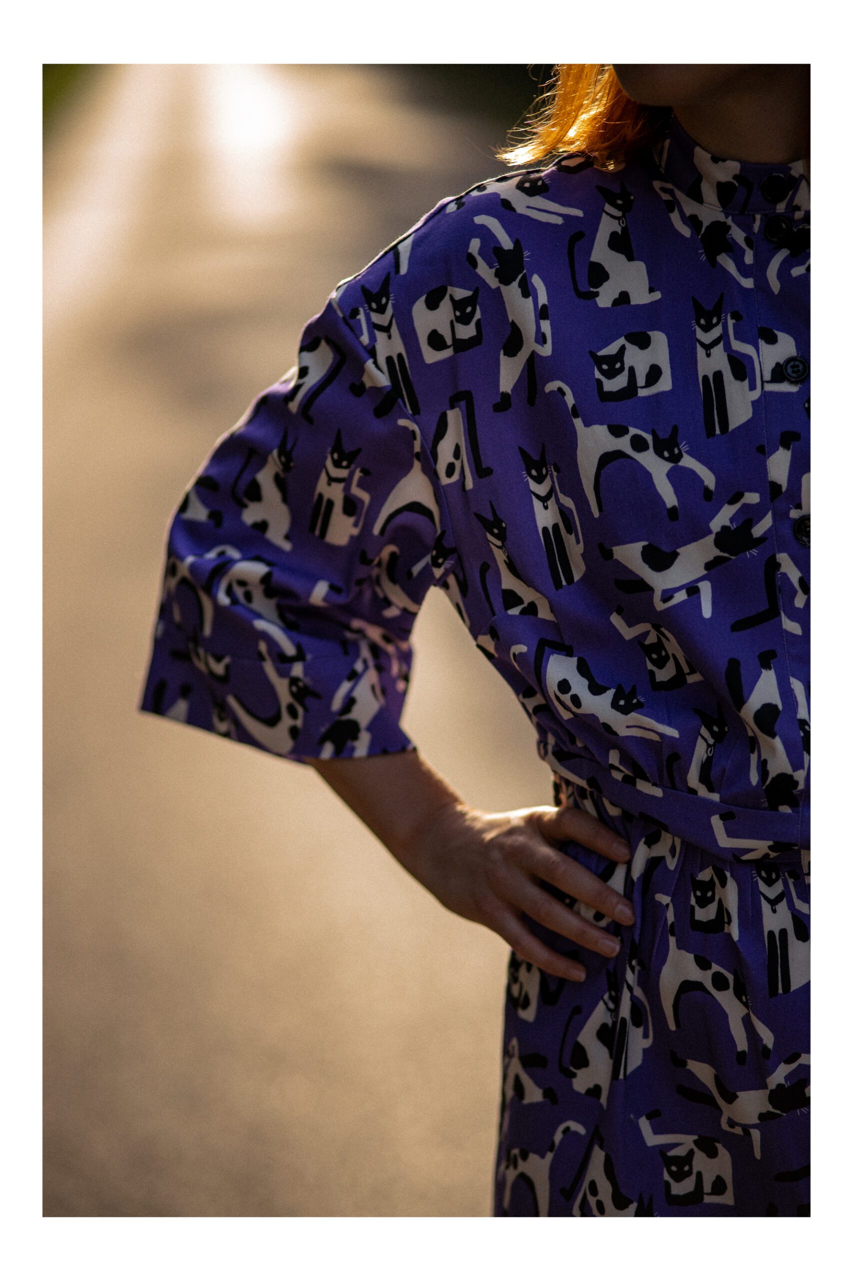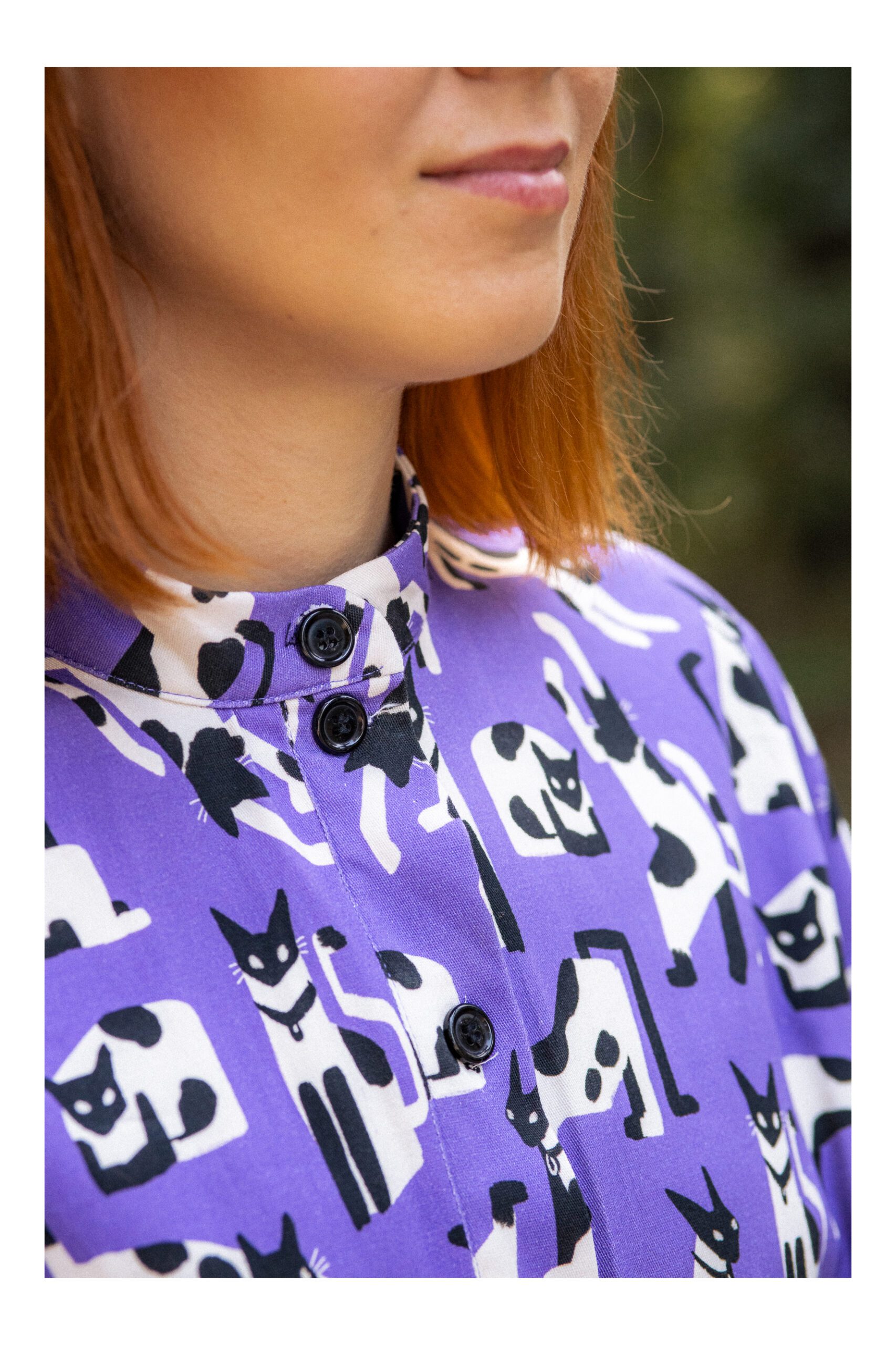 Sukienka koszulowa, uszyta z grubszej bawełny z domieszką elastanu. Zapinana na guziki, wykończona kołnierzykiem ze stójką, co dodaje sukience uroku. Długość sukienki to 7/8. Rękawy opadające, są szersze i mają długość 3/4, wykończone mankietami. W talii został wszyty pas, podkreślający takię. Sukienka idealnie nadaje się na chłodniejsze dni, do kozaków, trampek czy adidasów. Charakteru sukience dodaje zdecydowanie mocny kolor fioletu oraz wzór w czarno białe koty.