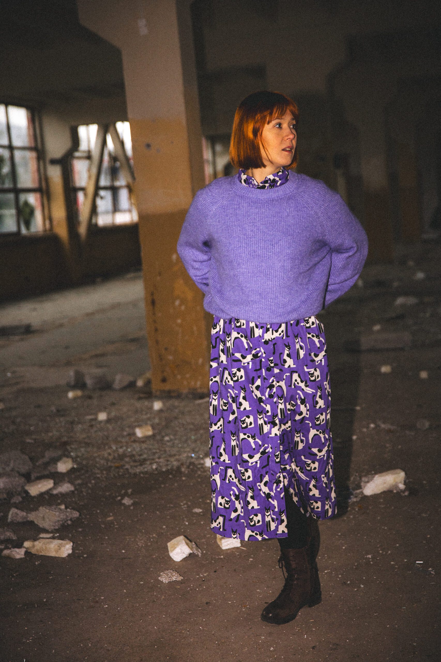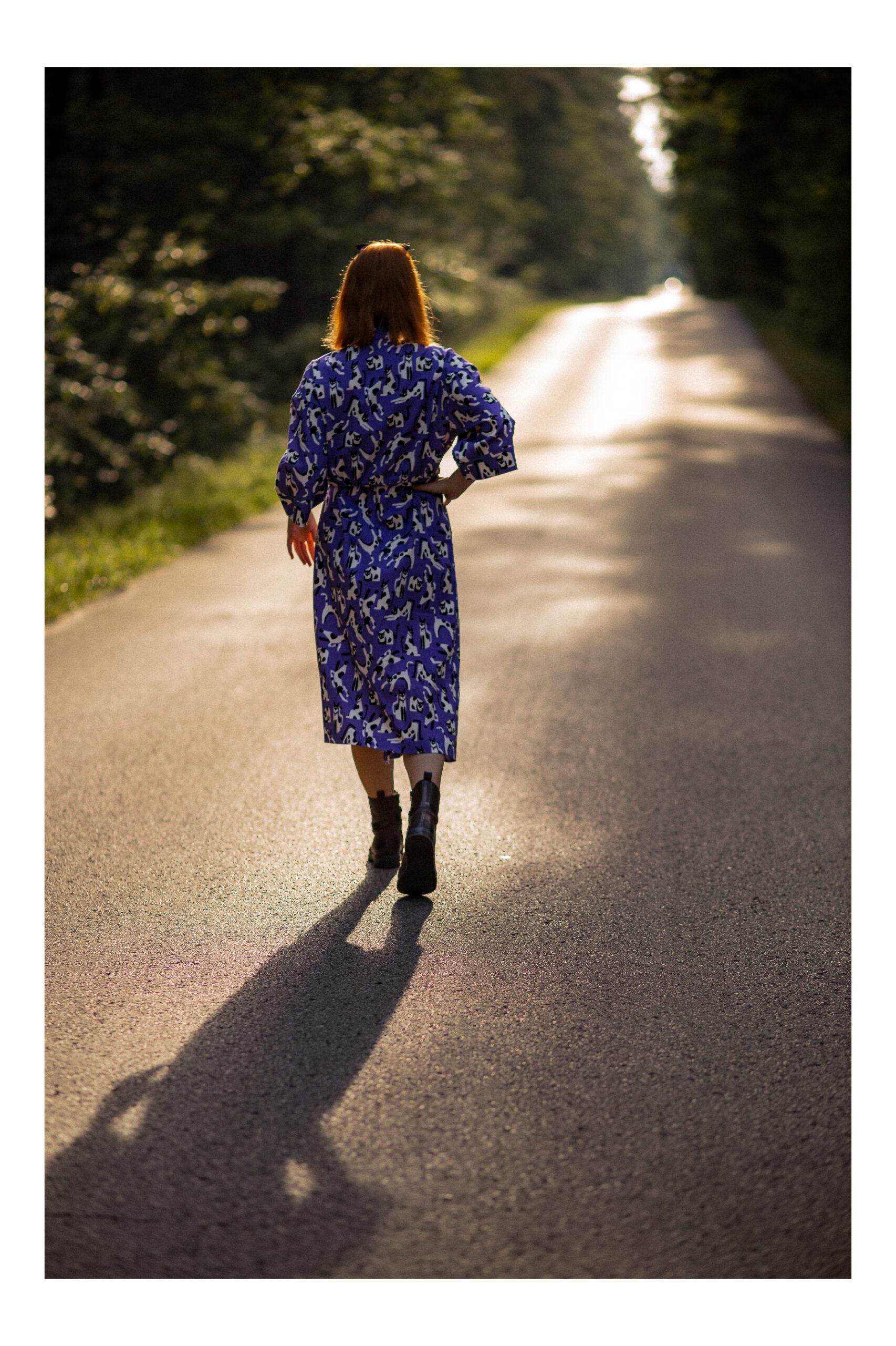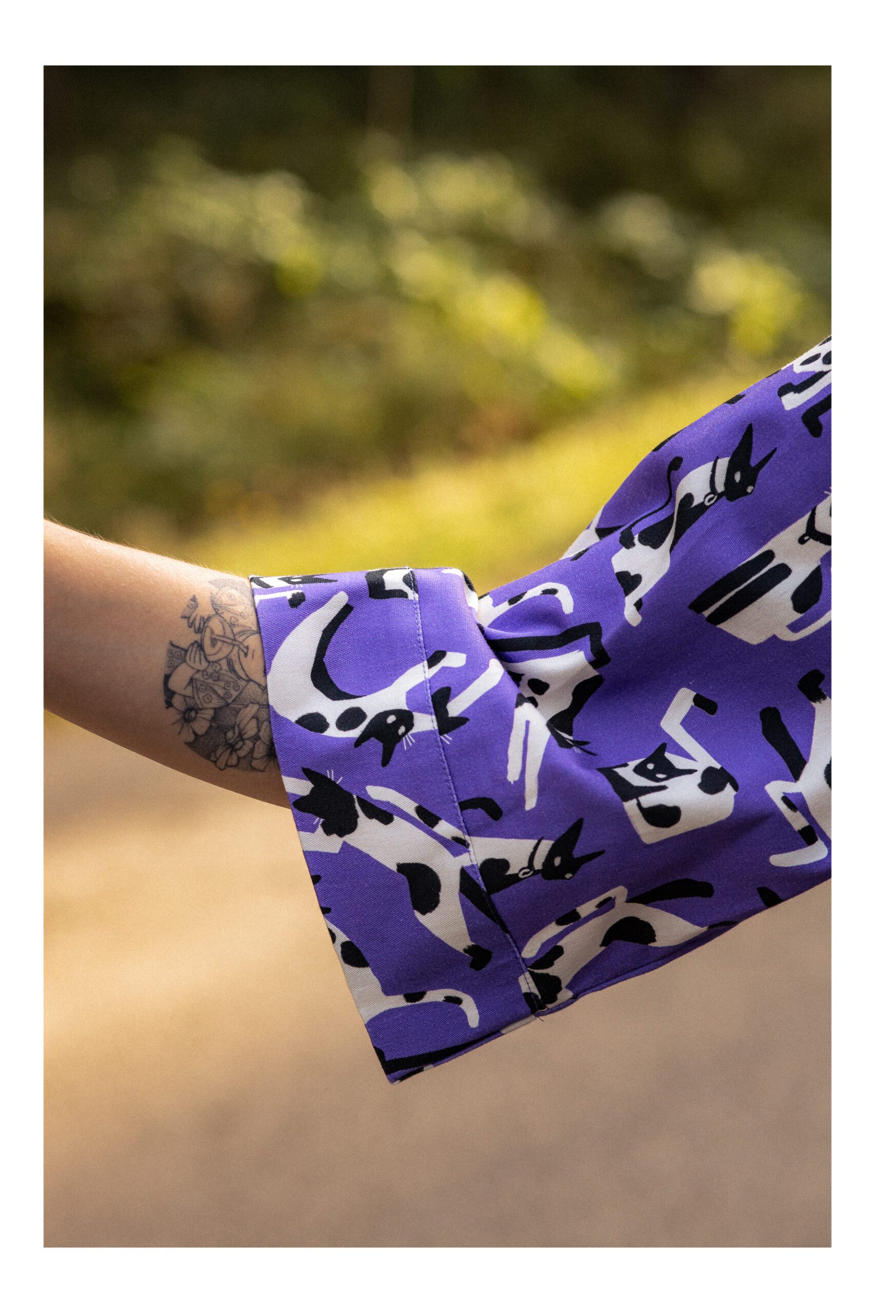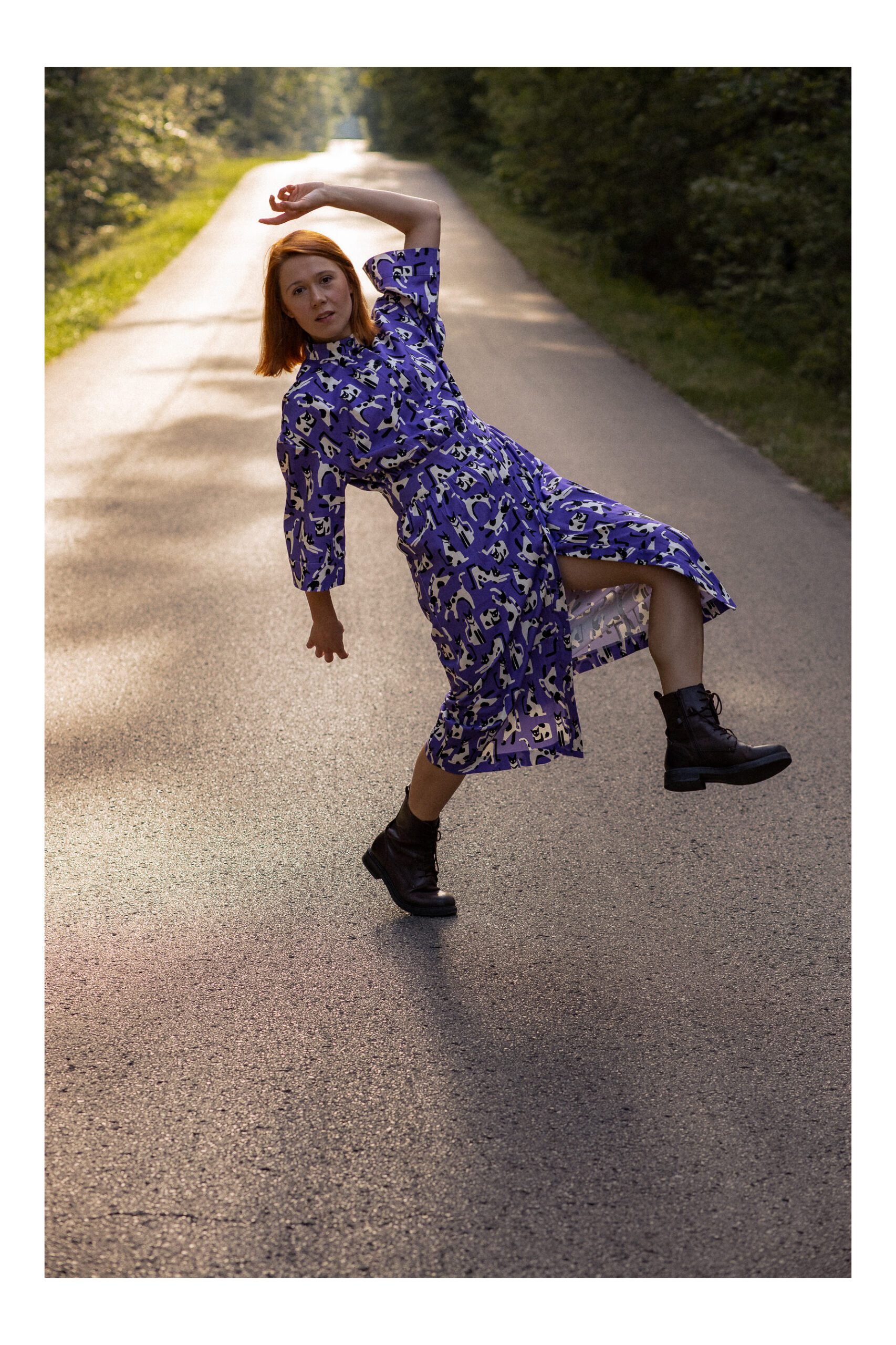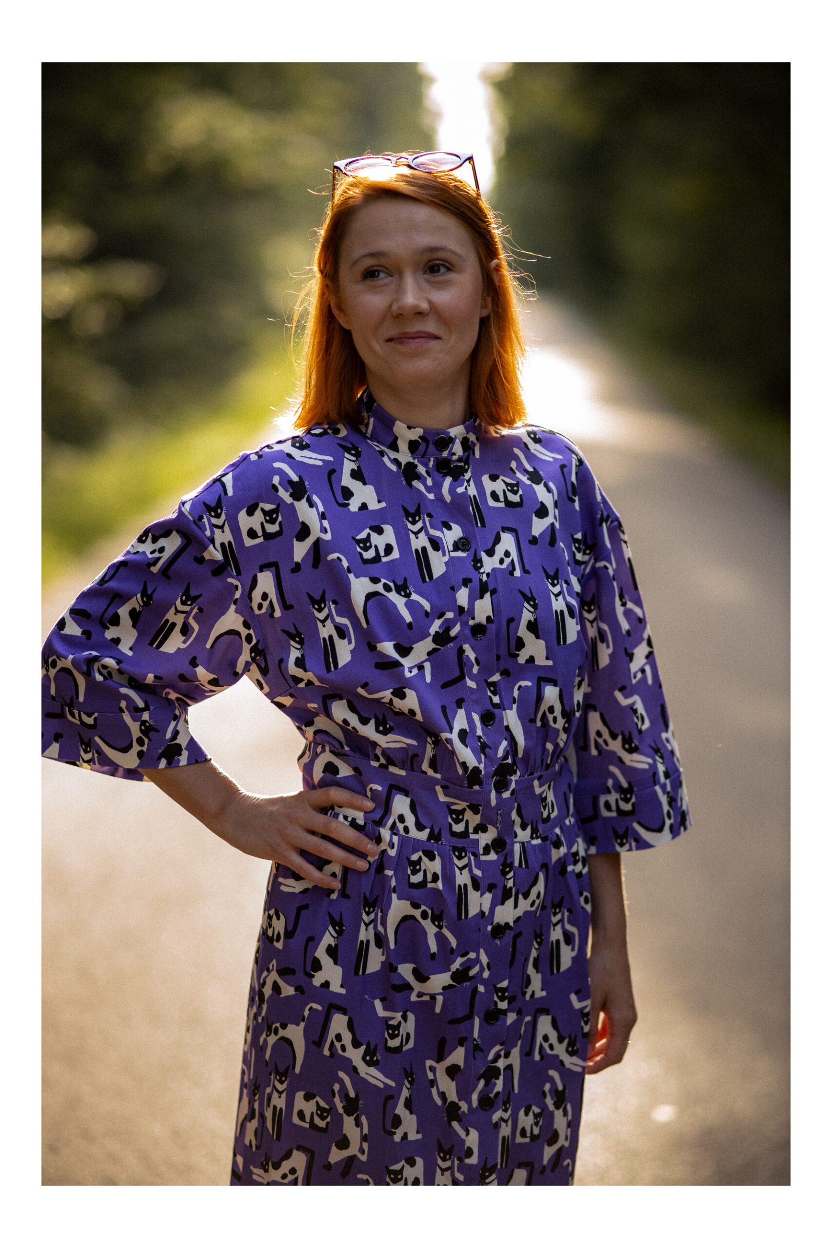Sukienka koszulowa, uszyta z grubszej bawełny z domieszką elastanu. Zapinana na guziki, wykończona kołnierzykiem ze stójką, co dodaje sukience uroku. Długość sukienki to 7/8. Rękawy opadające, są szersze i mają długość 3/4, wykończone mankietami. W talii został wszyty pas, podkreślający takię. Sukienka idealnie nadaje się na chłodniejsze dni, do kozaków, trampek czy adidasów. Charakteru sukience dodaje zdecydowanie mocny kolor fioletu oraz wzór w czarno białe koty.