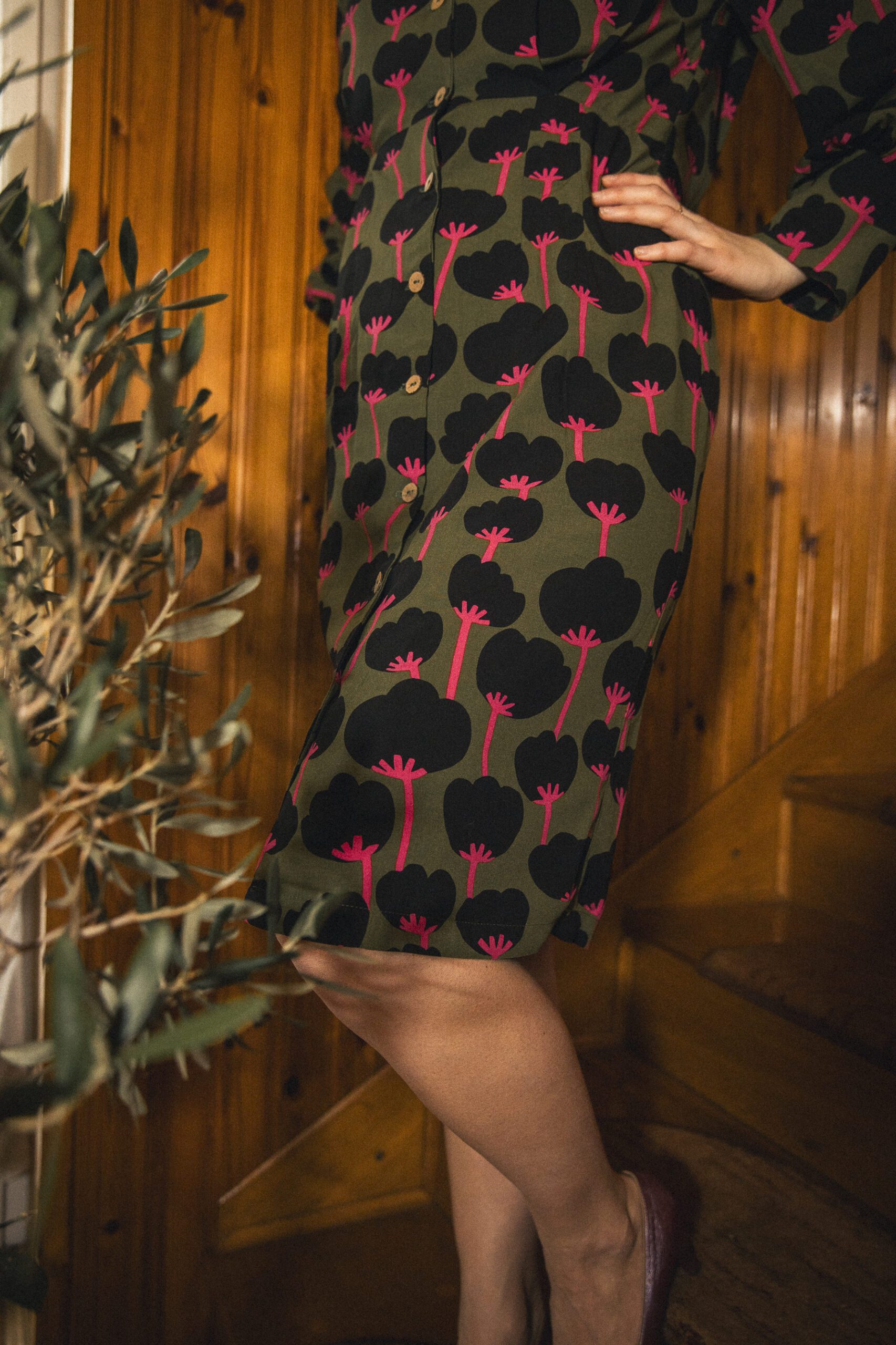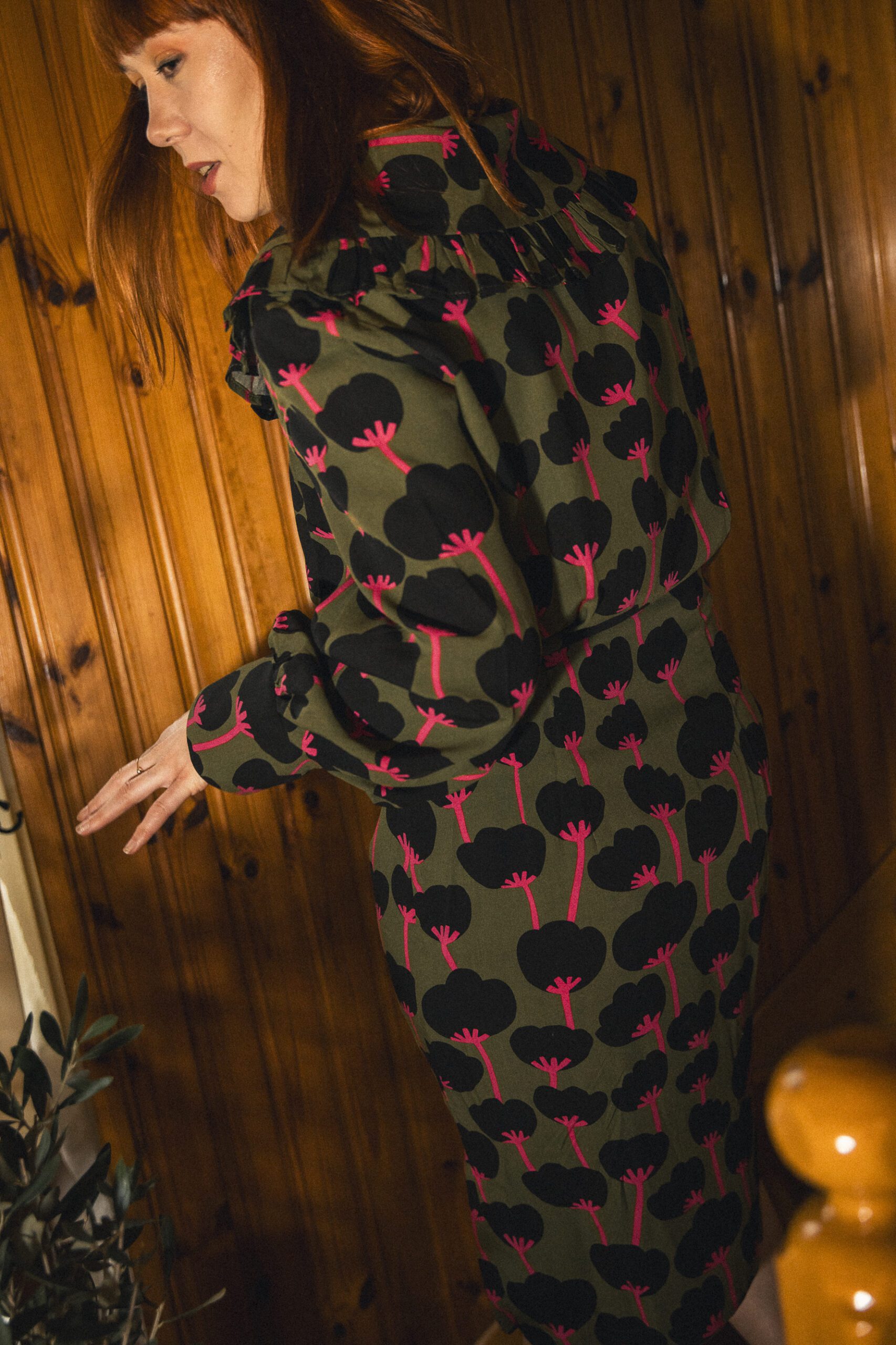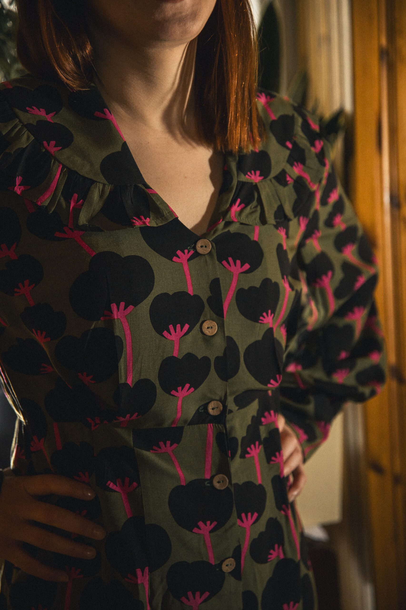 Sukienka uszyta ze zwiewnej tkaniny, zwężana od pasa w dół, co sprawia, że jest bardzo kobieca i podkreśla nasze kształty. Lekko bufiaste , długie rękawy zakończone zostały mankietem. Okrągły kołnierz wykończony jest falbanką. Sukienka doda elegancji i stylowego charakteru poprzez swój krój ale i wzór na tkaninie.