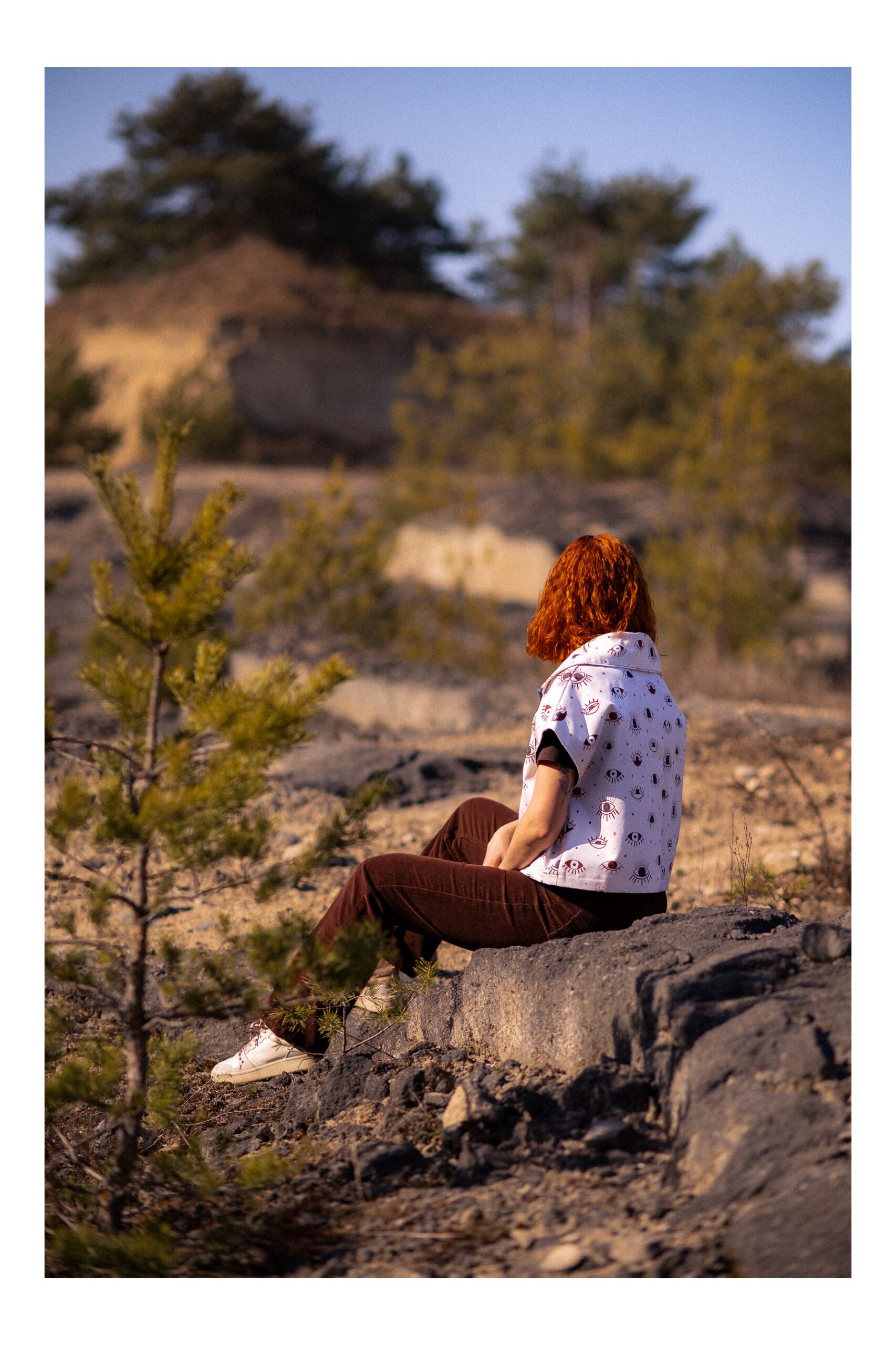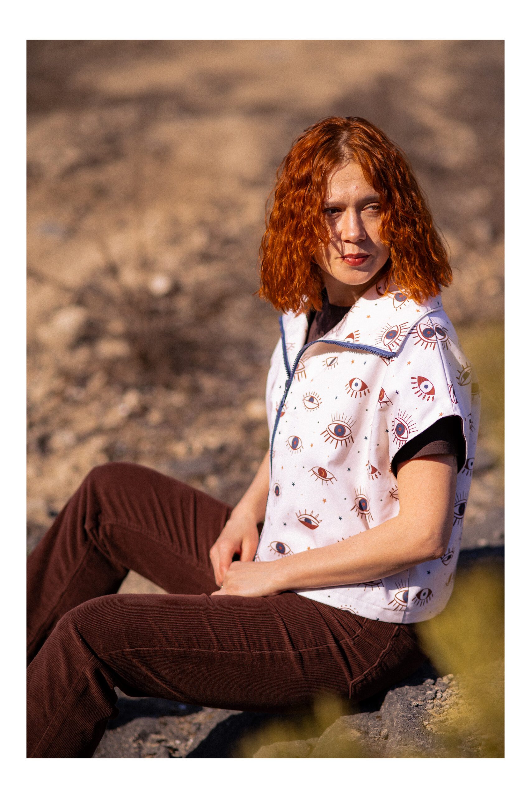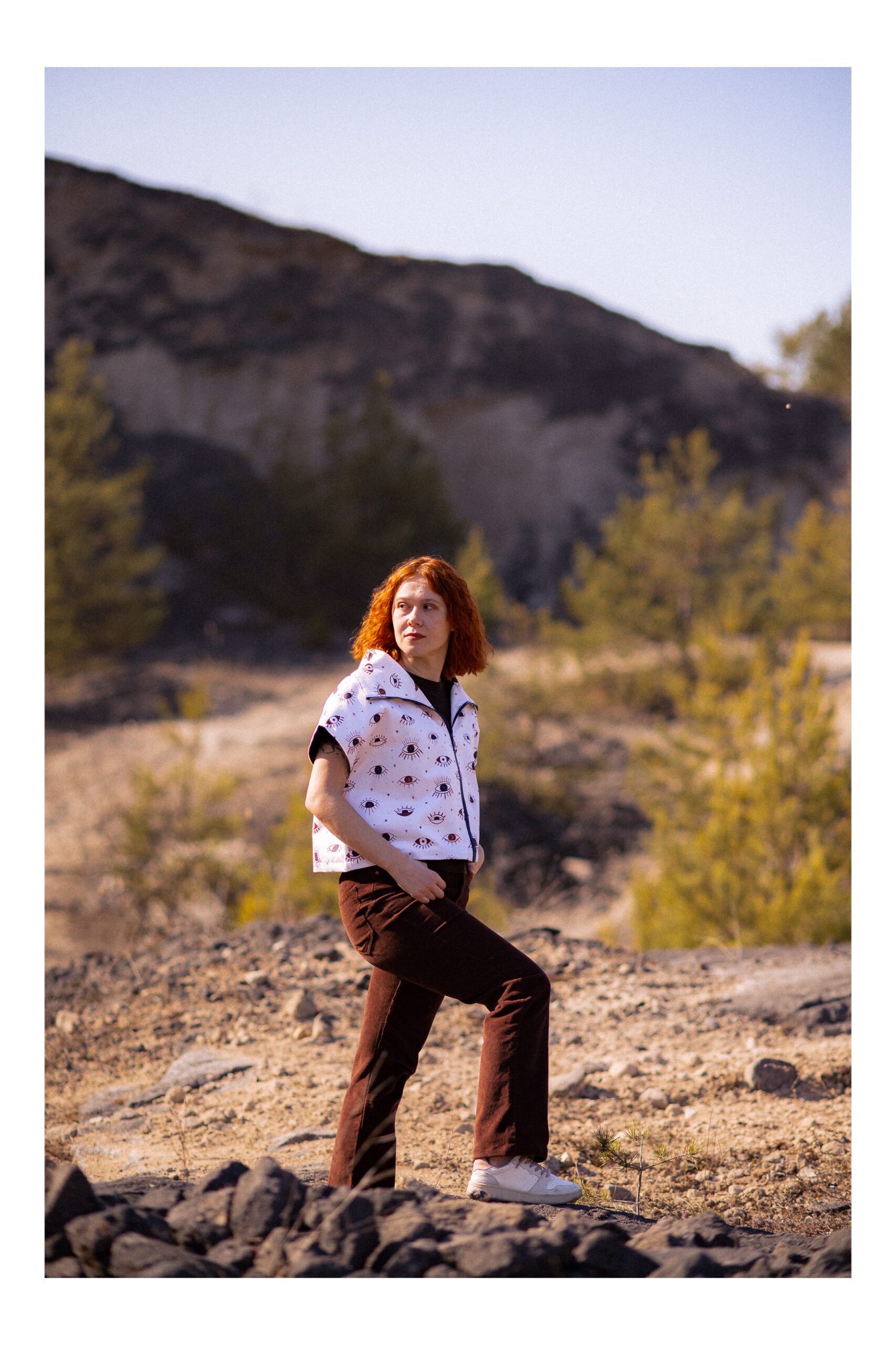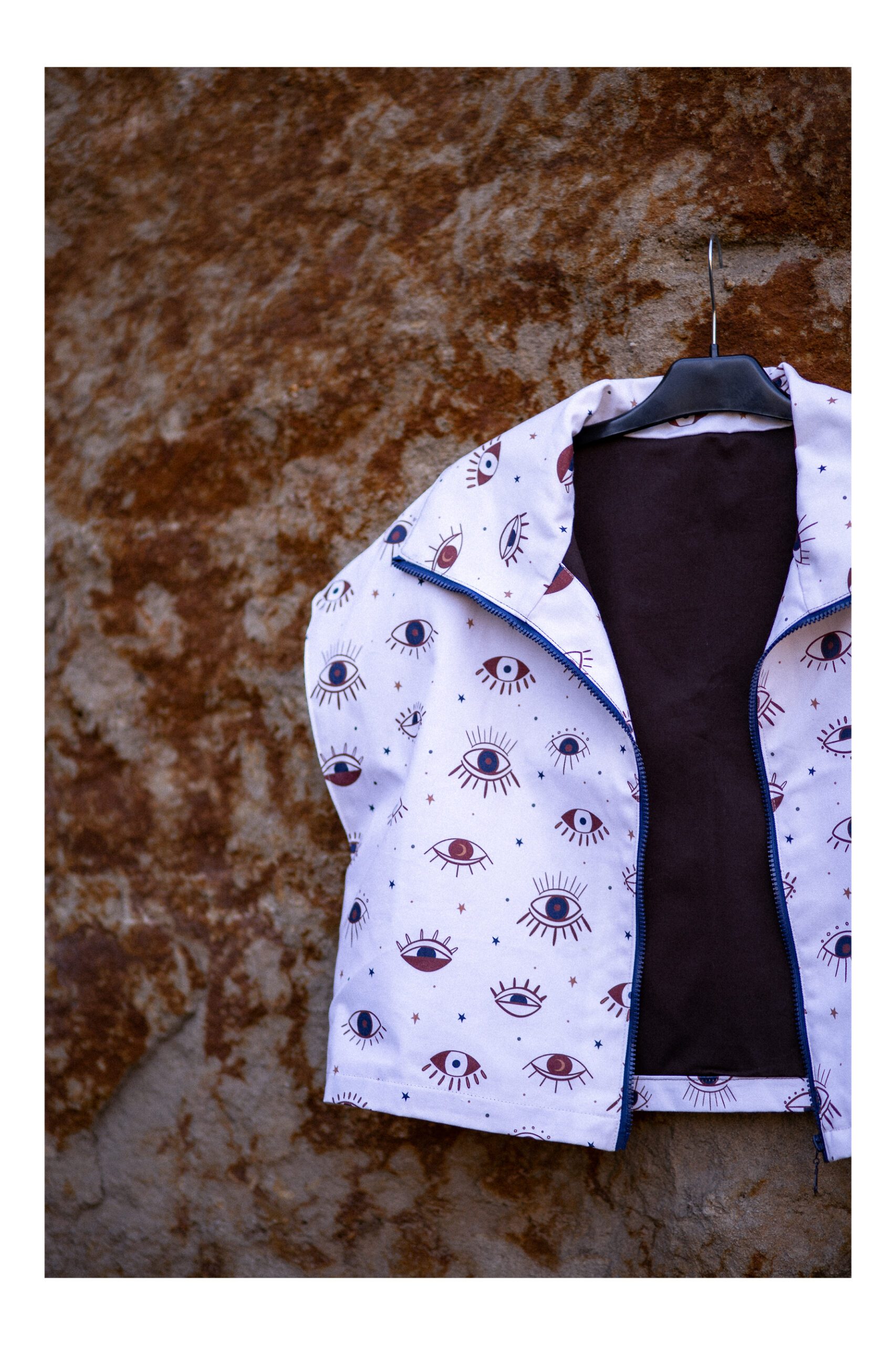 Kamizelka, która łączy wygodę z wyrazistym stylem. Krótki, lekko oversize’owy fason daje dużą swobodę ruchów. Szeroki kołnierz i zapięcie na zamek sprawia, że świetnie układa się na sylwetce i nadaje jej sportowo-casualowy charakter. Jasny materiał ozdobiony unikalnym wzorem graficznych oczu przyciąga spojrzenia i nadaje całości artystycznego charakteru. Brak rękawów sprawia, że świetnie sprawdzi się jako warstwa wierzchnia na cieplejsze dni lub jako element stylizacji „na cebulkę”.